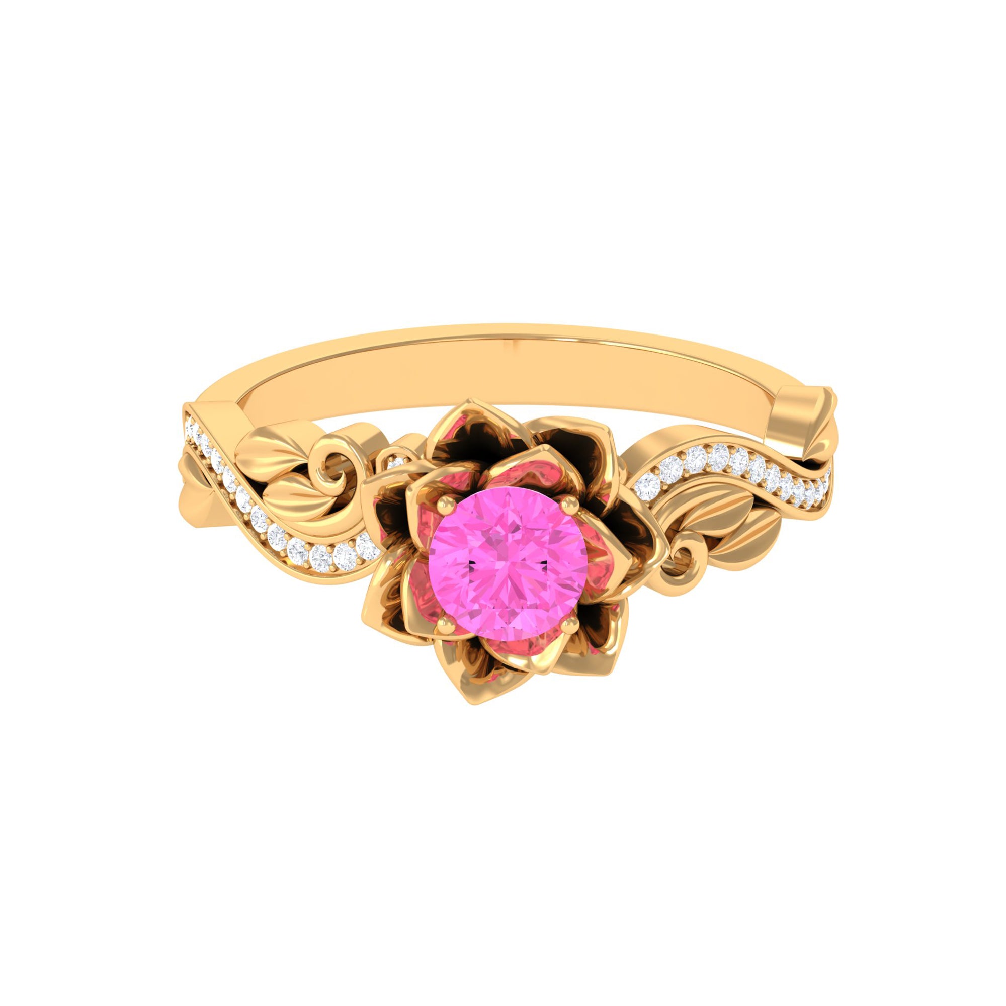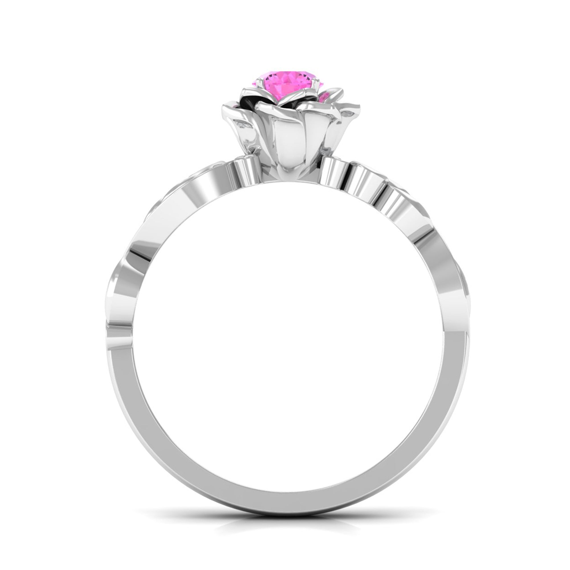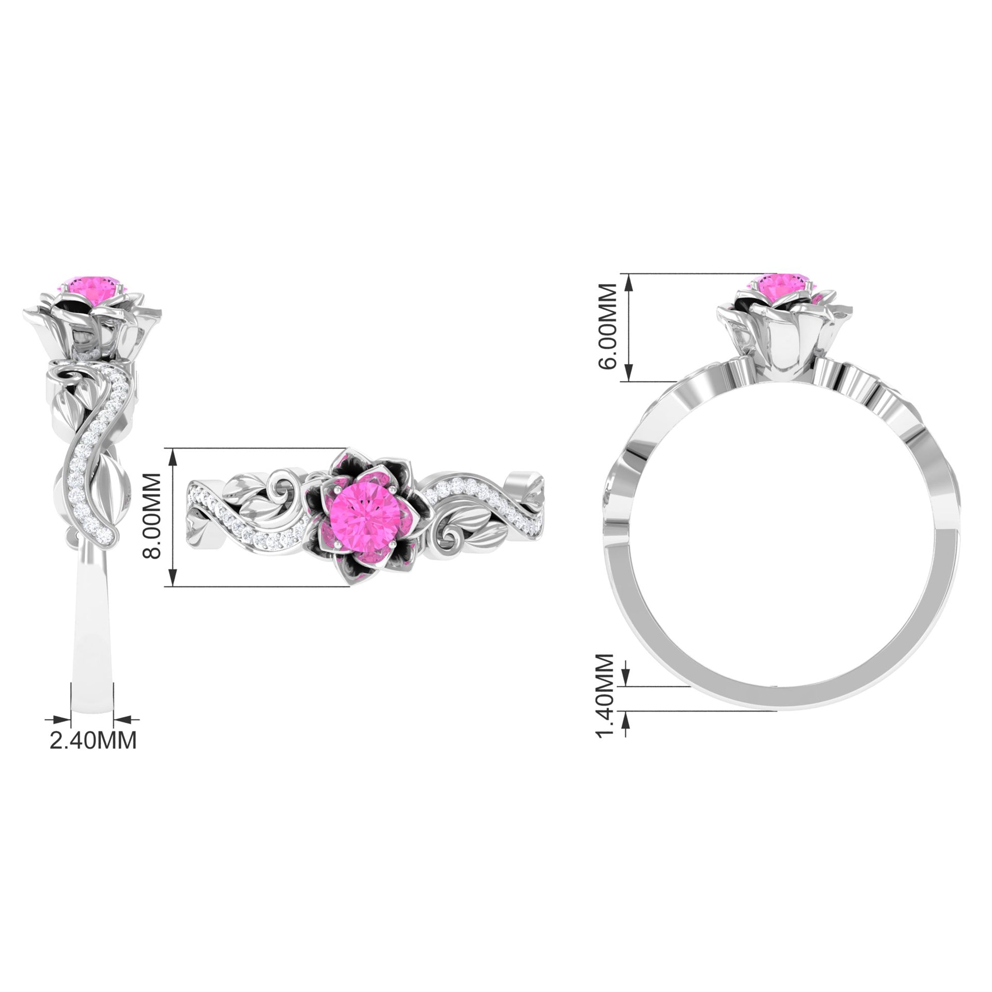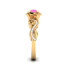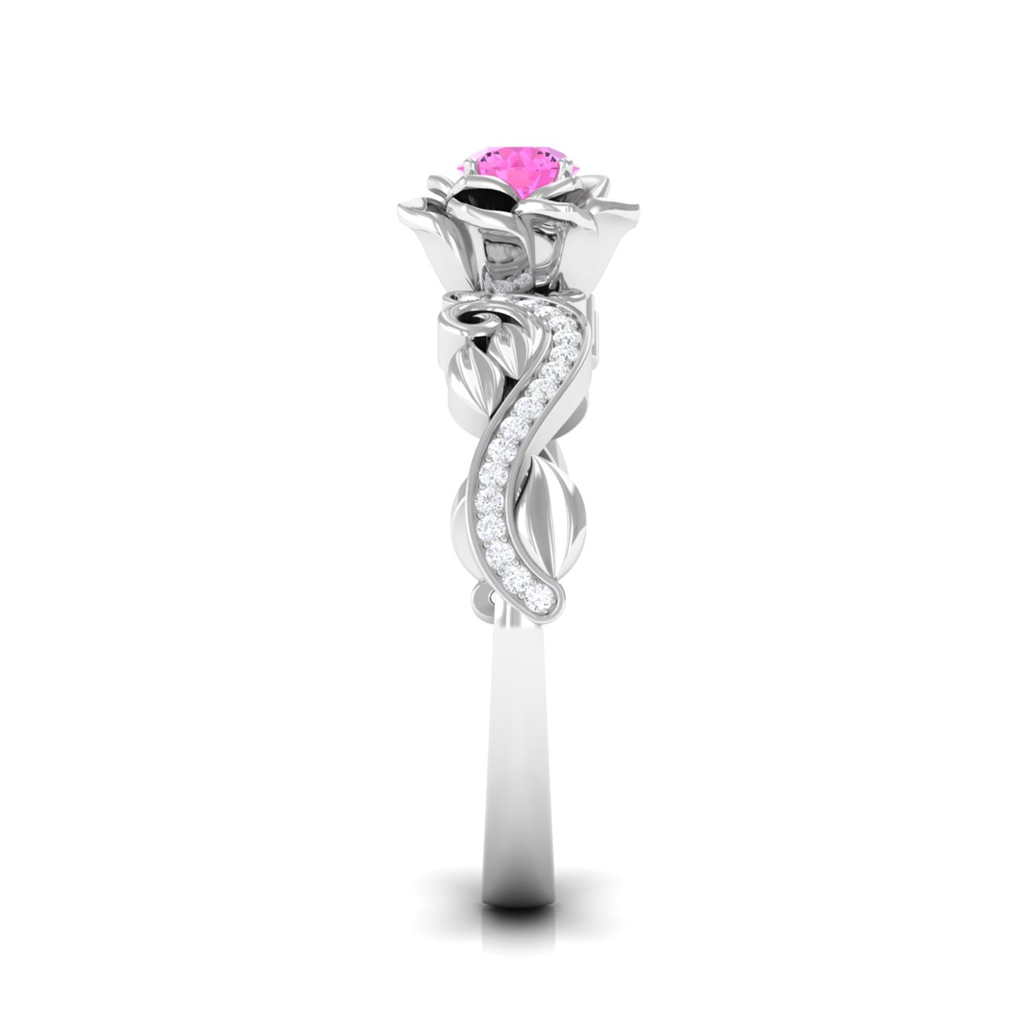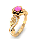 Experience the elegance of this Pink Sapphire Floral Engagement Ring. Its flower-shaped band, sparkling Diamond stones on the shank, and radiant Pink Sapphire create a glamorous and classic look. This Pink Sapphire ring is the perfect choice for the fashion-forward woman.