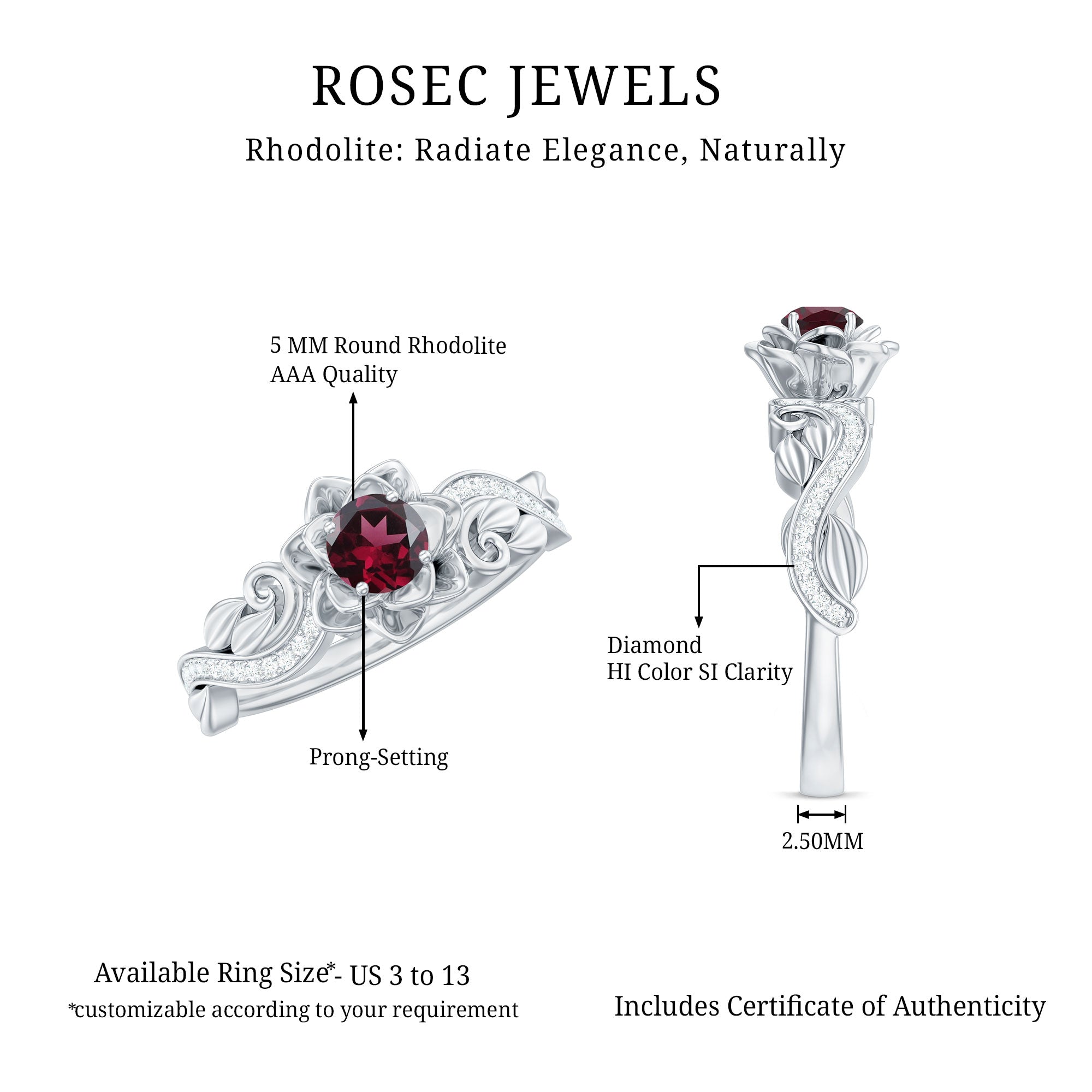 A timeless and elegant 5mm round Rhodolite solitaire ring in a prong setting, accented with a Diamond on a flower design. With a total weight of 3/4 carat, this Rhodolite Flower Ring is made of AAA quality materials and certified for quality. A unique choice for a loved one who has captured your heart.