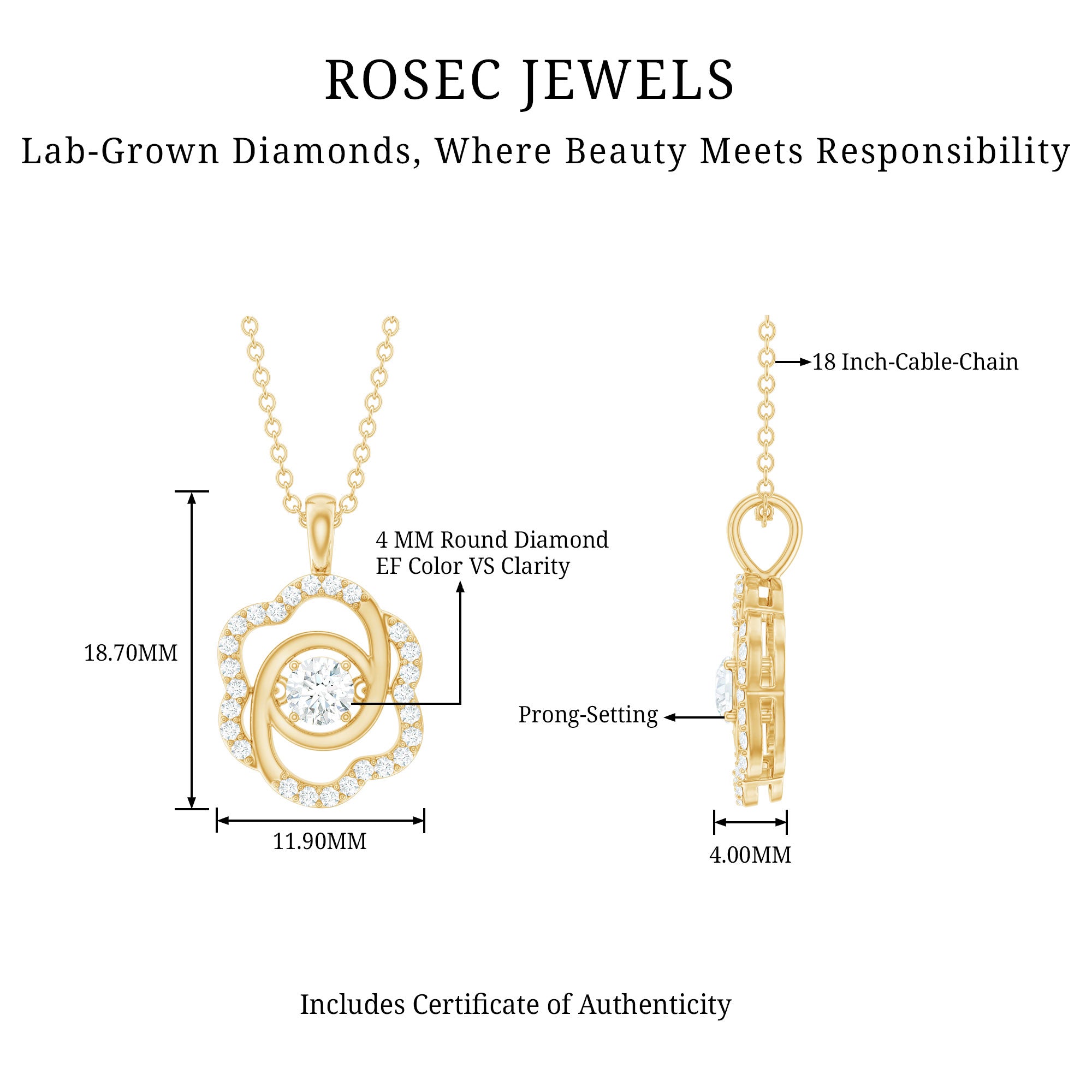 Flourish in elegance with our Flower Pendant Necklace featuring a 4 mm Round Shape Diamond (Lab Grown) at the center set in a safe prong setting. The delicately crafted floral motif is aptivating and accentuated by dainty gemstones. Elevate your style with this mesmerizing Ef-Vs Quality Diamond Pendant Necklace (Synthetic) brought to you by Rosec Jewels, committed to merging stunning aesthetics with ethical practices. Also, this Diamond Floral Necklace can be your lady loves in-budget birthstone pendant as a diamond is an April Birthstone. Our jewelry comes in a premium box that can later be used to store the jewelry when not in use.