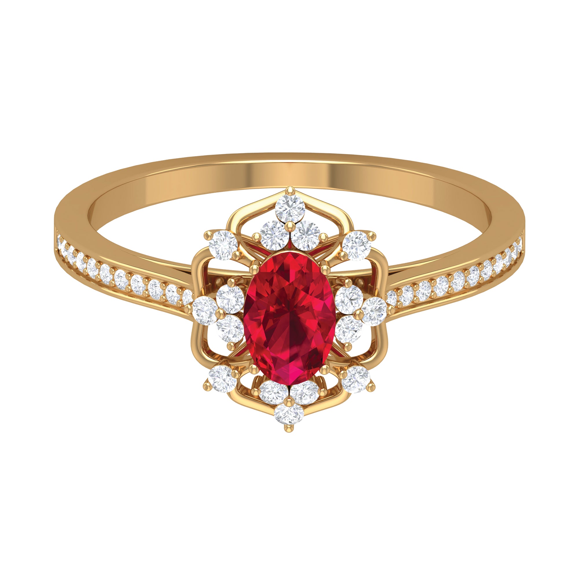 Feel the Vintage Vibes with our Vintage Inspired Ruby Engagement Ring. It is embellished with Oval Cut Ruby as Centre Stone in Four Prong Setting with Diamond Accent. This Ruby and Diamond Engagement Ring is a stunning jewelry, which she will cherish her whole life.