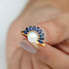 Half Flower Engagement Ring is engraved with Solitaire Fresh Water Pearl in the center with Marquise Shape Blue Sapphire in the prong setting makes lovely floral. This gorgeous accessory for parties and weddings.