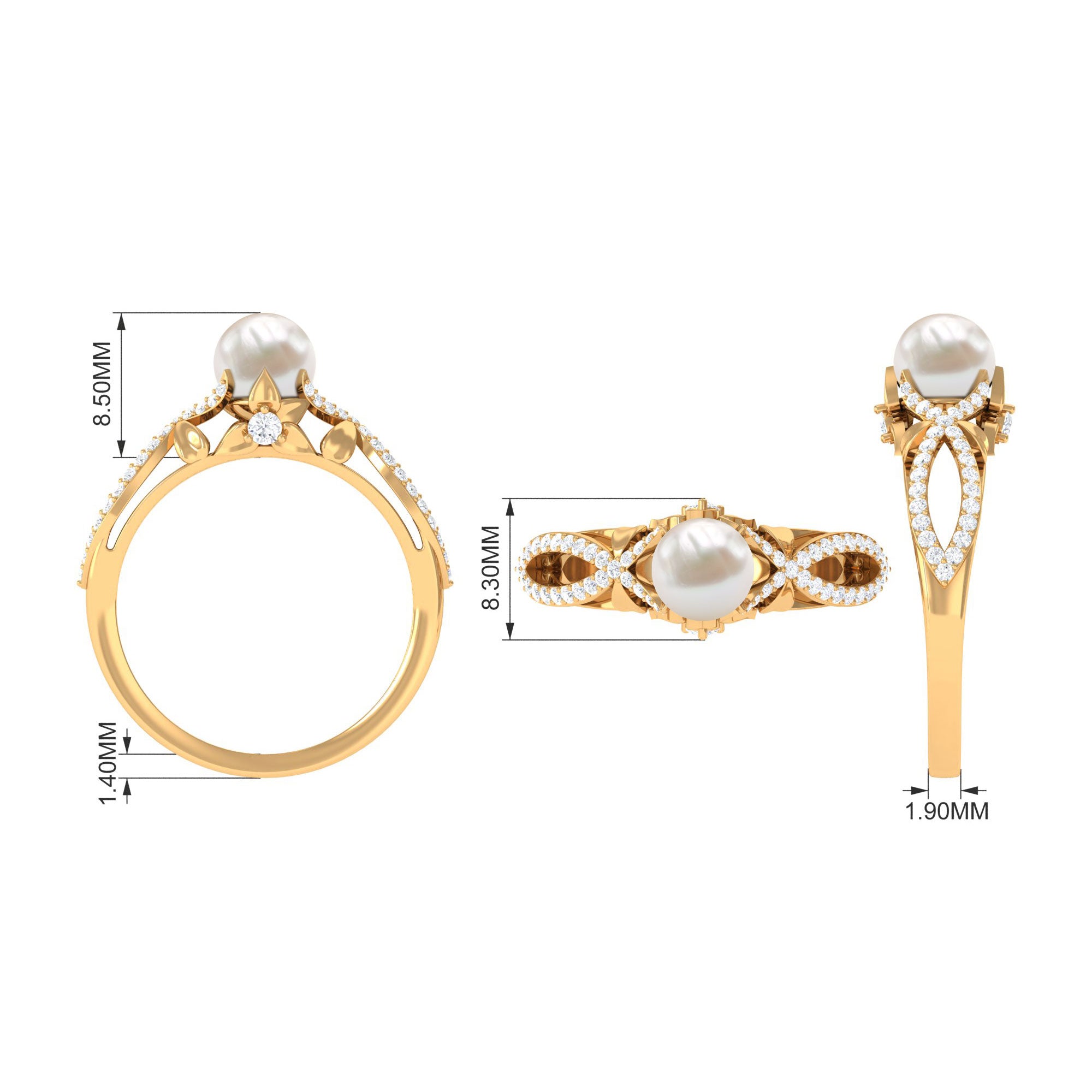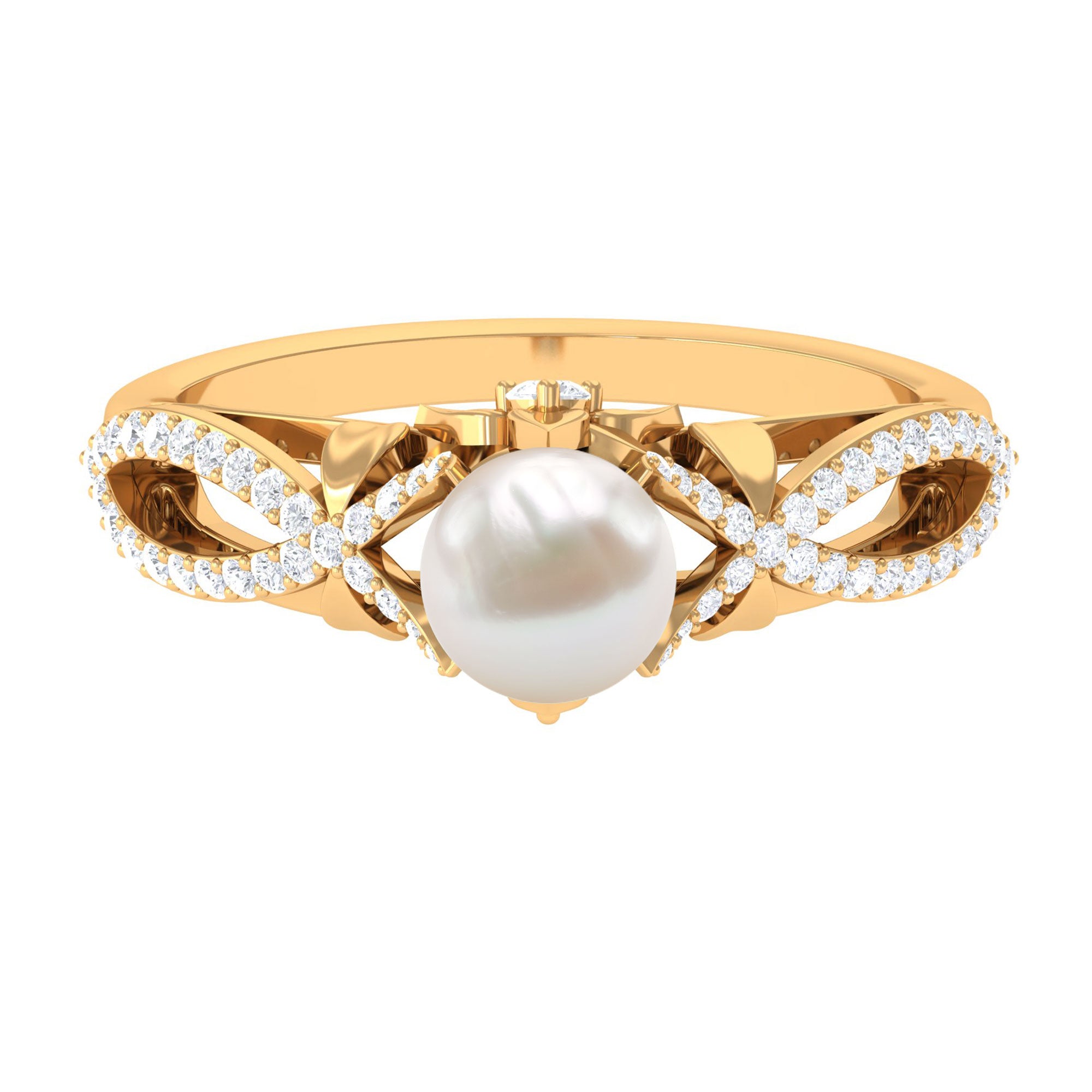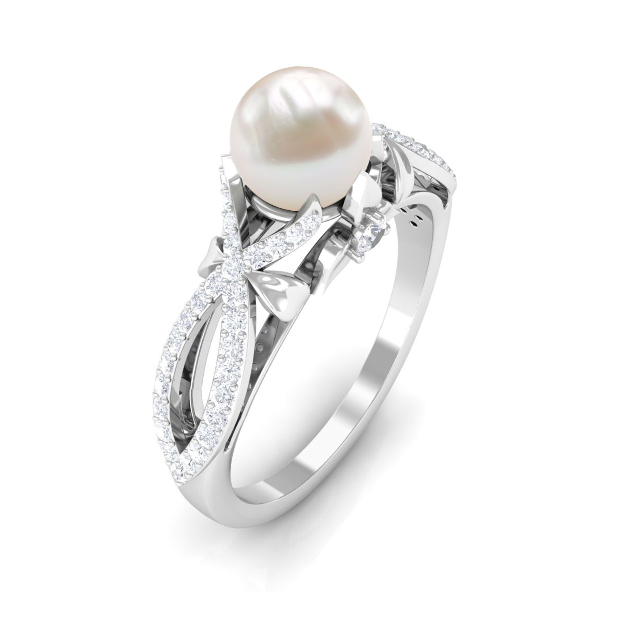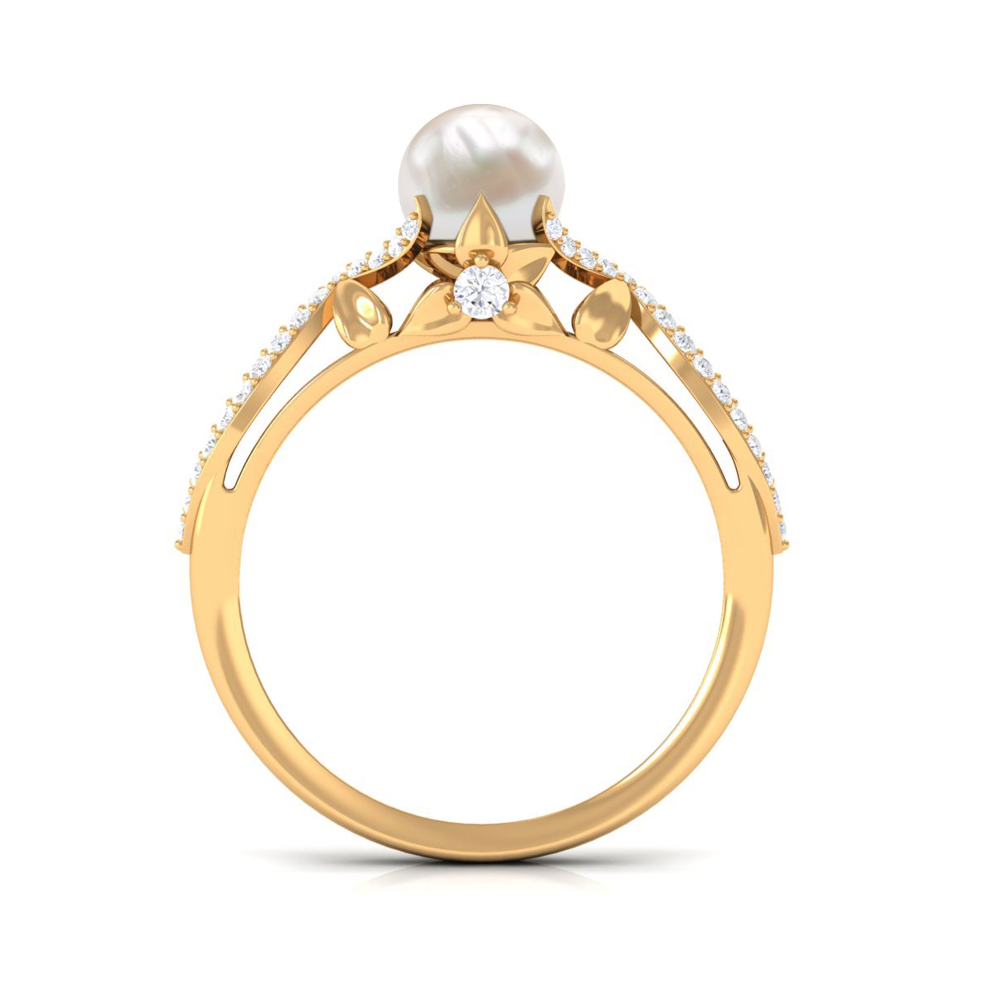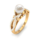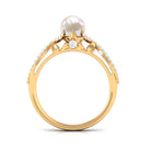 Sparkle effortlessly at every gathering with this Freshwater Pearl and Diamond Ring. It is a Gold Crossover Ring adorned with Round Shape Freshwater White Pearl as main Stone with Surprise Diamond in Gold Petal Design. This Pearl Engagement Ring with Diamond Accent is crafted in Gold.