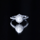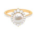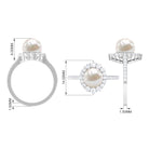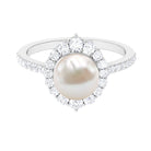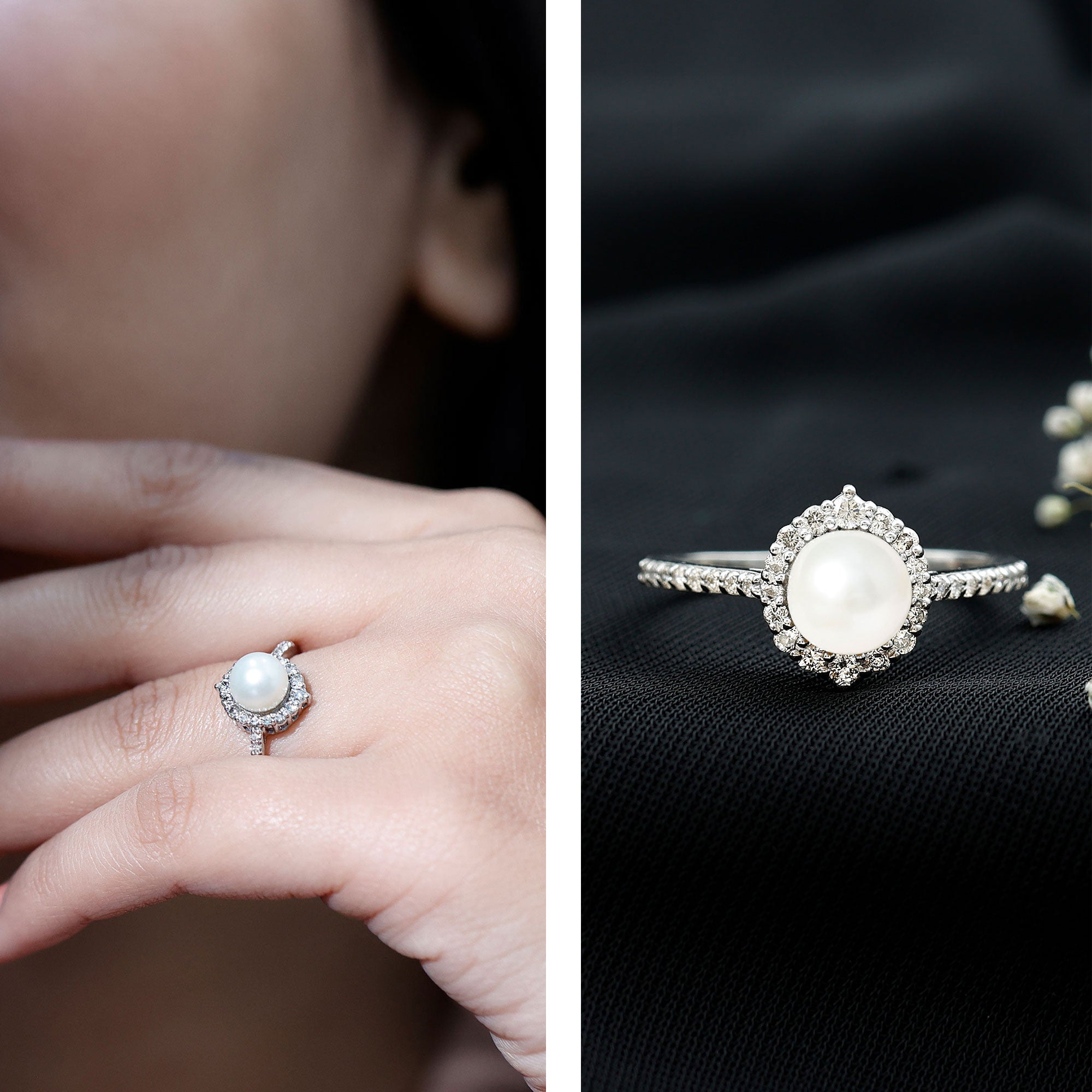The littering Halo Engagement Ring features delicate Prong Set Diamond Halo that encircle the center Round Shape Freshwater Pearl with side stone on shank. The Classic Design makes this ring light and feminine for a truly special look. Adorn yourself with our perfect Freshwater White Pearl Engagement Ring on your big day.