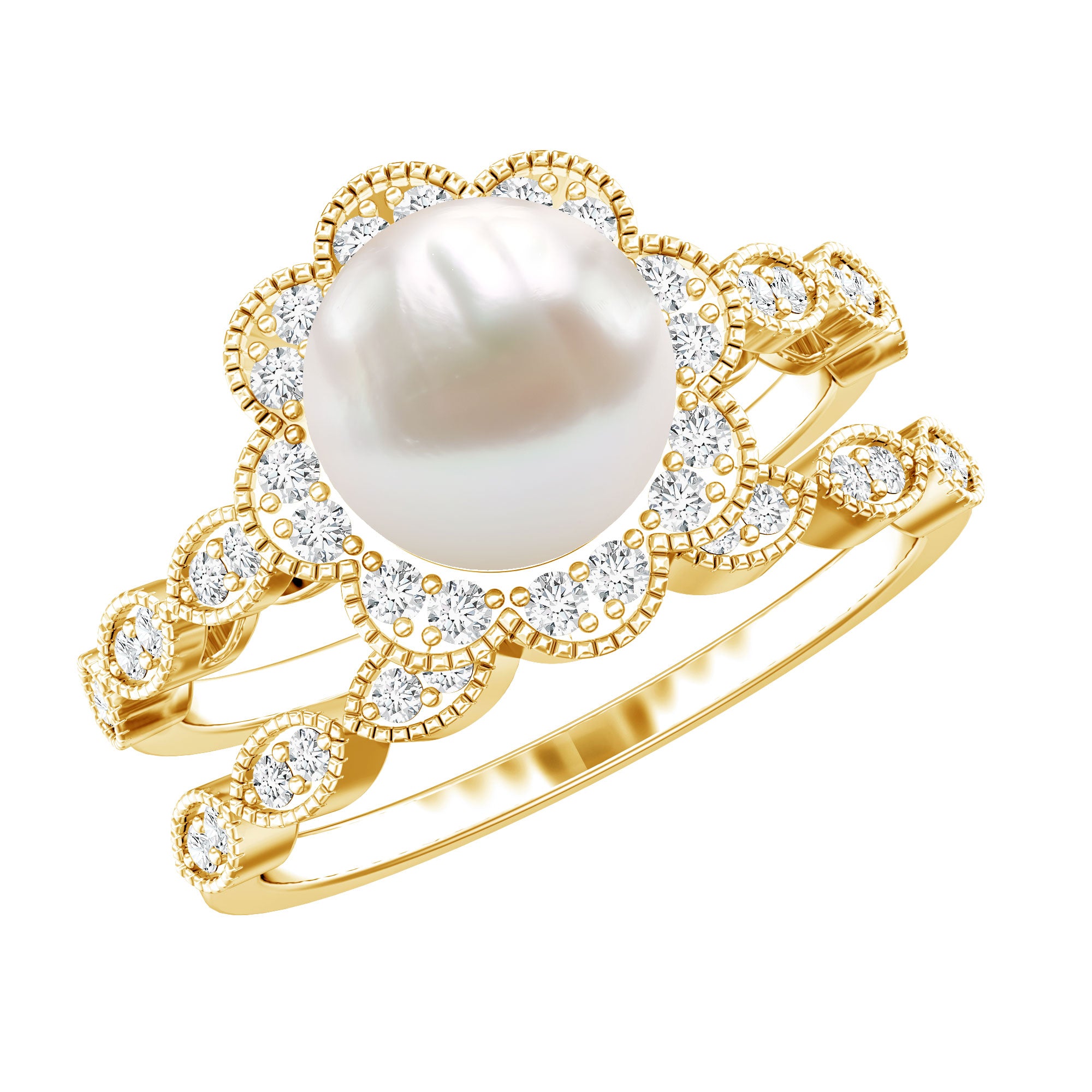 Freshwater Pearl and Diamond Wedding Ring Set