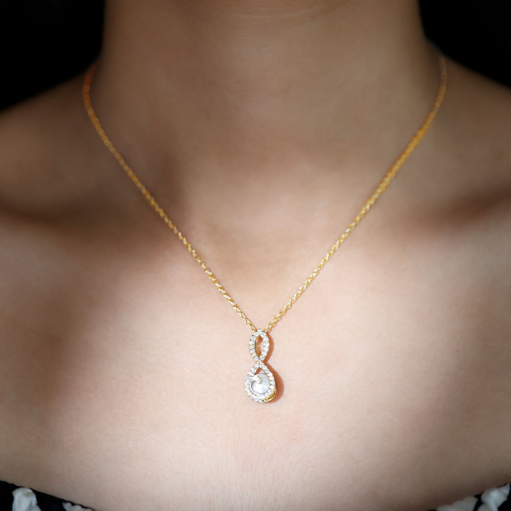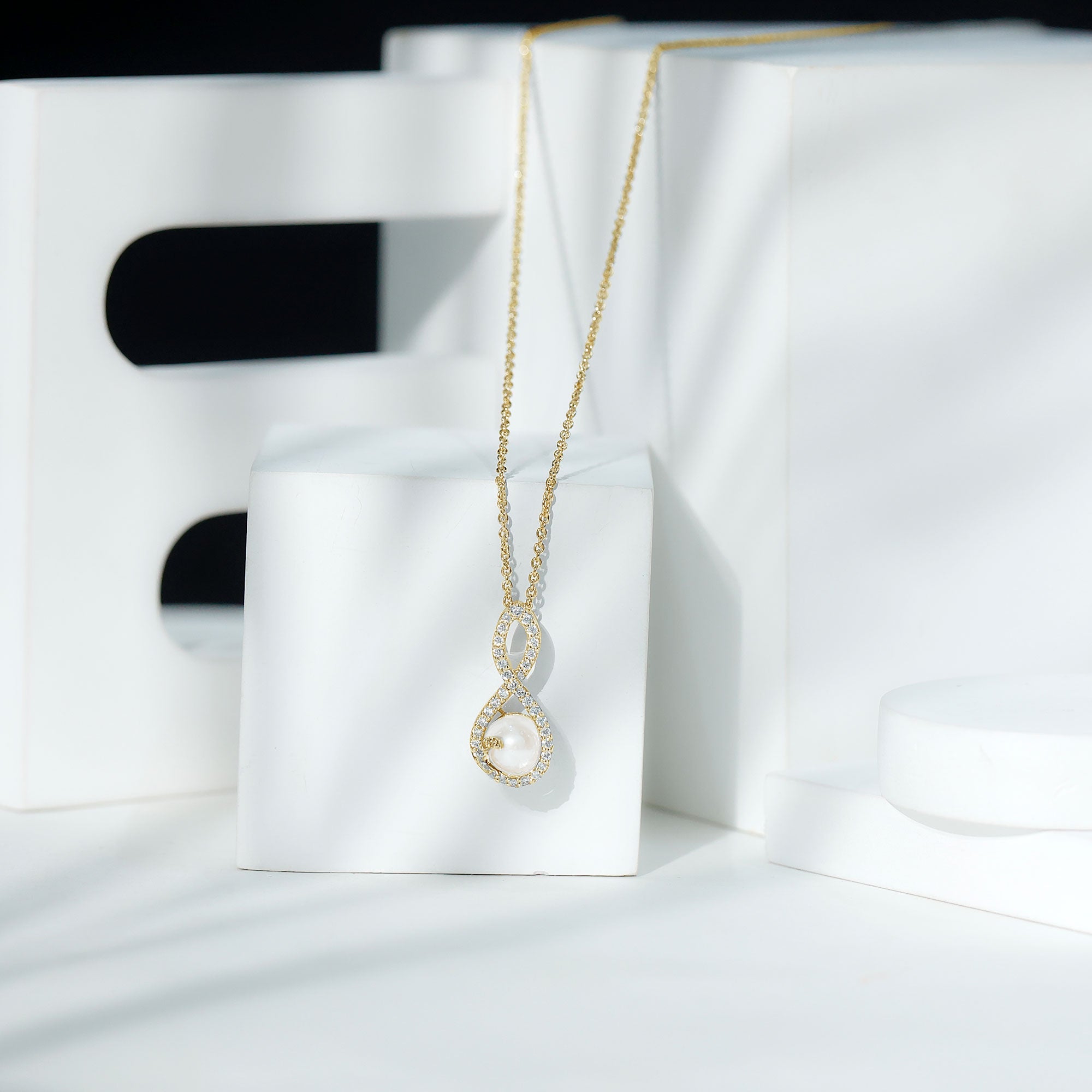 Your mother will treasure this exquisite Freshwater Pearl Pendant for a lifetime. Curated with an 8 MM Round shaped Freshwater Pearl set in the center, while the Moissanite gems are stunningly secured in surface prong setting over the infinity symbol, adding to the charm of the jewelry. The Infinity Pendant Necklace is expertly crafted from a AAA quality freshwater pearl and D-VS1 quality moissanites, creating a captivating and enchanting appeal. Give this Pearl Dangle Necklace to your mother as a heartfelt expression of your love and care. Whether marking a birthday, anniversary, or meaningful milestone, this Pearl Infinity Necklace serves as a heartfelt reminder of memories, devotion, and unbreakable bonds. Presented in a signature jewelry box and accompanied by a gemstone certificate, this Freshwater Cultured Pearl Necklace is ready to gift or cherish, offering beauty, sentiment, and timeless charm in one elegant piece.