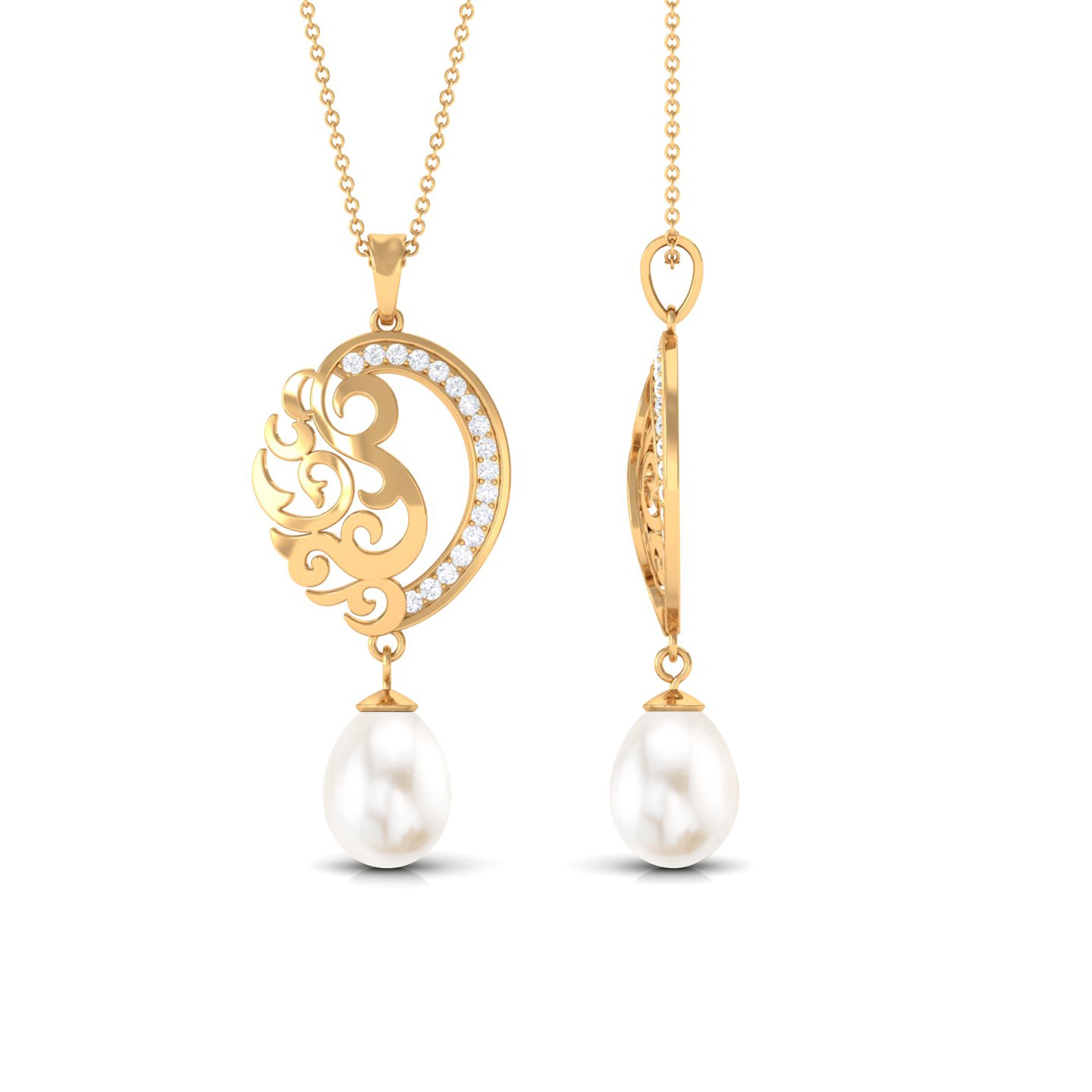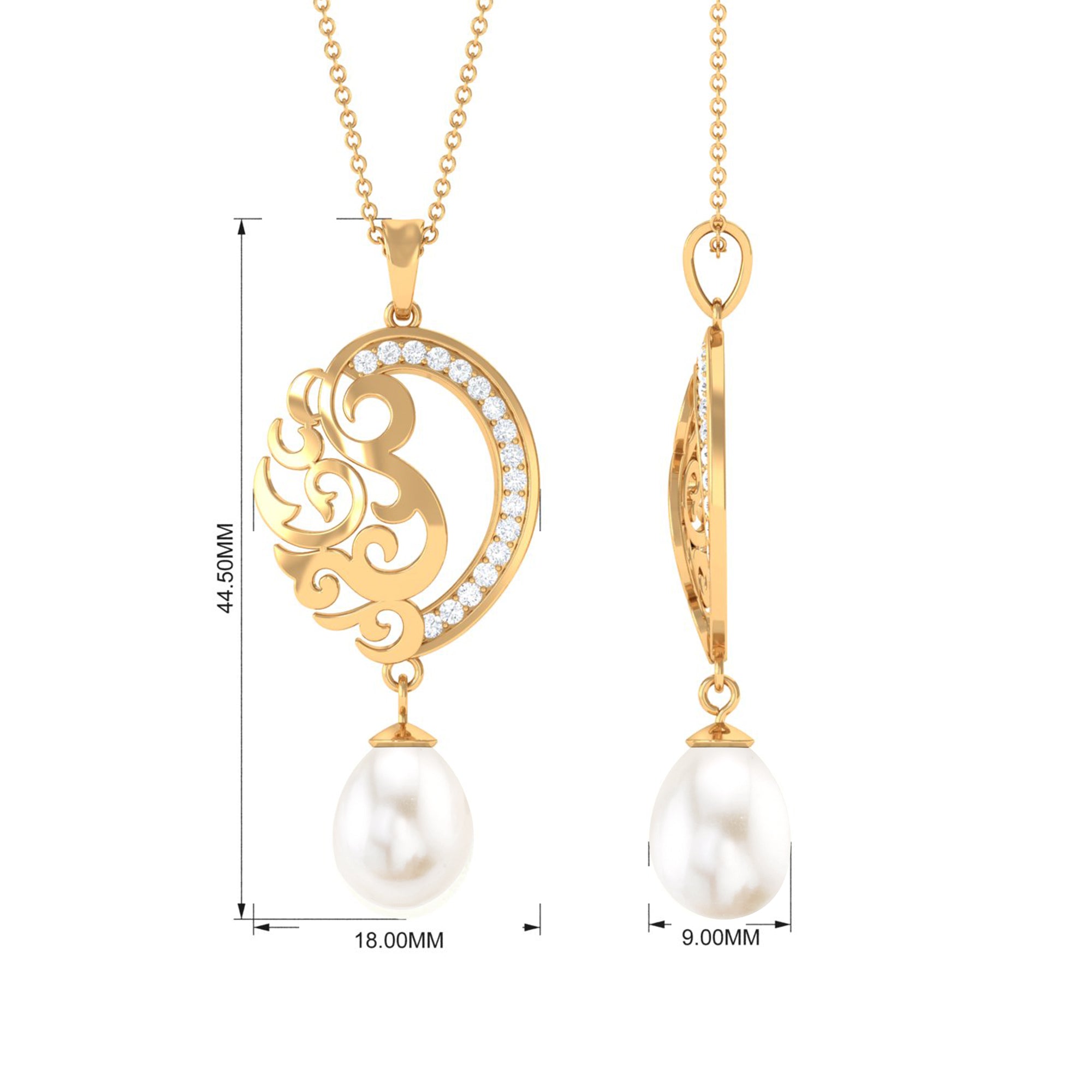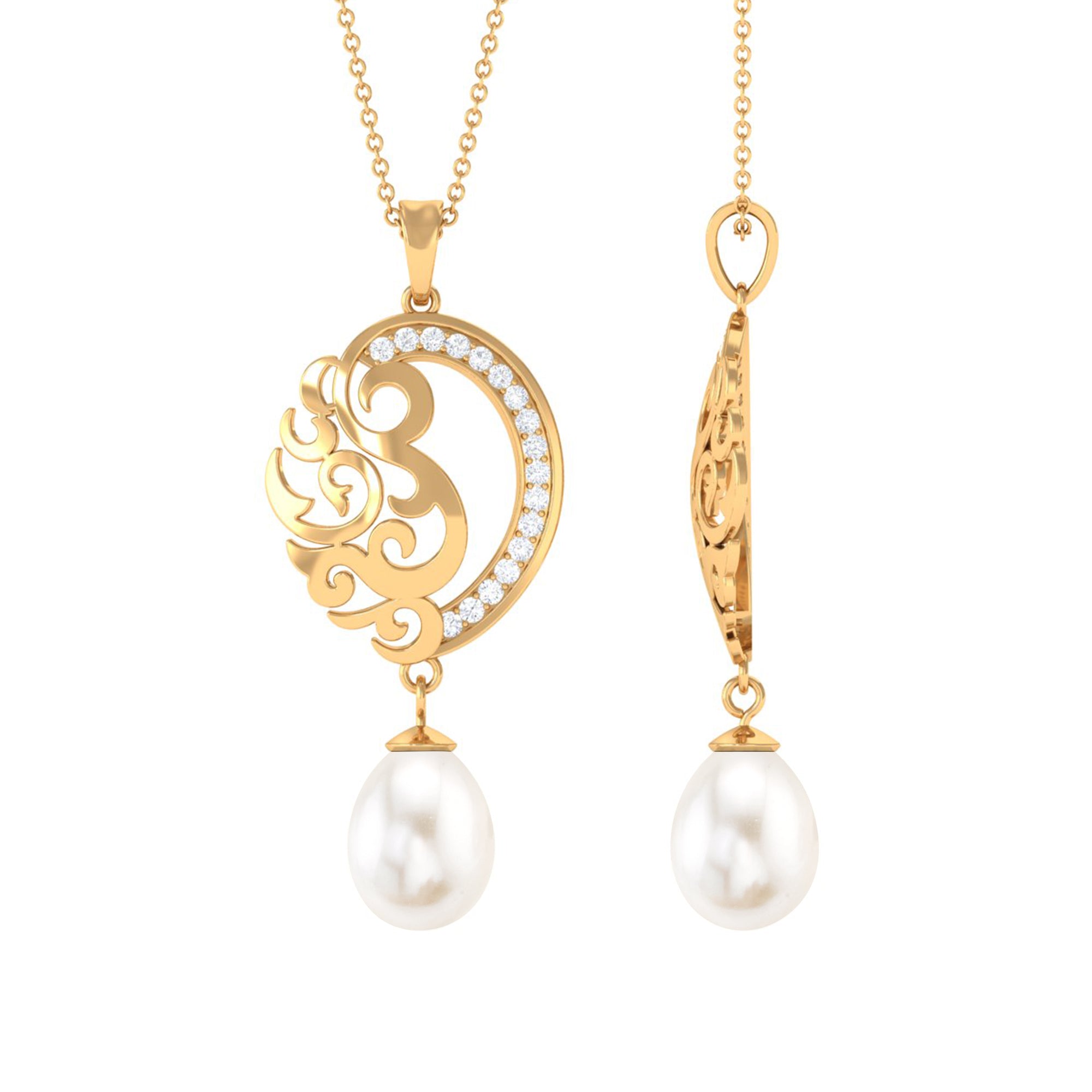 Add a touch of glamour to any special occasion with this Art Deco Pearl Pendant. The pendant features Round Shape Diamond stones and a stunning freshwater pearl, studded as a drop. Crafted from solid gold, this piece is perfect for an evening party or any other special event.