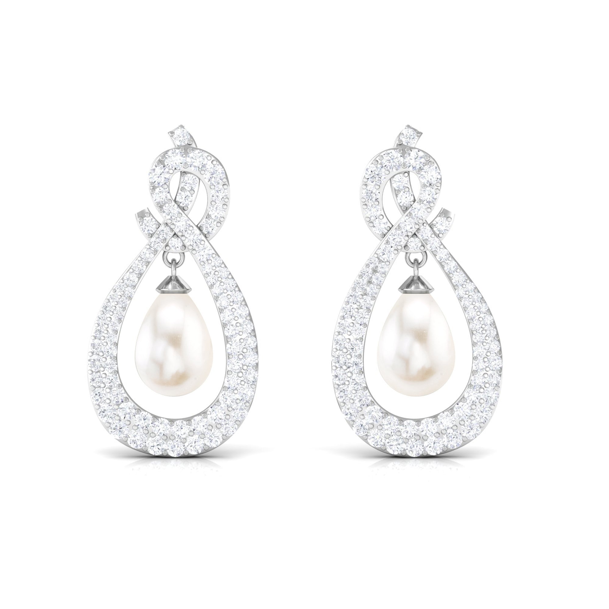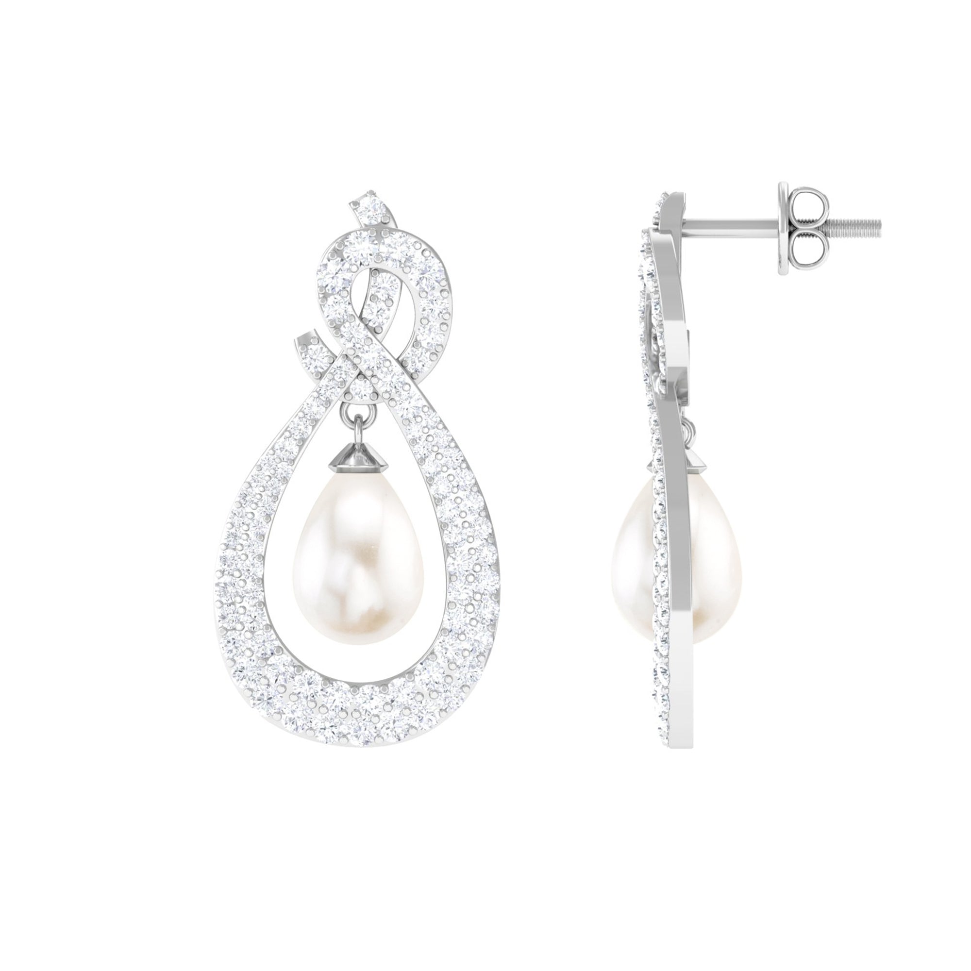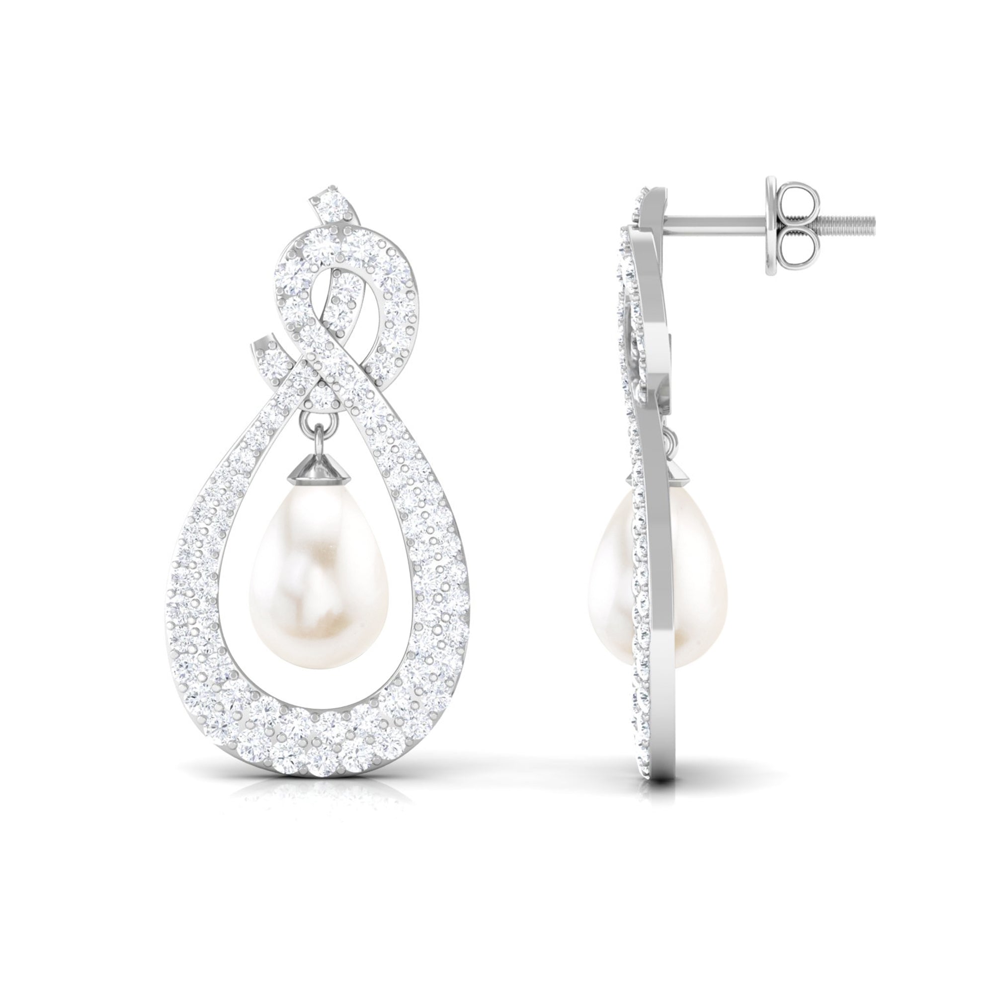 Elevate your elegance with Moissanite Freshwater Pearl Dangle Earrings, featuring sparkling gems in a micro pave setting and teardrop-shaped pearls.