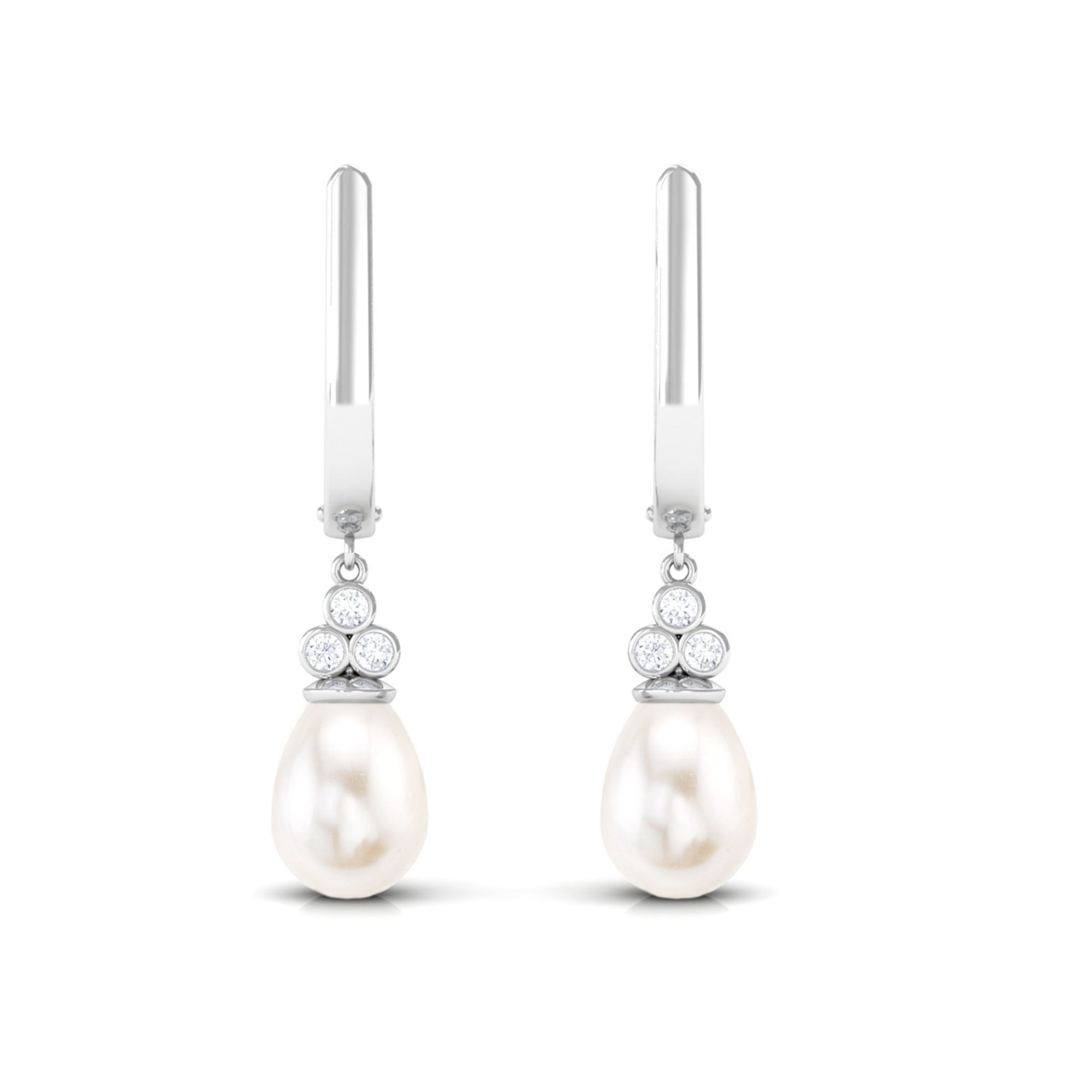 The stunning Teardrop Earrings are embellished with Freshwater Pearl hanging as a drop while sparkling three Round Diamonds enhance the charm of the hoop. Your look isnt complete without this captivating pair of Pearl Earrings that secures comfortably with a latch back closure. No need to look for occasions to style this pair, flaunt the Teardrop Pearl Earrings with any attire to get an elegant charm.