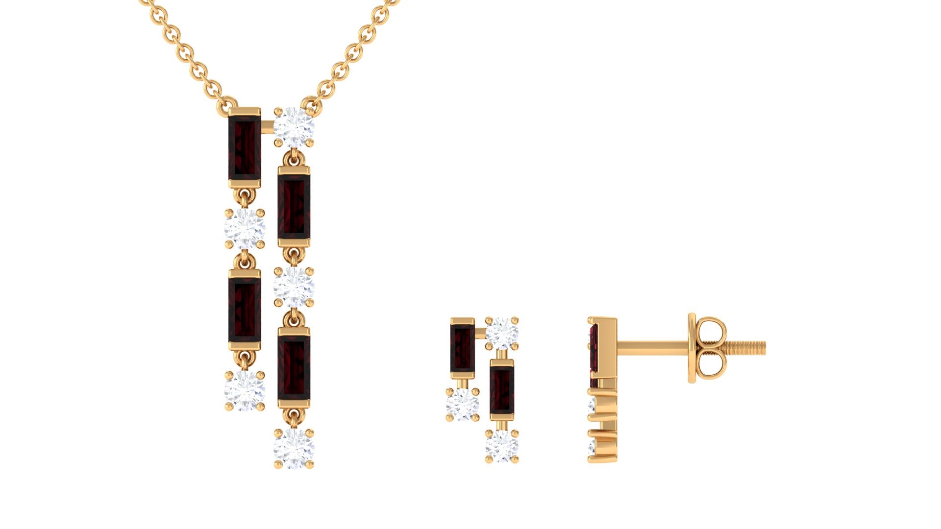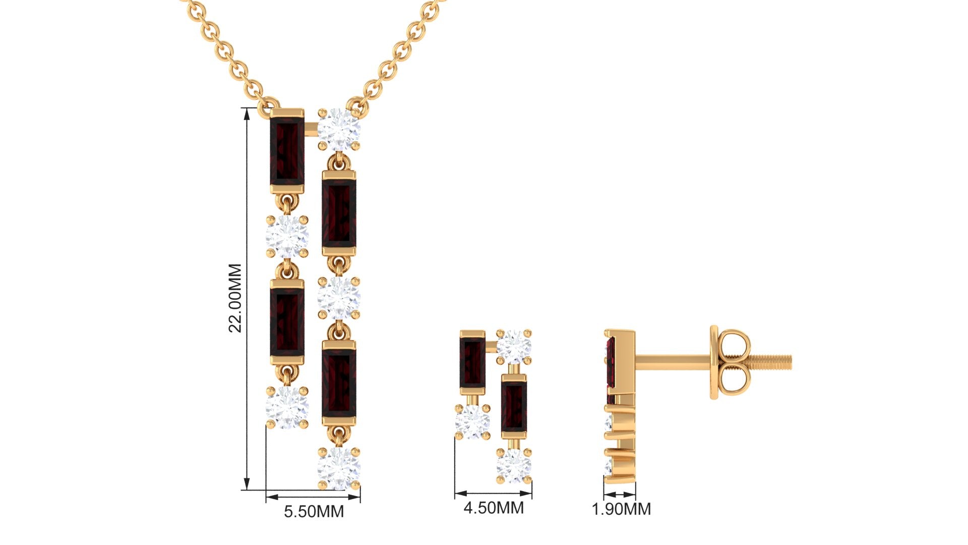 Elevate your style with this eye-capturing Garnet Jewelry Set that comes with a pair of earrings, easily goes with every outfit. The Baguette Cut Garnet in Bar Setting with Diamond set as Drop on Pendant Necklace and Earrings Set is surely hard to miss. This Garnet Pendant glitters your neckline and the earrings come with a secured screw back closure that keeps in its own place.