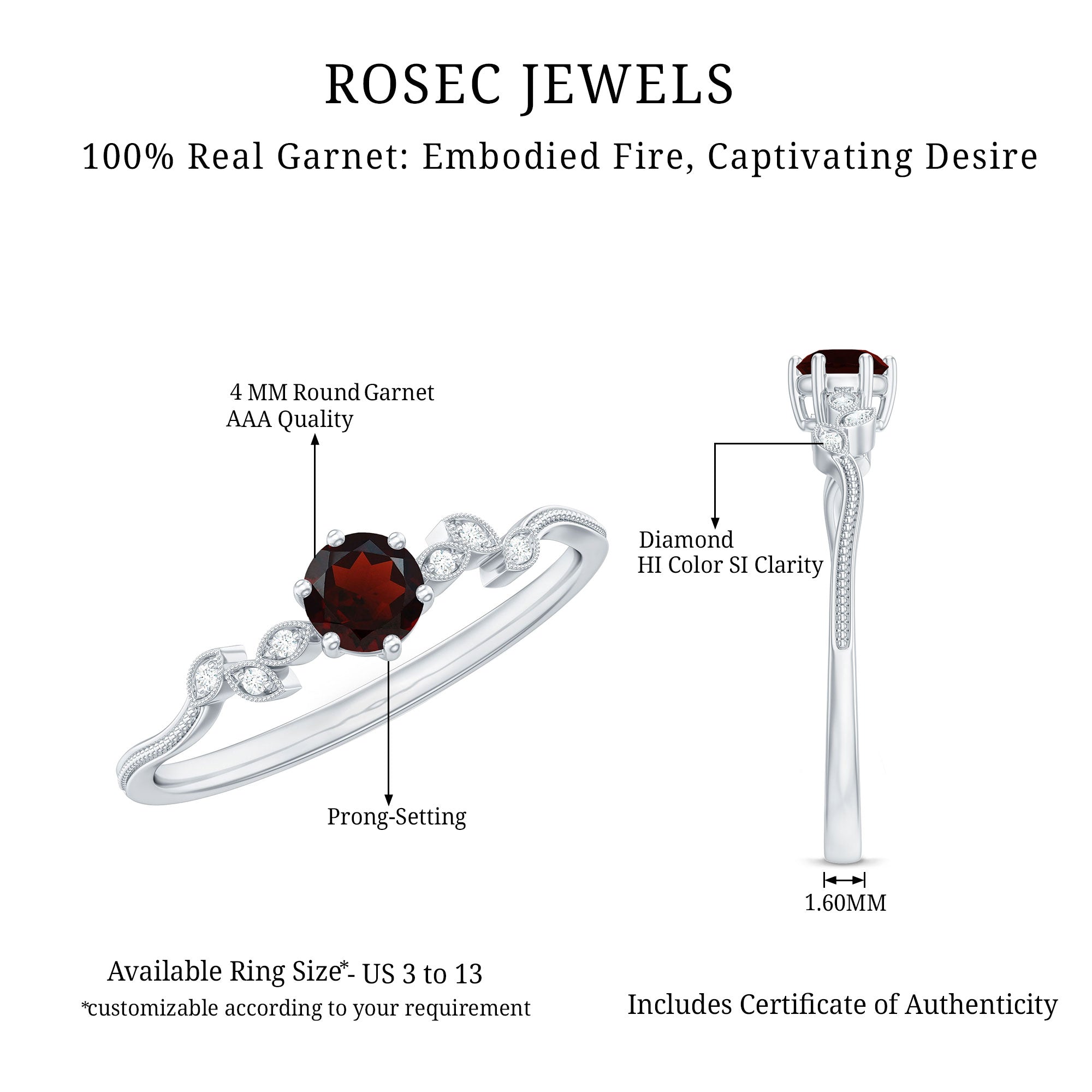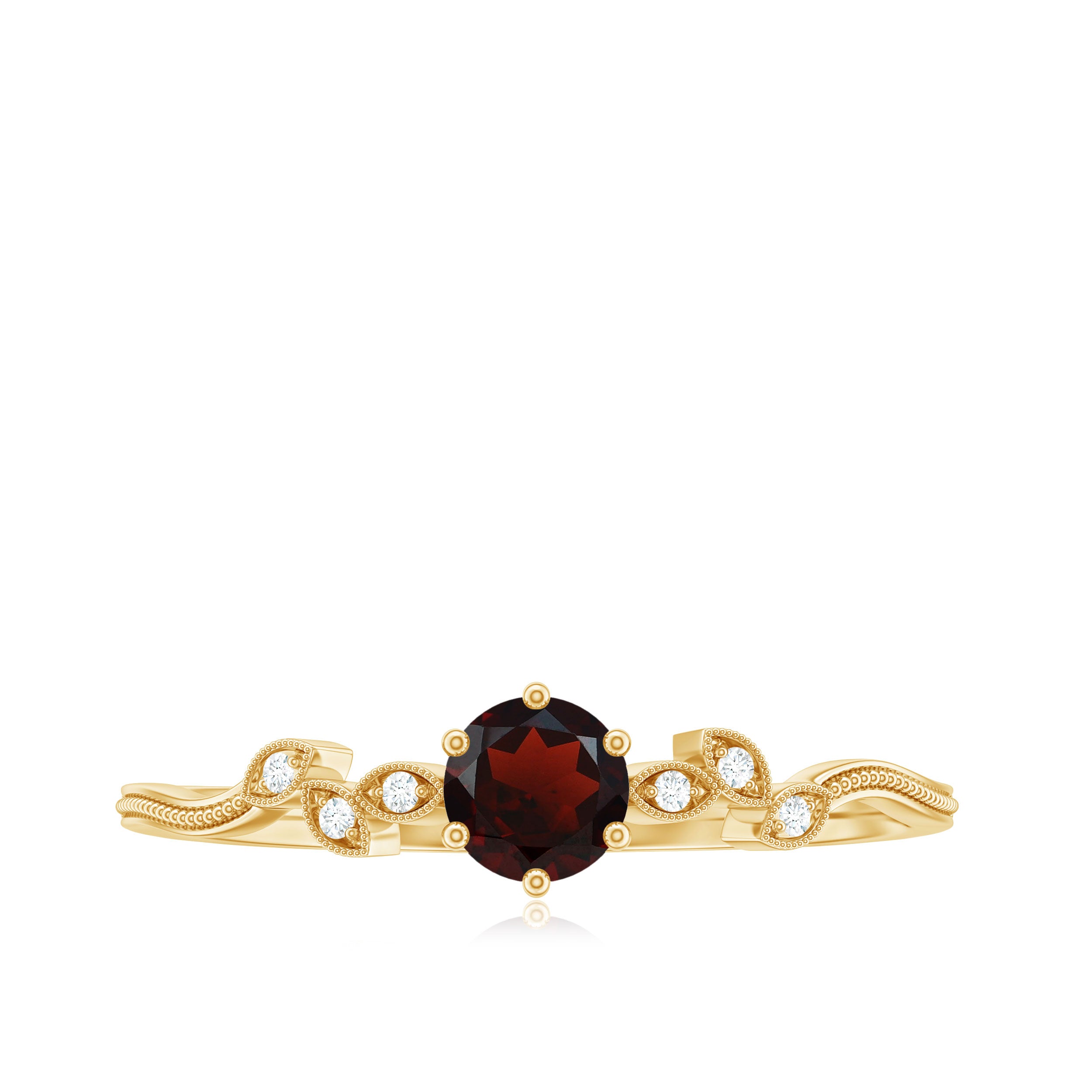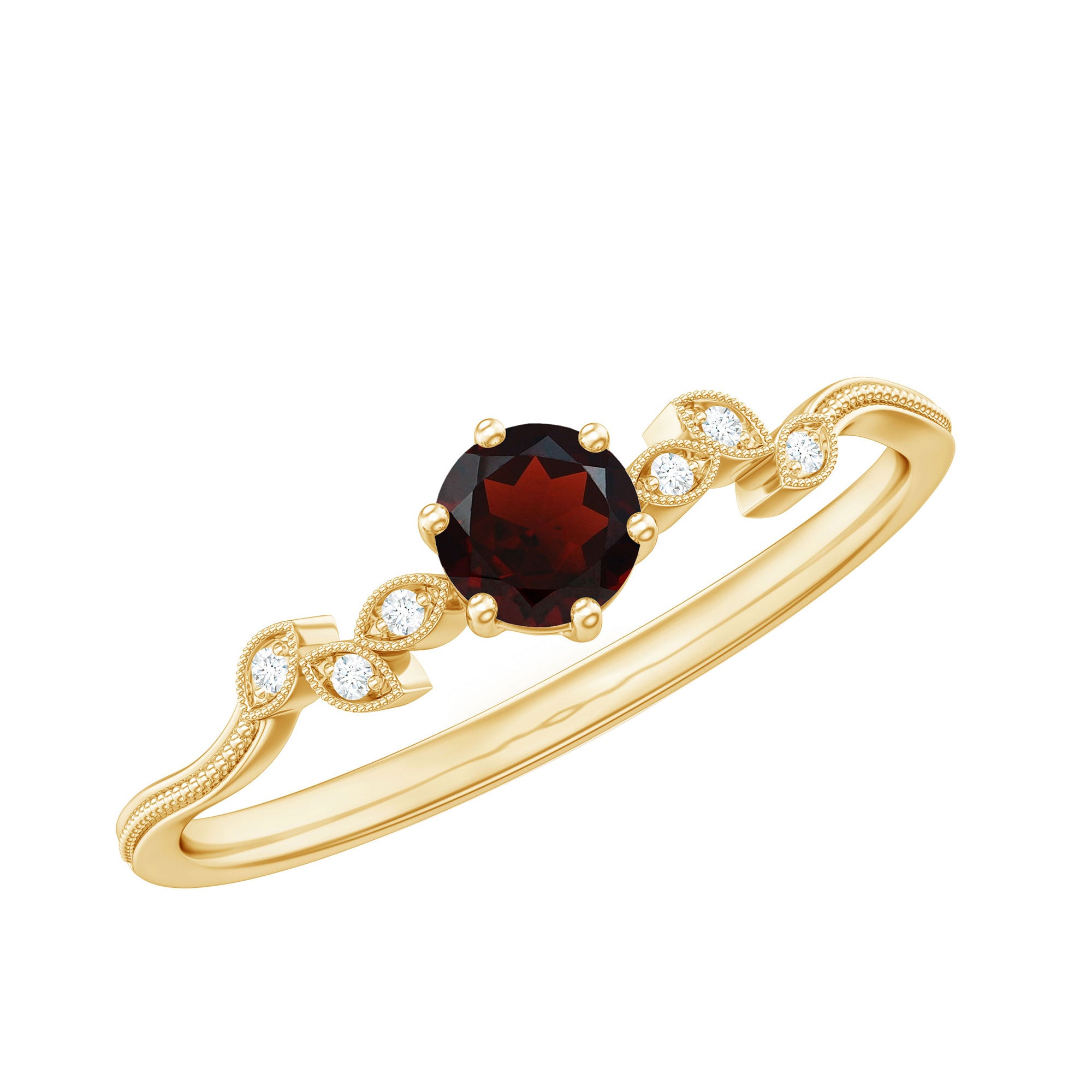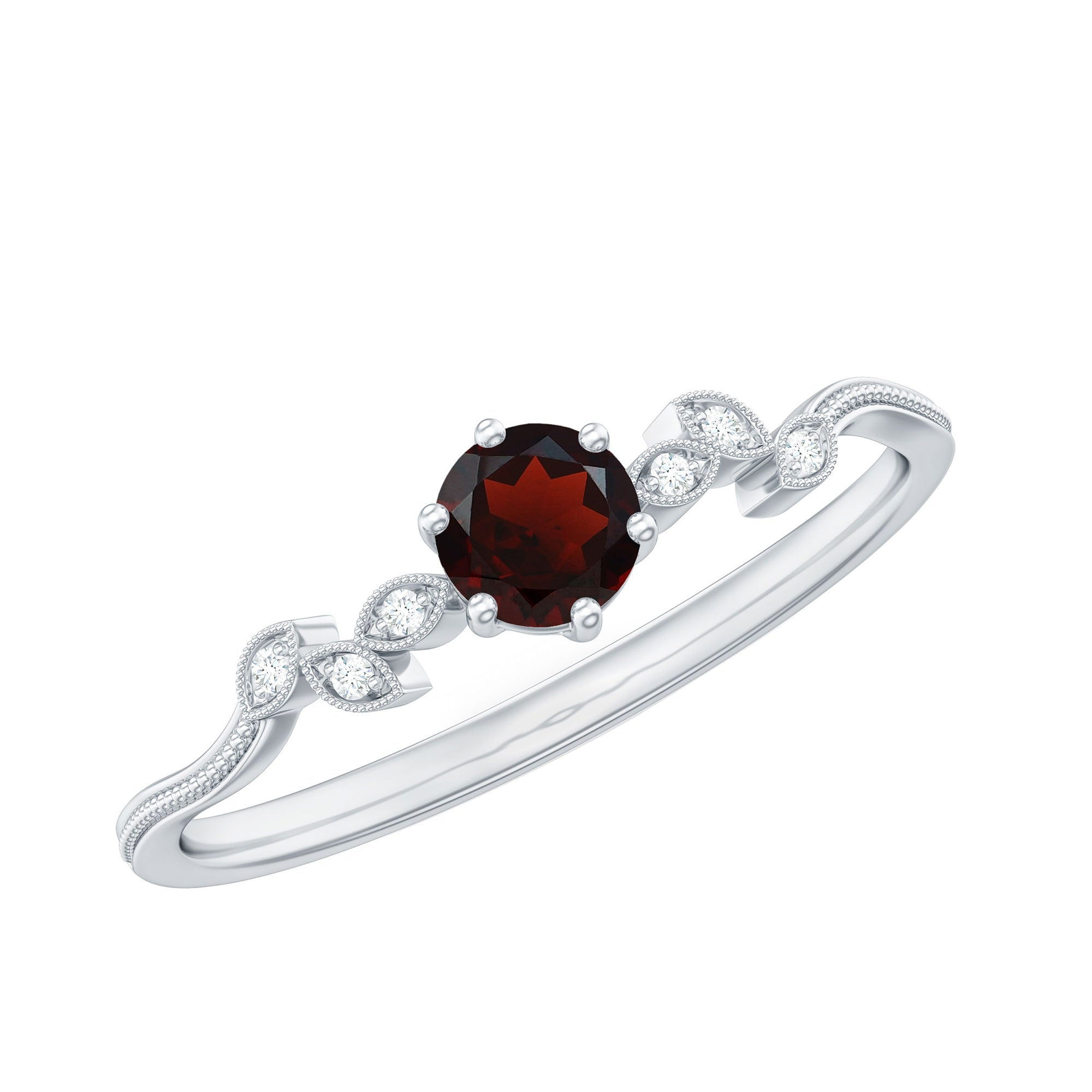 Prepare to dazzle on every occasion with the breathtaking beauty of this mesmerizing Garnet Promise Ring. Delicately crafted, it showcases a captivating arrangement of Round Cut Garnet stones in a prong setting, accentuated by the shimmering presence of Diamond gemstones. The Beaded Leaf design of this ring exudes sophistication and allure, making it the ideal accessory to enhance your ensemble, be it a party or a special event.