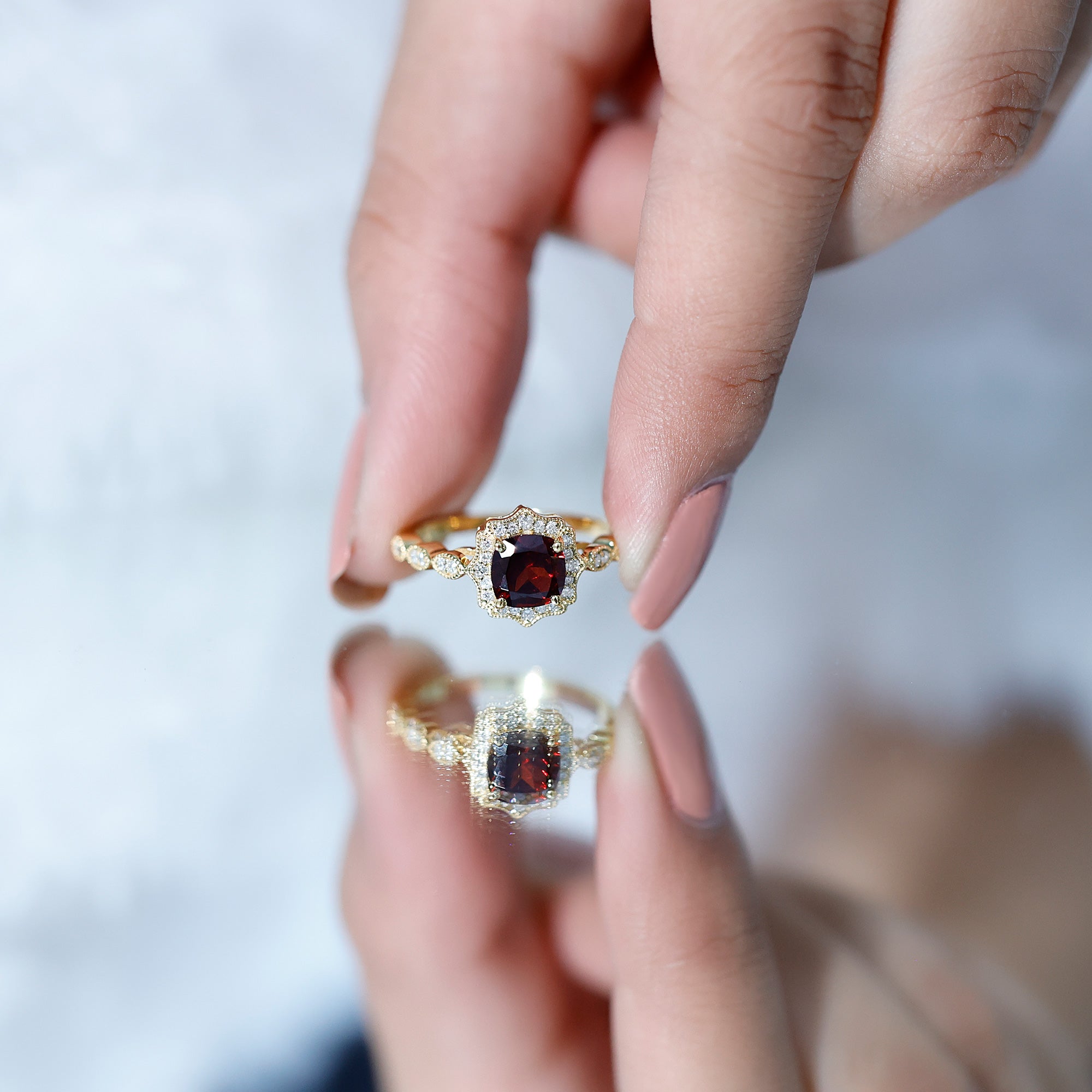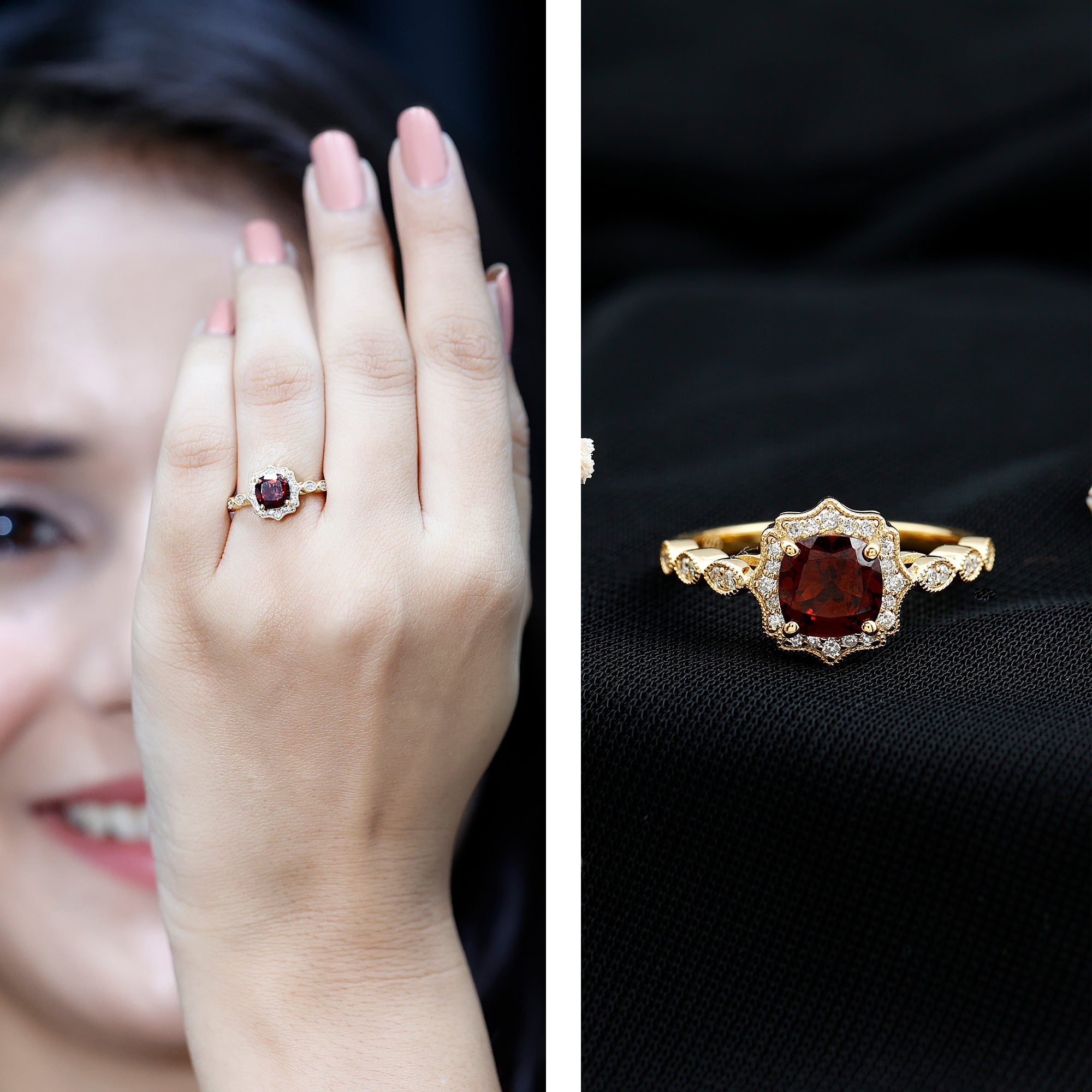For the woman who carries passion in her heart and elegance in her soul, this Vintage Looking Engagement Ring is a bold tribute to timeless romance. Crafted with care in 14K yellow gold plated silver, this Halo Engagement Ring brings together deep color and intricate detail in a design meant to be cherished for generations. At the center sits a rich, 6 MM cushion cut AAA quality garnet. Set in secure prongs, the garnet radiates with a fire that draws every eye. Surrounding the center stone is a brilliant halo of round lab grown diamonds, each set to reflect light with a soft, luxurious sparkle. The shimmering contrast between the fiery garnet and sparkling diamonds adds a timeless depth and drama to the piece. Moving down the shank, you will find marquise shaped frames, each inset with petite lab grown diamonds, evoking an Art Deco influence. The edges are lined with delicate beaded detailing, giving the Garnet and Diamond Ring a handcrafted, heirloom-worthy finish that echoes the romance of eras past. This Garnet Engagement Ring is a story of passion, trust, and enduring love. Its bold color and elegant craftsmanship make it a perfect choice for engagements, anniversaries, or simply celebrating a love that is as classic as it is unique. Whether worn to mark a milestone or as a symbol of your forever, this Vintage Art Deco Ring brings together elegance, meaning, and a touch of old-world glamour, all in one unforgettable piece.