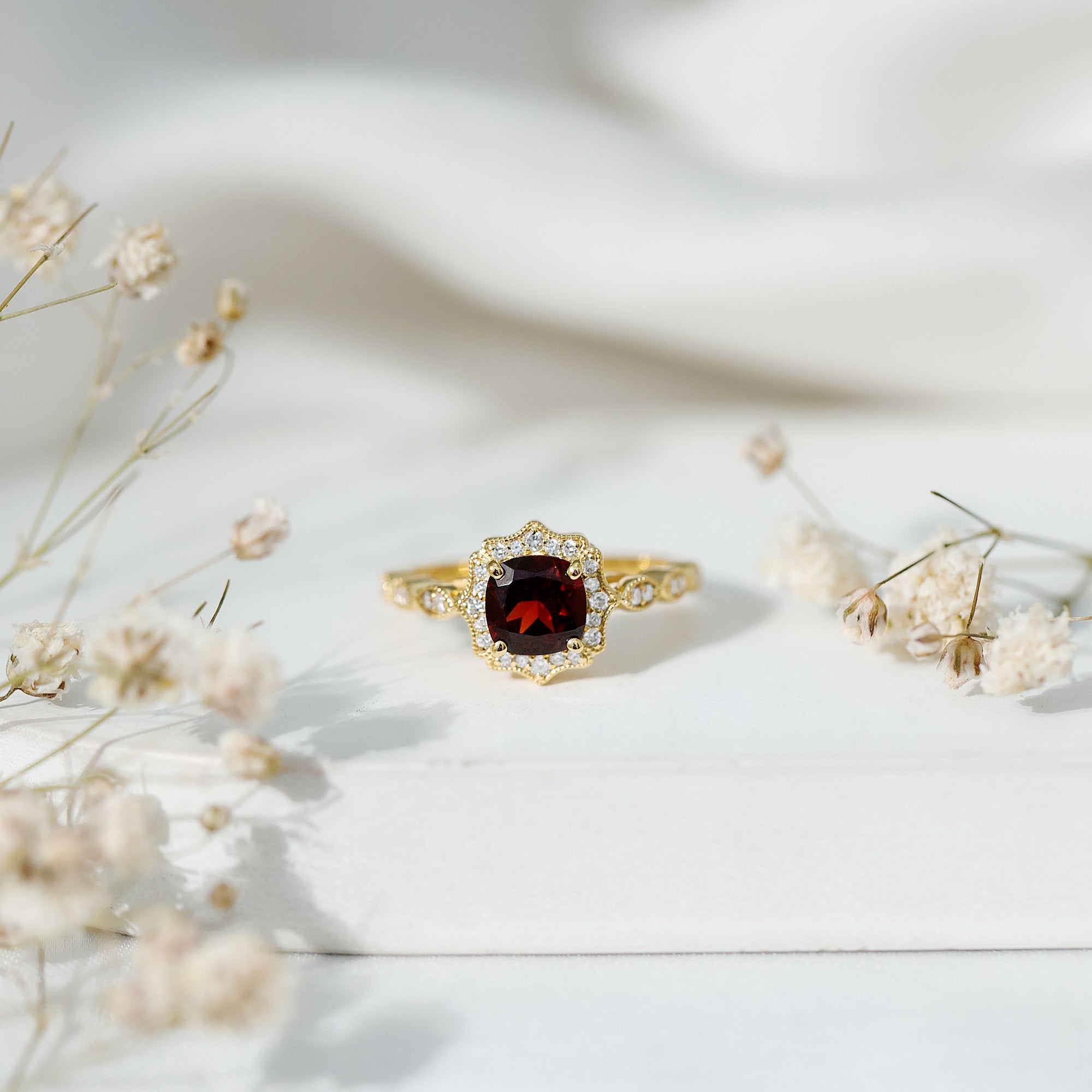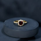 Garnet Vintage Engagement Ring with Lab Diamond Halo