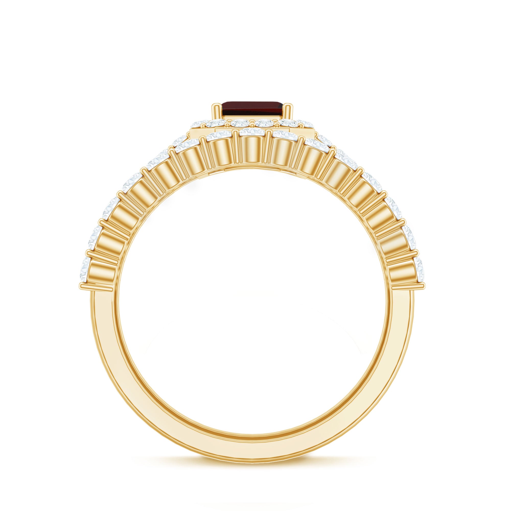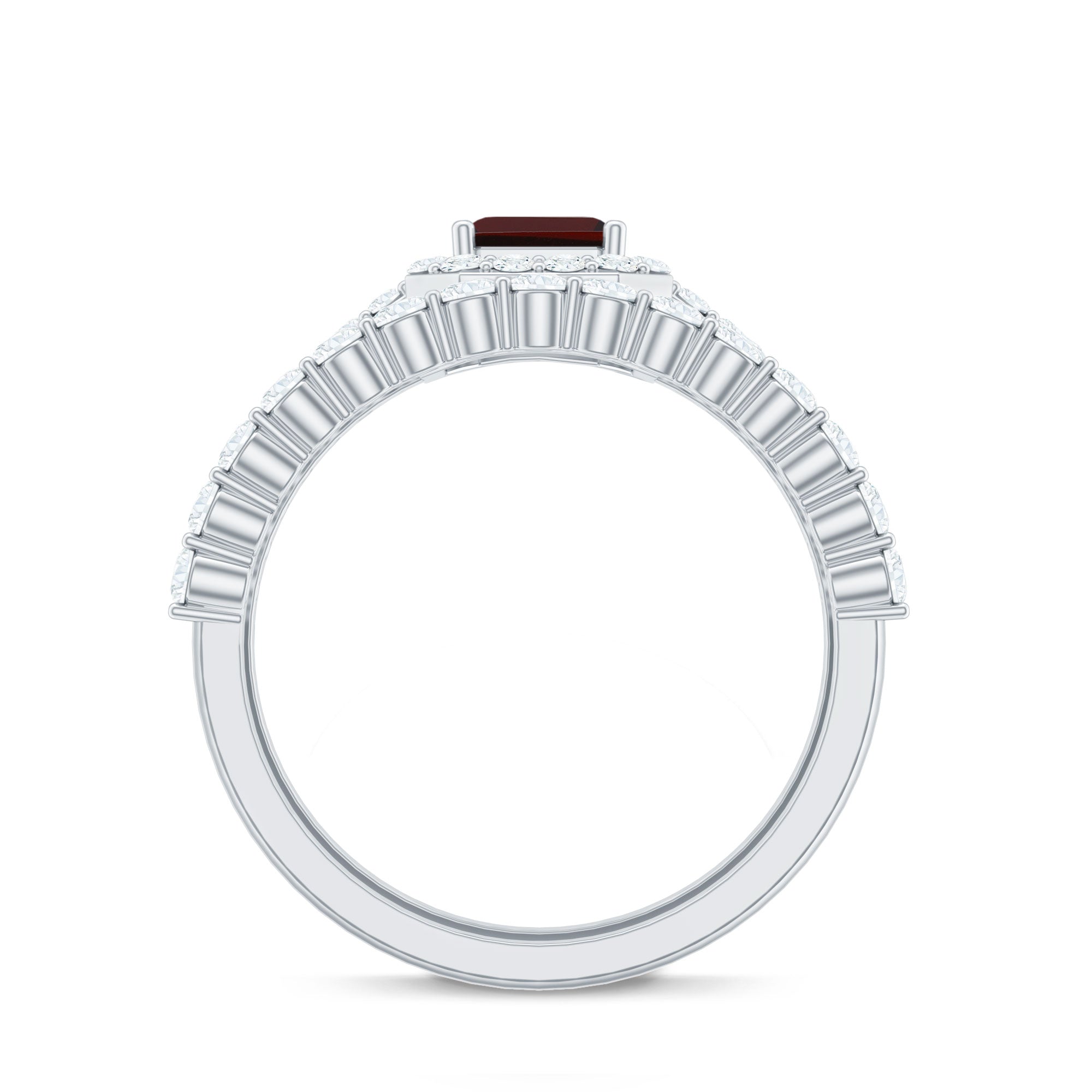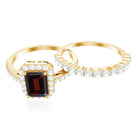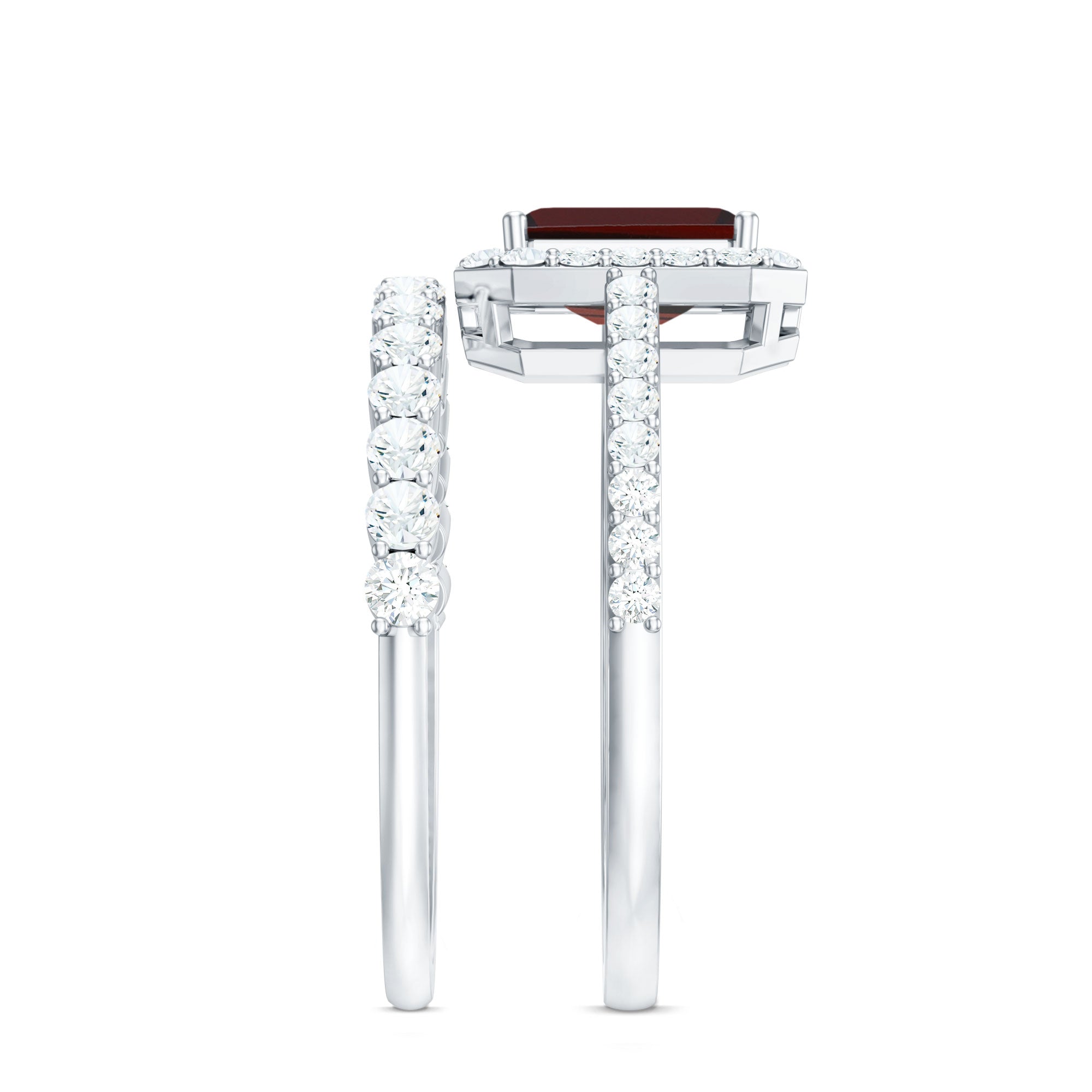 Dazzle your forever love with this breathtaking Wedding Bridal Ring Set, a romantic pairing designed to celebrate commitment most radiantly. At the center of the engagement ring is a deep red 6X8 mm Emerald Cut Garnet set in Prong Setting. Surrounding it is a shimmering Halo of Moissanite stones, with delicate Side Stones that add even more sparkle and elegance. Paired perfectly with the Half Eternity Wedding Band, adorned with a continuous row of dazzling Moissanite, this Garnet Wedding Ring Set creates a harmonious sparkle that feels both timeless and modern. Together, the two rings form a beautiful story of love, promise and a future filled with light. Crafted with attention to comfort and style, this Wedding Engagement Ring Set is available in various ring sizes and arrives in a signature jewelry box that elevates the moment. Whether you are planning a heartfelt proposal or celebrating your wedding day, this Emerald Cut Wedding Ring Set captures emotion in every facet. Romantic and meaningful, this Ring Set of 2 is a treasure meant to be worn every day as a reminder of a love that shines endlessly.