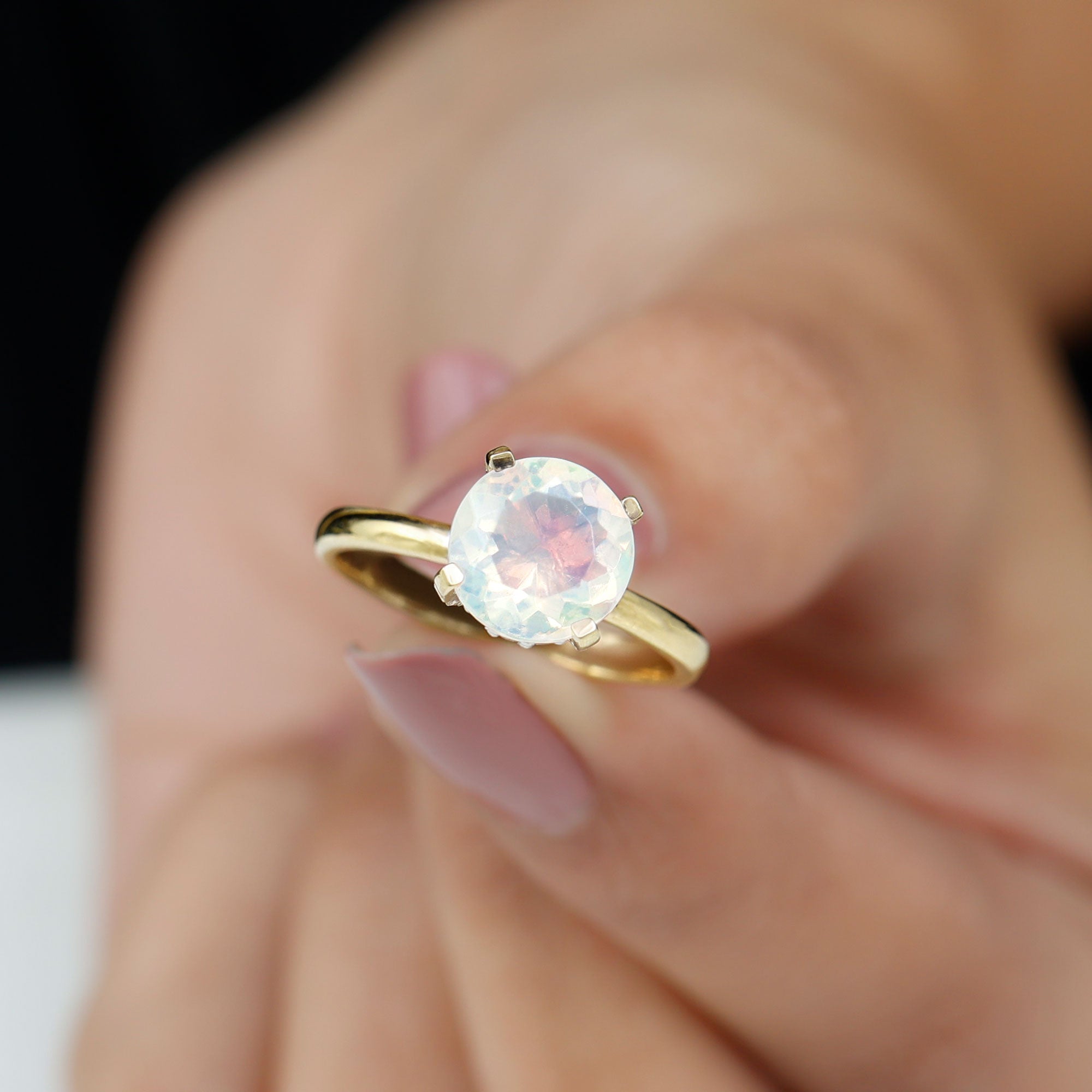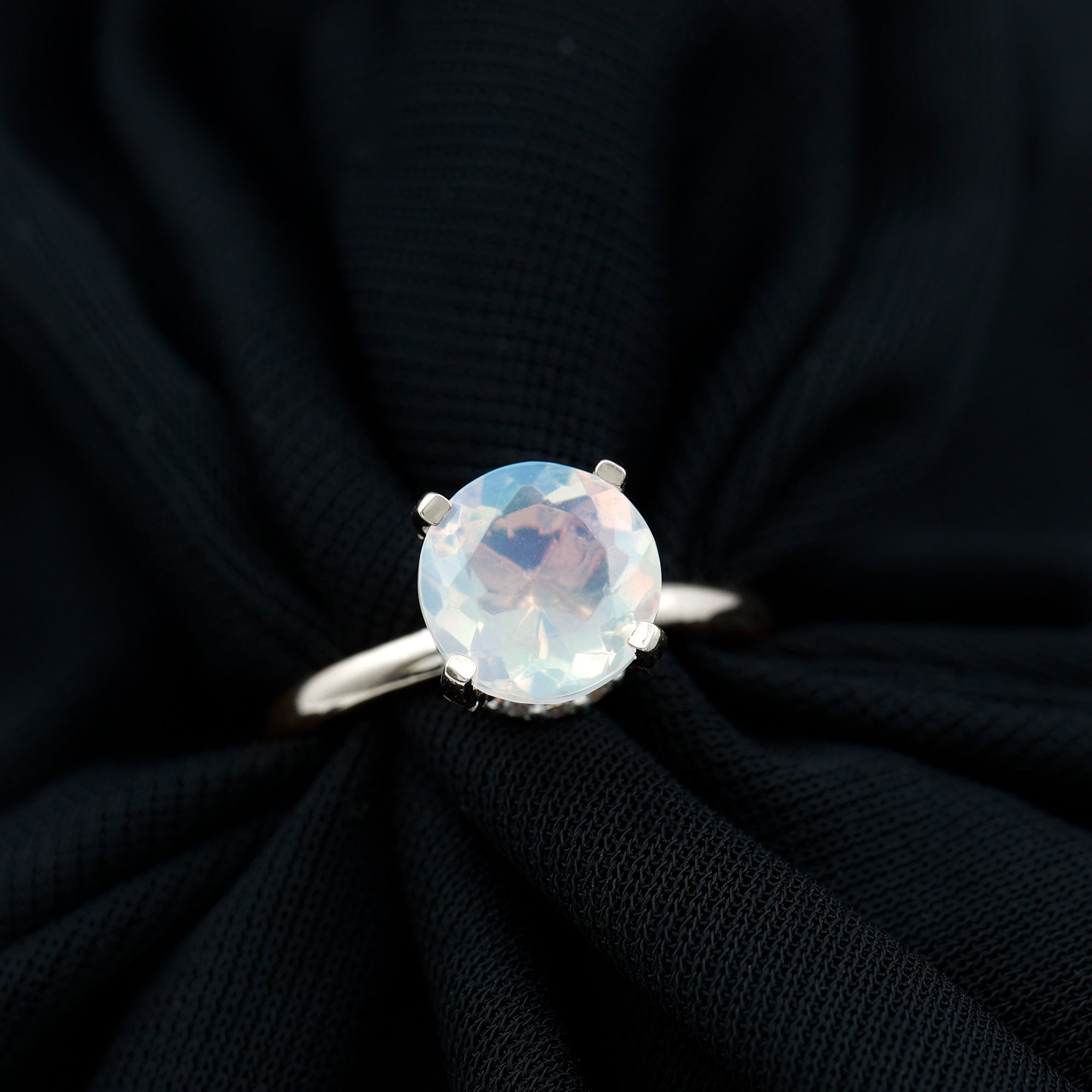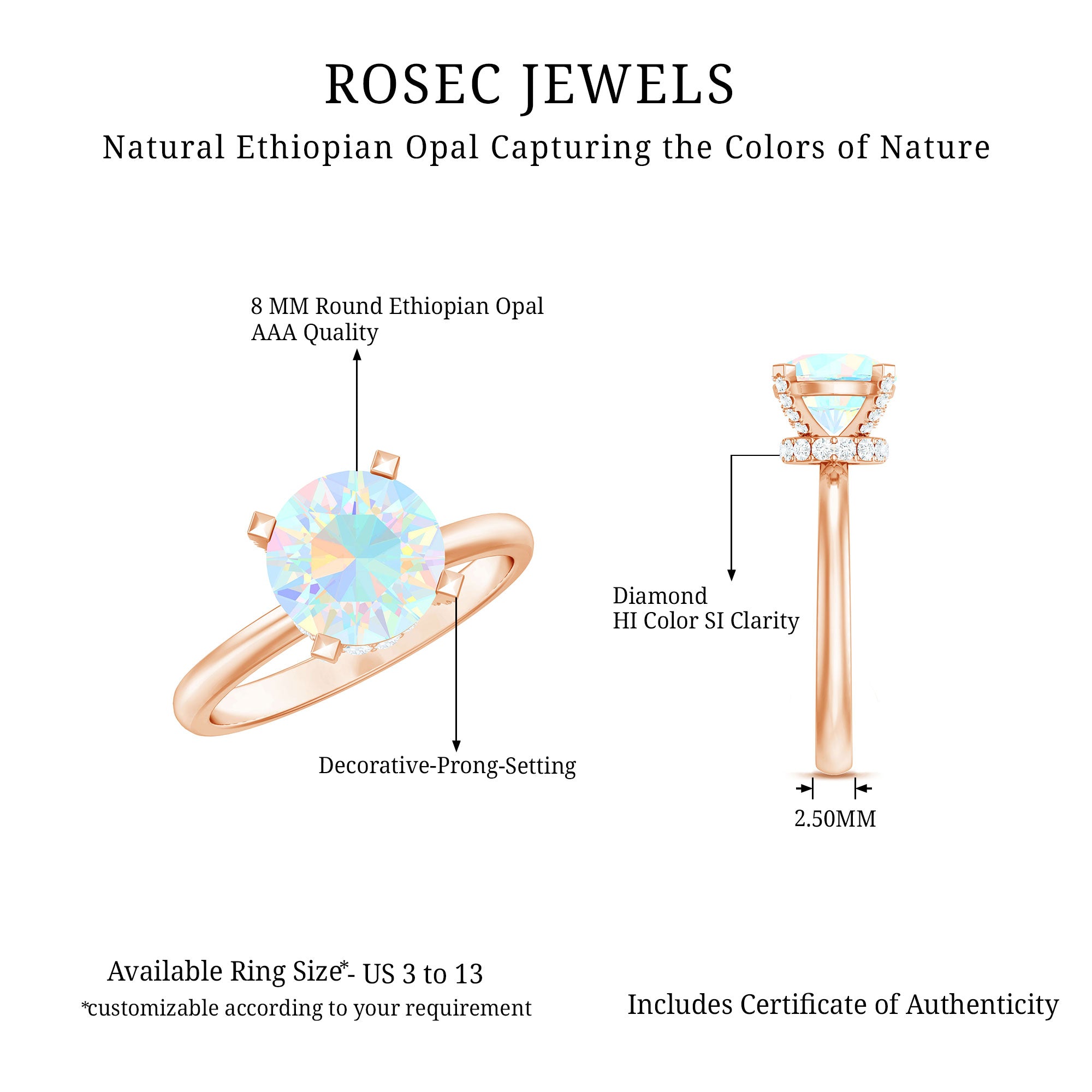 Step into a world of celestial shimmer with this Ethiopian Opal Engagement Ring, designed to capture hearts. At the center of this enchanting piece is an 8 mm Round Shape Ethiopian Opal set in Prong Setting adorned with dainty Diamond stones. Beneath the center stone, a Hidden Halo of sparkling Diamond stones adds a secret layer of brilliance, catching the light with every movement and making this Opal Diamond Engagement Ring a true showstopper from every angle. This Hidden Halo Engagement Ring is perfect for the one who moves to her own rhythm, dreamy, bold and effortlessly unforgettable. Whether it is an engagement, anniversary or a once-in-a-lifetime gift, this Rainbow Opal Engagement Ring says forever in the most magical way. Arriving in a beautiful jewelry box and available in various ring sizes, this Classic Engagement Ring is made for moments that matter. Dazzling, delicate and deeply meaningful, this Round Engagement Ring is just like your love story.