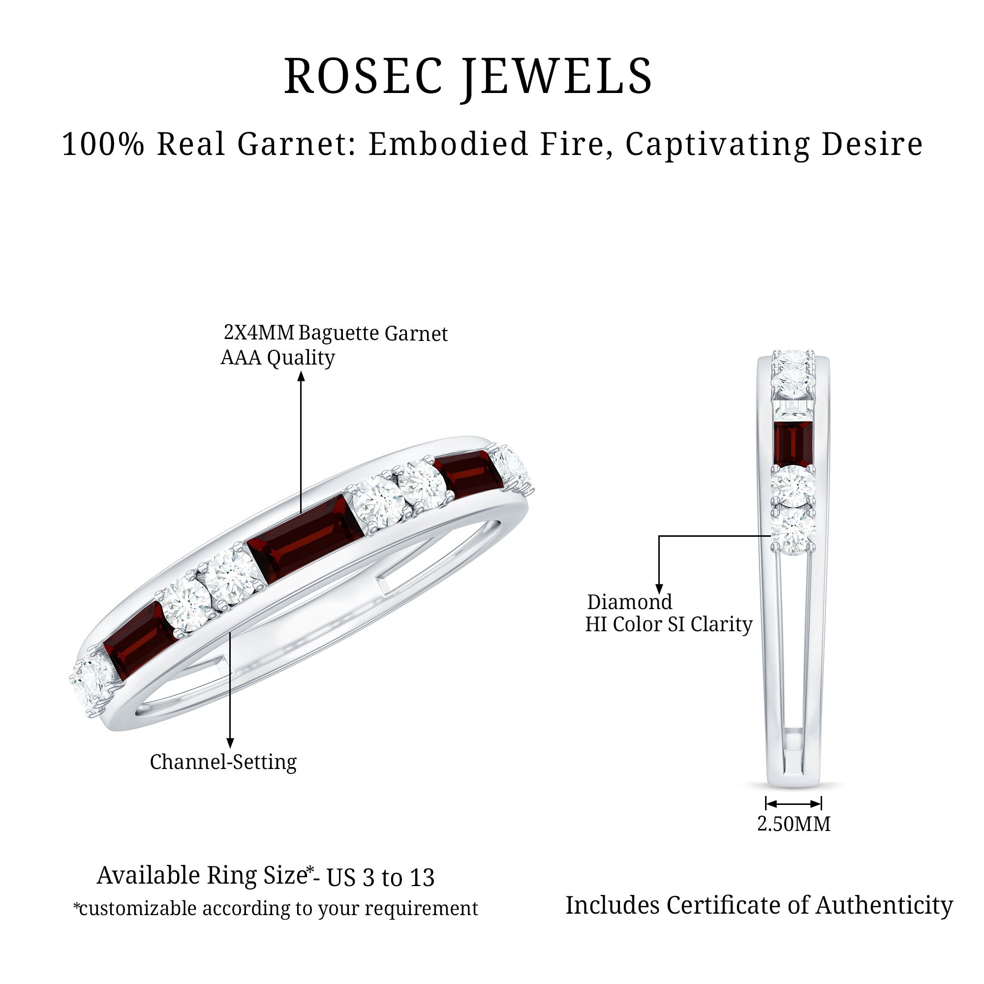 Get ready to shower with lots of compliments with this Half Eternity Band, a striking blend of modern elegance and timeless romance. Featuring Baguette Shape Garnet stones arranged in an East-West style, each one is accented with sparkling Round Diamond stones, creating a harmonious flow of color and light across the band. The rich, deep red of the AAA Quality Garnet stones symbolizes passion and devotion, while the HI-SI Quality Diamond stones add a delicate sparkle that catches every eye. This Baguette Eternity Band combines contemporary style with classic charm. Perfect for anniversaries, celebrations or as a meaningful gesture of love, this Garnet Diamond Ring is a ring that tells a story of devotion and lasting connection. Arriving in a signature jewelry box, this Garnet Eternity Band is ready to gift, making it an effortless choice for birthdays, holidays or surprise moments that deserve a touch of sparkle. With various ring sizes available, finding the perfect fit is simple and thoughtful.