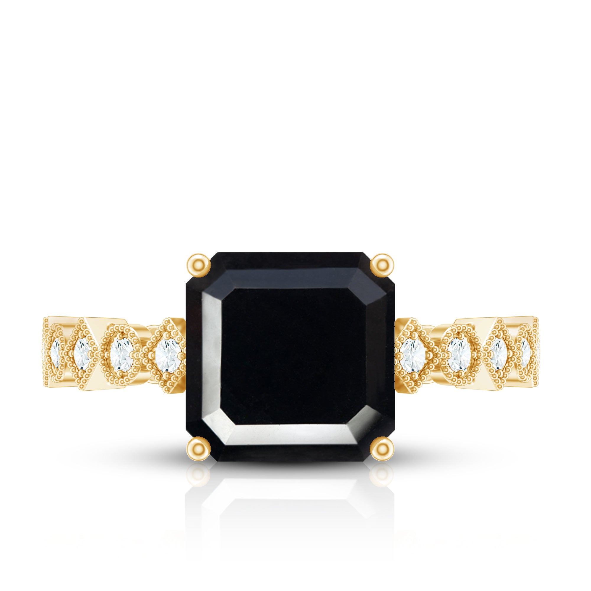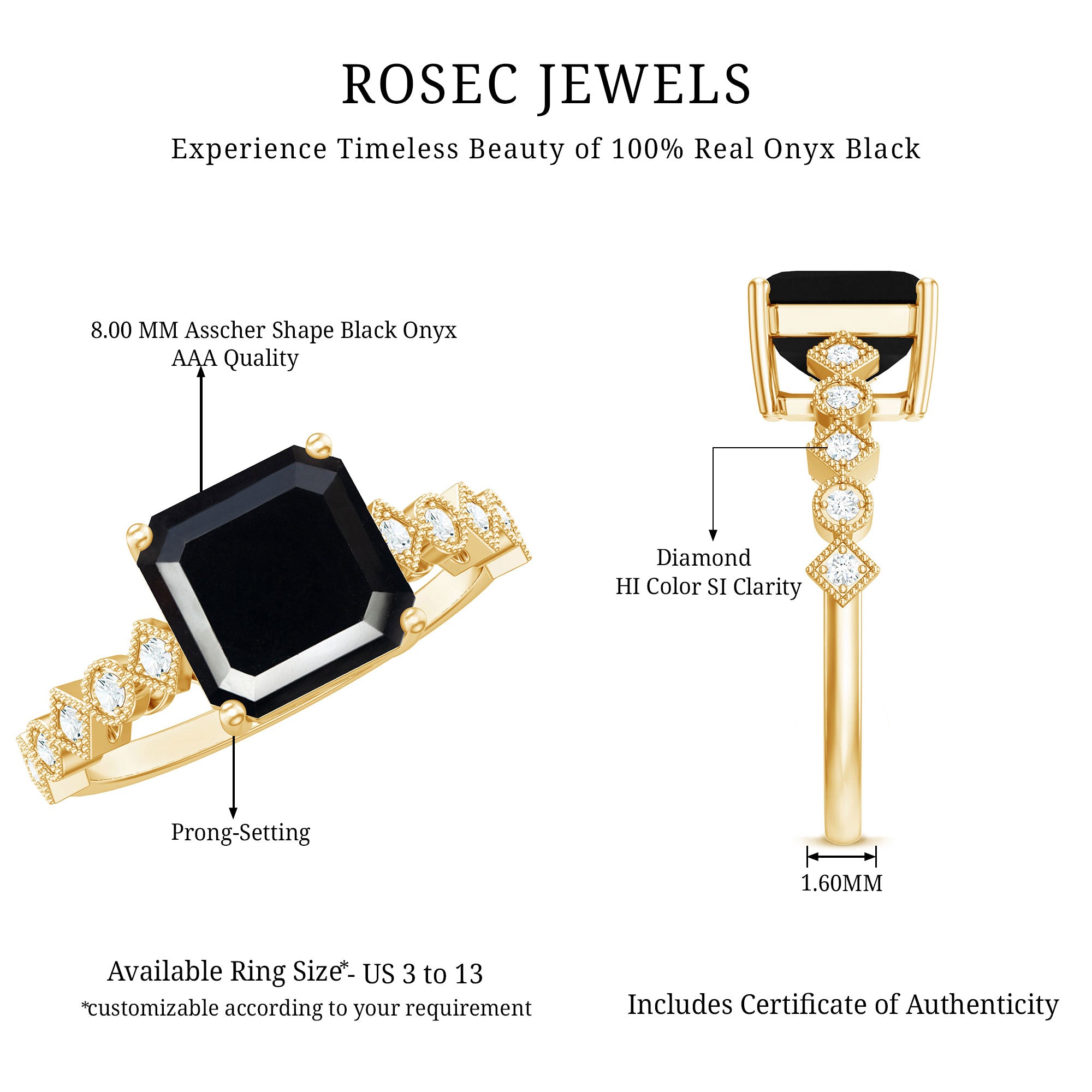 Embrace eternity with a ring that eloquently expresses its brilliance and sophisticated design. This Black Onyx Engagement Ring embodies the ideal harmony of passionate love and enduring elegance, making it an exceptional selection for your most treasured occasion. At the heart of this enchanting piece lies an 8 MM Asscher cut Black Onyx, meticulously held in a prong setting. Enhancing the design further, the sleek band features horizontally arranged round shape Diamond side stones. These artfully positioned accents introduce a modern flair and delicate sparkle, perfectly enhancing the center stone while imparting a distinctive, contemporary essence to the Solitaire Engagement Ring. Whether for an engagement, a significant anniversary, or a momentous celebration of love, this 3 Carat Onyx Ring is crafted to symbolize strength, brilliance, and the journey of two souls uniting as one. Available in a broad spectrum of US sizes, this Asscher Cut Engagement Ring guarantees a perfect fit, designed to feel just right for your special day. Every angle, every glimmer, and every detail is meticulously designed to create a piece that serves as a lasting emblem of your love story, your commitment, and the bright future that lies ahead. Allow your devotion to radiate with a ring that is destined to be cherished for eternity.