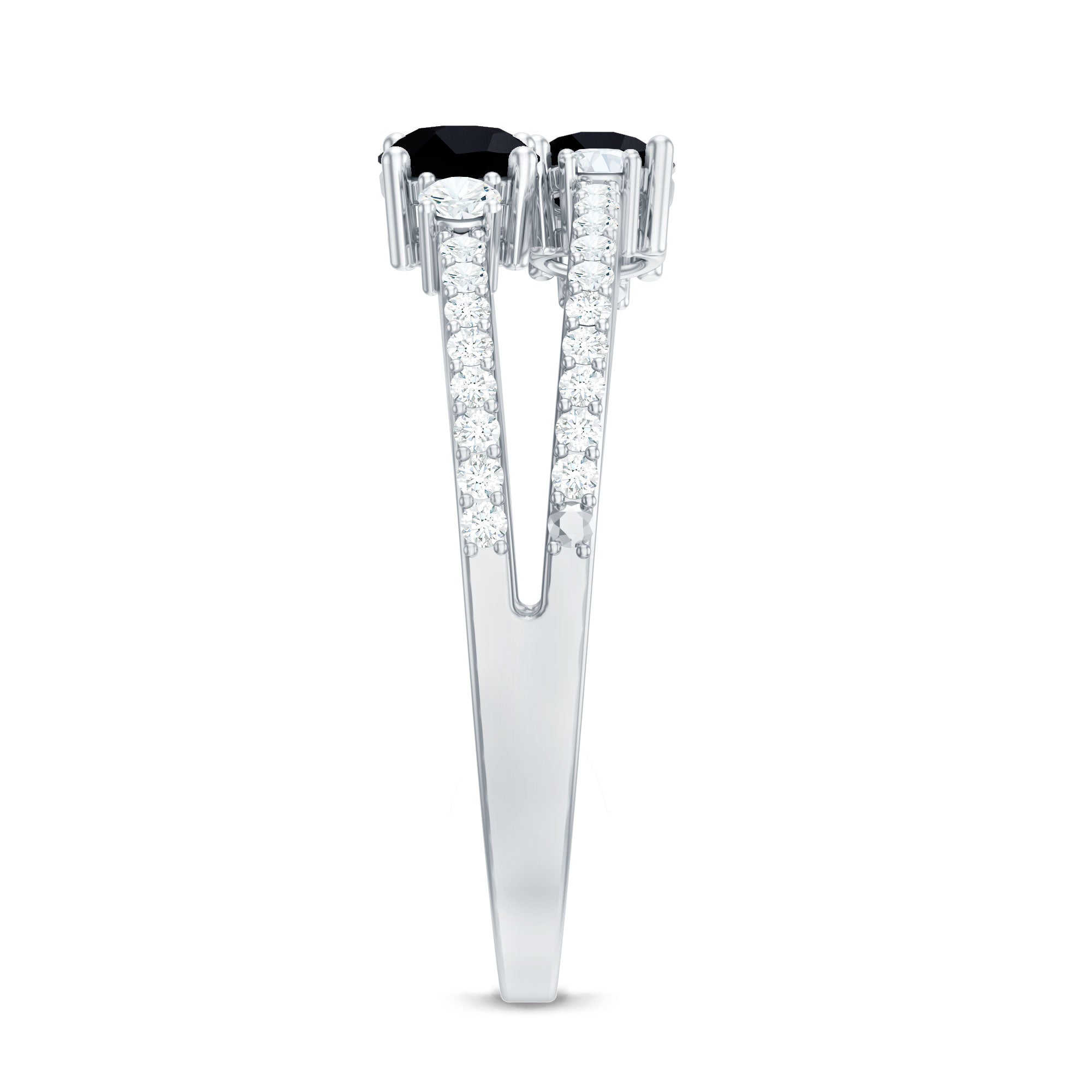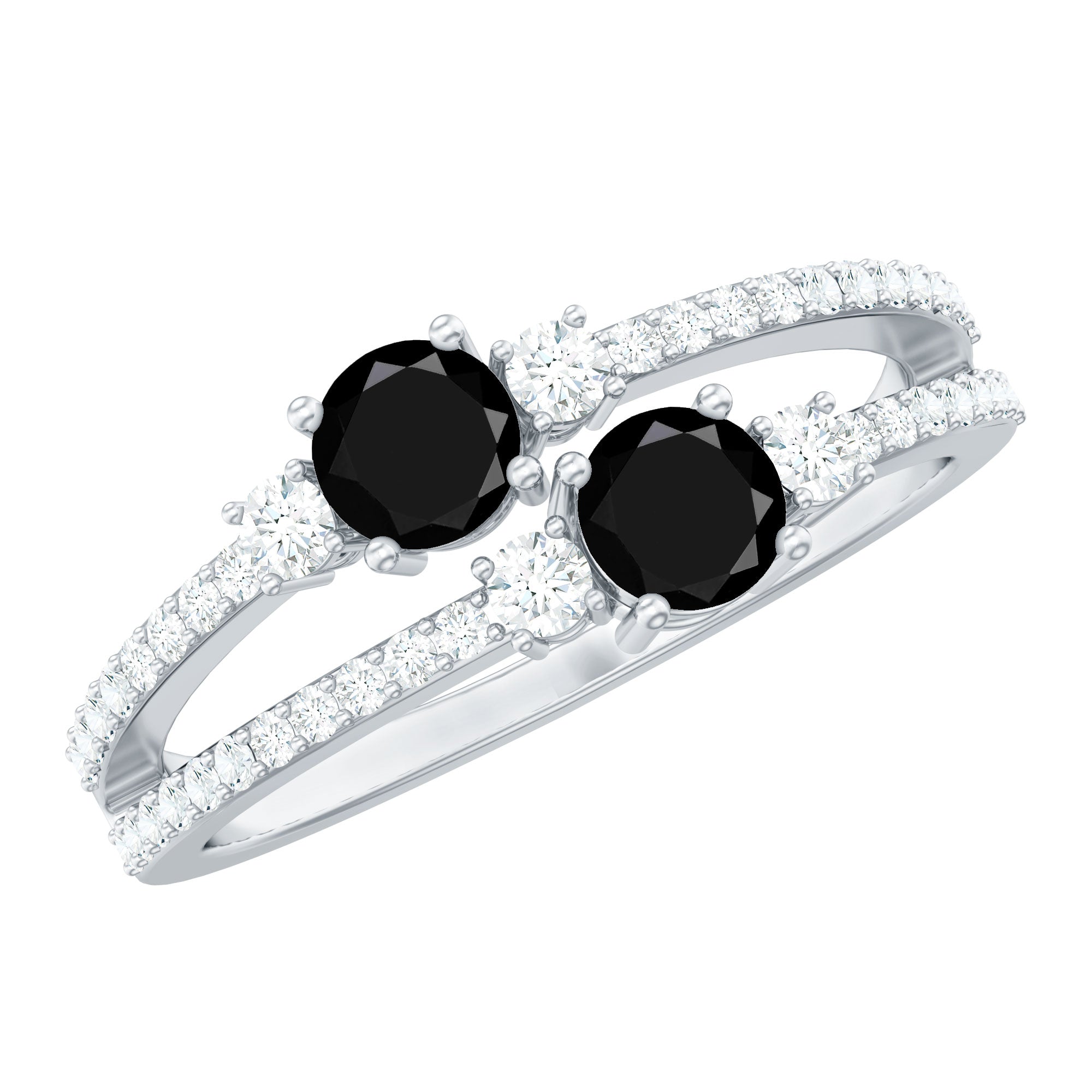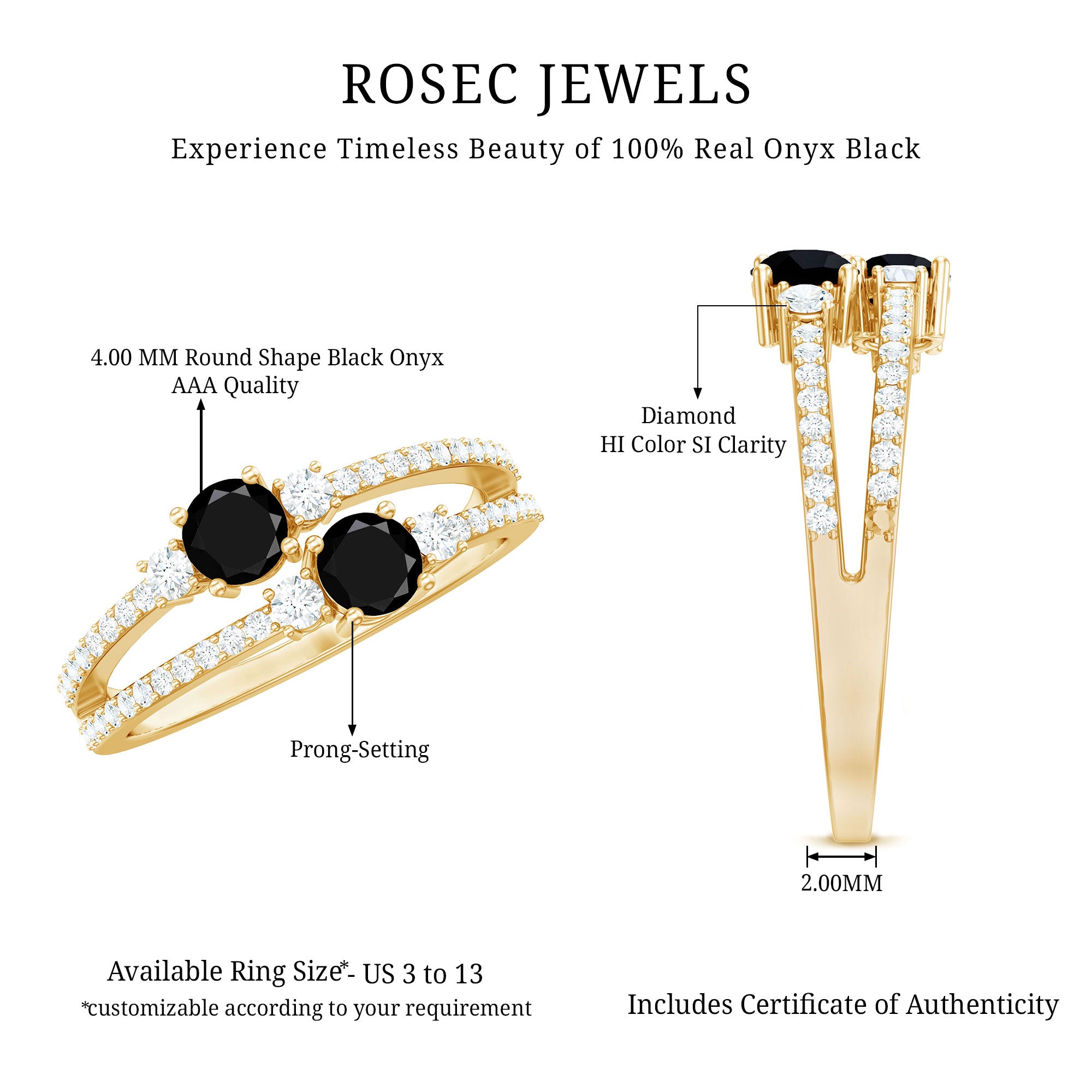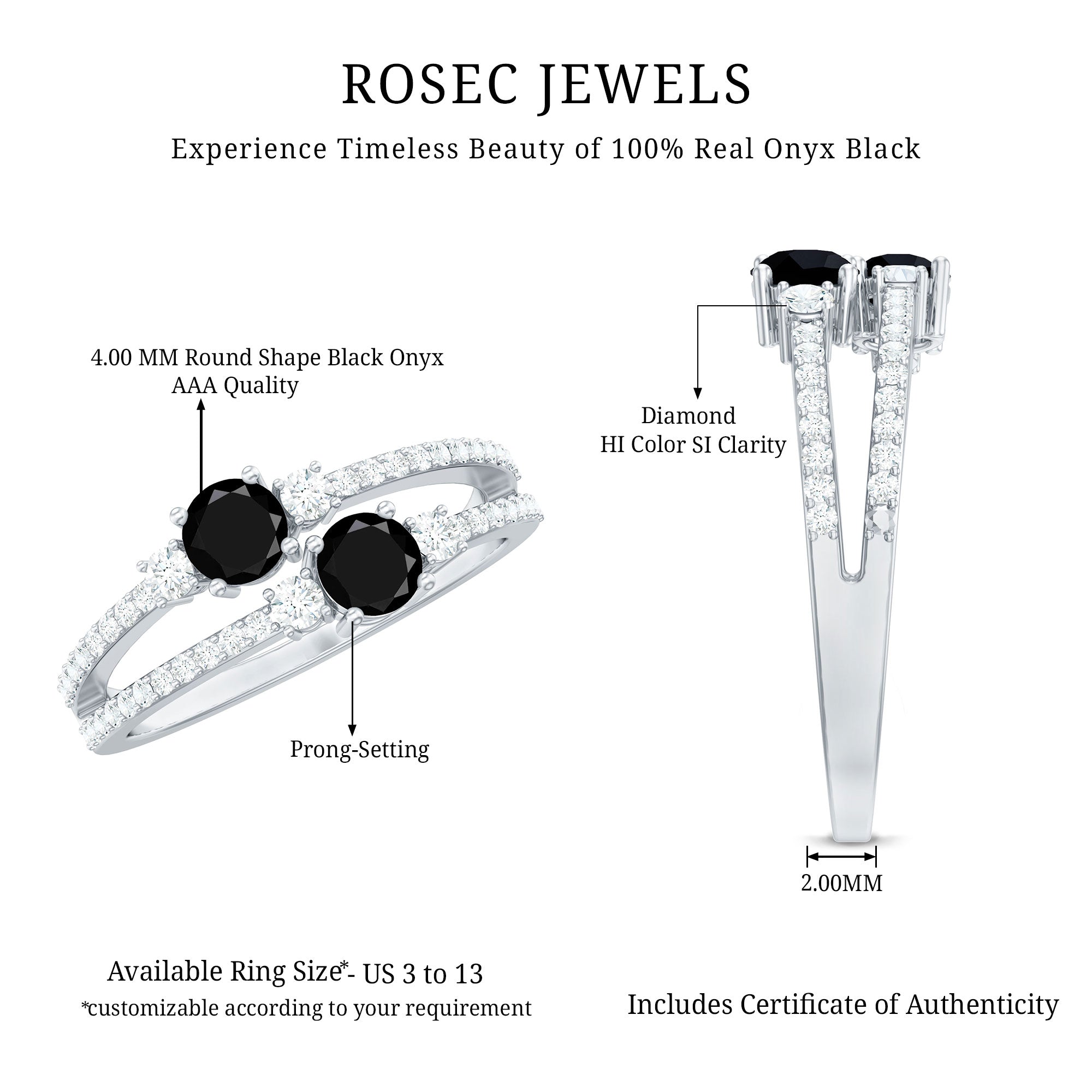 Our Toi et Moi Ring narrates the tale of two hearts uniting as one. This exquisitely crafted Black Onyx Promise Ring showcases a significant two-stone design, symbolizing the profound connection shared between two individuals. At its core, two round shape Black Onyx of 4mm - are positioned closely within a secure prong setting, representing you and your beloved. Black Onyx stones exhibit AAA quality, providing remarkable sparkle and brilliance that radiates with every movement. The ring features a split shank band that adds a contemporary flair, adorned with smaller diamond stones that elegantly embellish the band, forming a stunning frame around the center. This intentional design is not only visually striking but also carries a significant meaning. It serves as a reminder of a relationship founded on balance, trust, and unity. Whether presented as an engagement ring, an anniversary present, or a heartfelt gesture, this Split Shank Ring conveys its message eloquently. Offered in a variety of metal colors, materials, and ring sizes, it can be customized to reflect her personal style. This Onyx 2 Stone Ring is meticulously handcrafted and includes a gemstone certification to guarantee quality and authenticity. Additionally, it is presented in a sophisticated jewelry box, ready to be gifted or cherished.