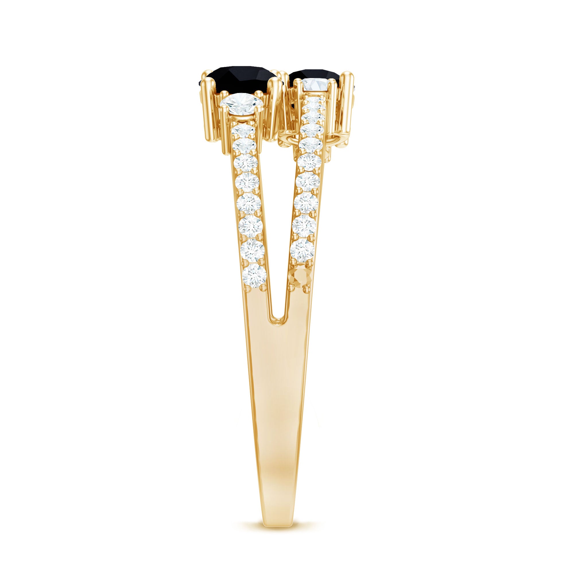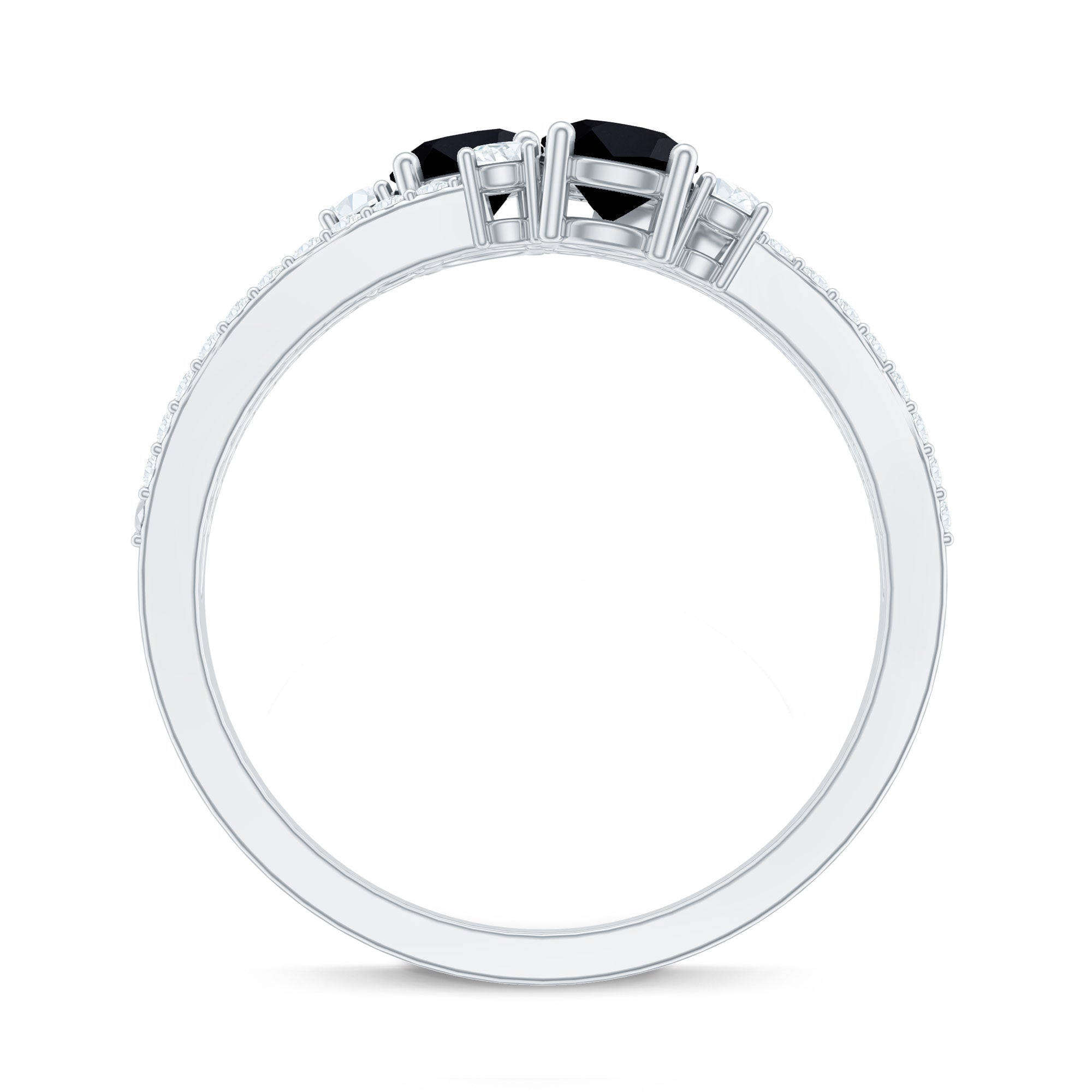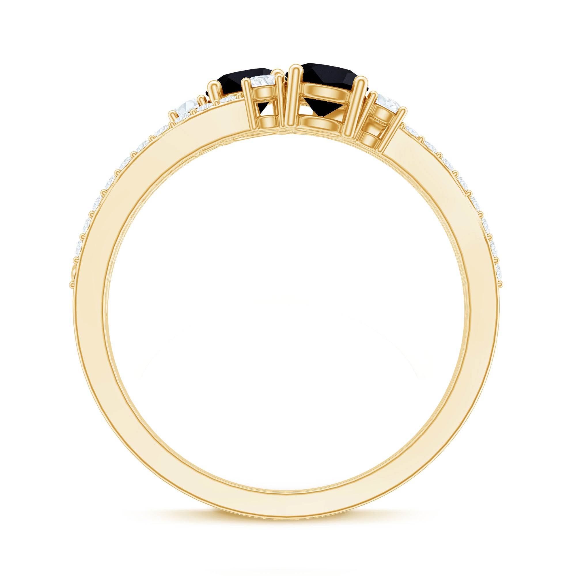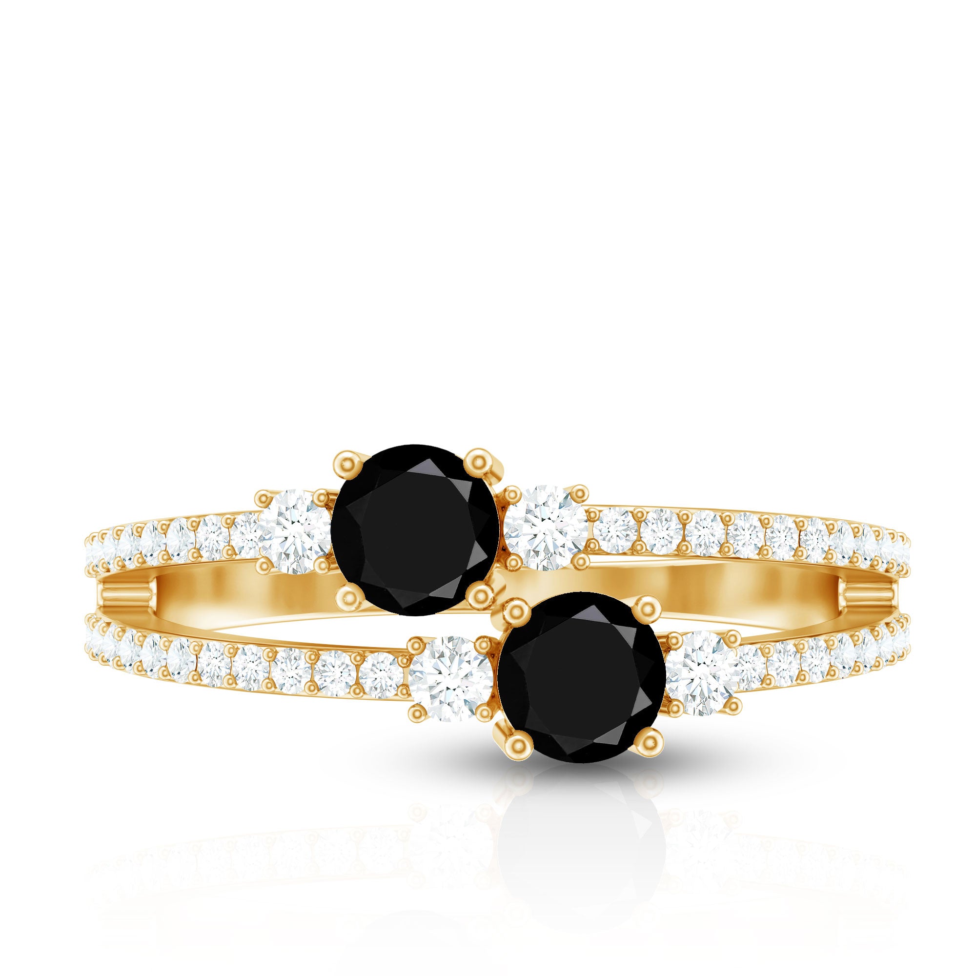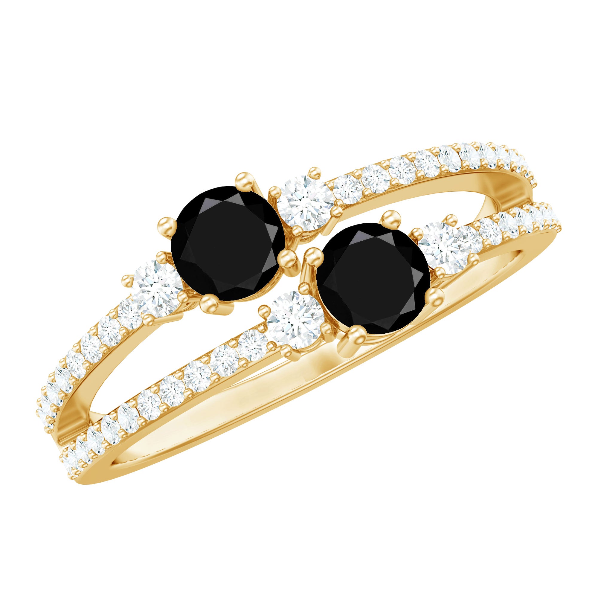 Our Toi et Moi Ring narrates the tale of two hearts uniting as one. This exquisitely crafted Black Onyx Promise Ring showcases a significant two-stone design, symbolizing the profound connection shared between two individuals. At its core, two round shape Black Onyx of 4mm - are positioned closely within a secure prong setting, representing you and your beloved. Black Onyx stones exhibit AAA quality, providing remarkable sparkle and brilliance that radiates with every movement. The ring features a split shank band that adds a contemporary flair, adorned with smaller diamond stones that elegantly embellish the band, forming a stunning frame around the center. This intentional design is not only visually striking but also carries a significant meaning. It serves as a reminder of a relationship founded on balance, trust, and unity. Whether presented as an engagement ring, an anniversary present, or a heartfelt gesture, this Split Shank Ring conveys its message eloquently. Offered in a variety of metal colors, materials, and ring sizes, it can be customized to reflect her personal style. This Onyx 2 Stone Ring is meticulously handcrafted and includes a gemstone certification to guarantee quality and authenticity. Additionally, it is presented in a sophisticated jewelry box, ready to be gifted or cherished.