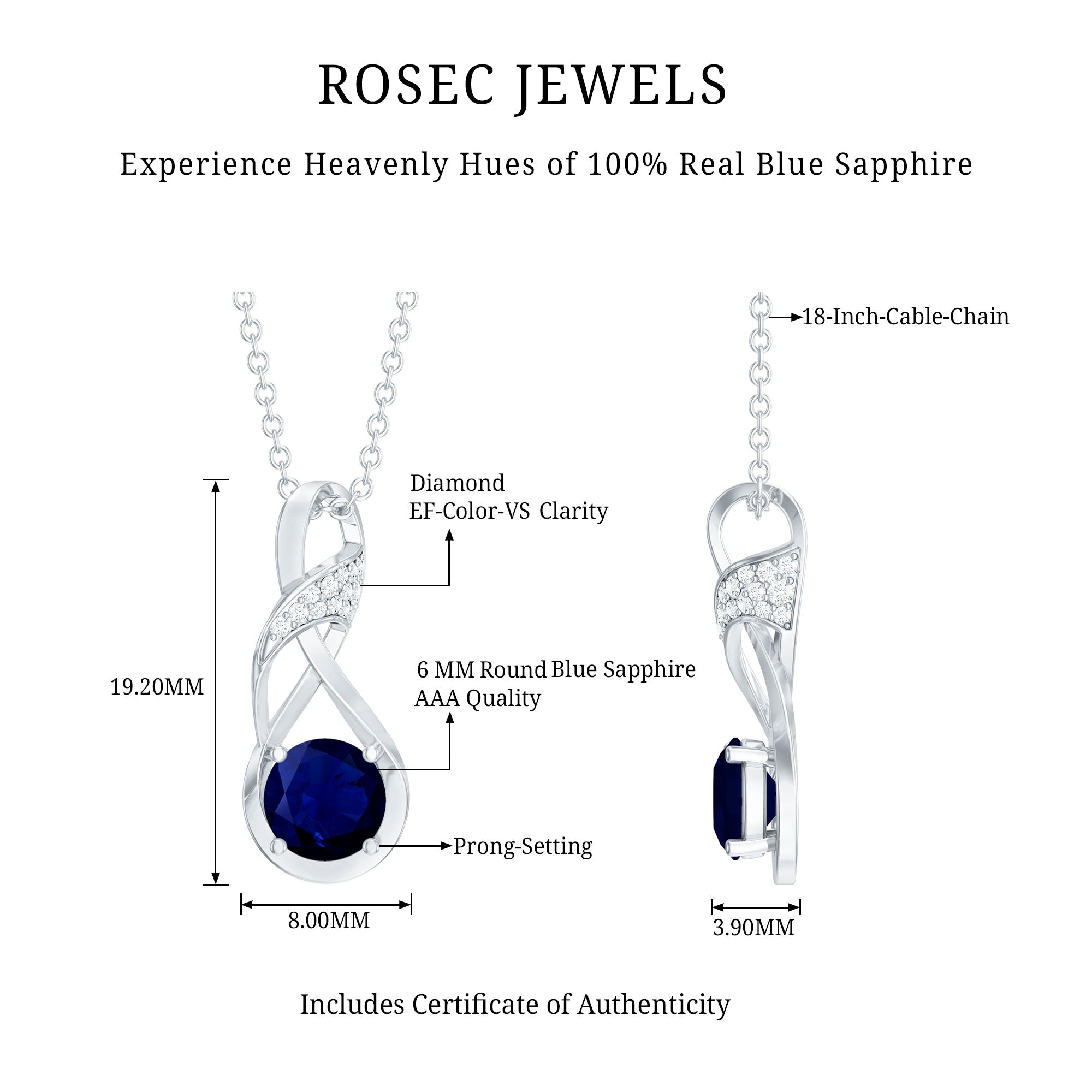 When it comes to showing love that lasts forever, nothing says it better than the infinity symbol. This Blue Sapphire Infinity Necklace is a beautiful way to express deep connection, endless love, and lasting memories. Crafted in sterling silver, this elegant Infinity Symbol Necklace features a soft, flowing infinity design with a modern twist. At the center of the loop sits a stunning 6 MM round Blue Sapphire of AAA quality, held securely in prong setting. A unique pattern over infinity sign is beautifully decorated with sparkling lab grown diamonds of EF color and VS clarity, adding just the right amount of shimmer to the piece. The Blue Sapphire Pendant hangs from a durable chain with a secure clasp, making it perfect for both everyday wear and special occasions. Whether worn alone or layered, this necklace is both timeless and meaningful. More than just a pretty accessory, this Blue Sapphire and Diamond Necklace is a symbol of promise, hope, and eternal love. It is a thoughtful gift for anniversaries, birthdays, or simply to show your love. Beautiful, elegant, and full of meaning, this Sapphire Drop Necklace is one you will treasure for years to come.