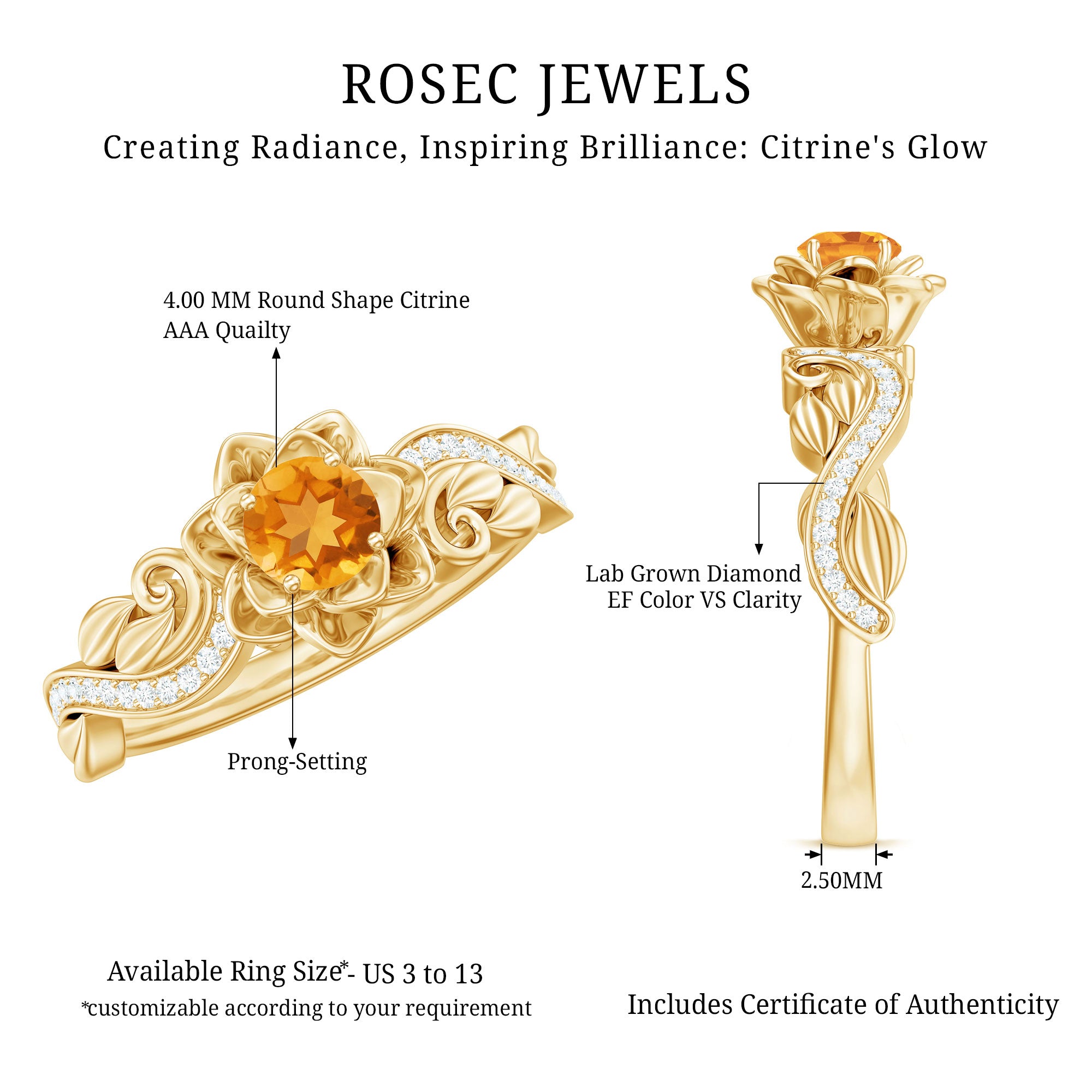There is something so joyful about this Rose Flower Engagement Ring, like a golden sunrise captured in a piece of jewelry. Perfect for the romantic at heart, this Citrine Engagement Ring brings the beauty of nature to life with a design inspired by blooming flowers and sunshine-filled days. Crafted in sterling silver, this Floral Engagement Ring features a glowing 4 MM round cut Citrine, set right at the heart of a detailed rose flower design. The AAA quality Citrine shines in a radiant golden hue, symbolizing happiness, clarity, and new beginnings. Surrounding the floral center are delicate leaf motifs on the band and a sparkling wave of EF-VS quality lab grown diamonds, adding soft brilliance to the overall design. This Nature Inspired Engagement Ring is not just jewelry, it is a little garden you can wear. Available in a variety of sizes and thoughtfully packaged in a premium box with a Certificate of Authenticity, this Citrine and Diamond Ring is the kind of piece she will cherish forever.