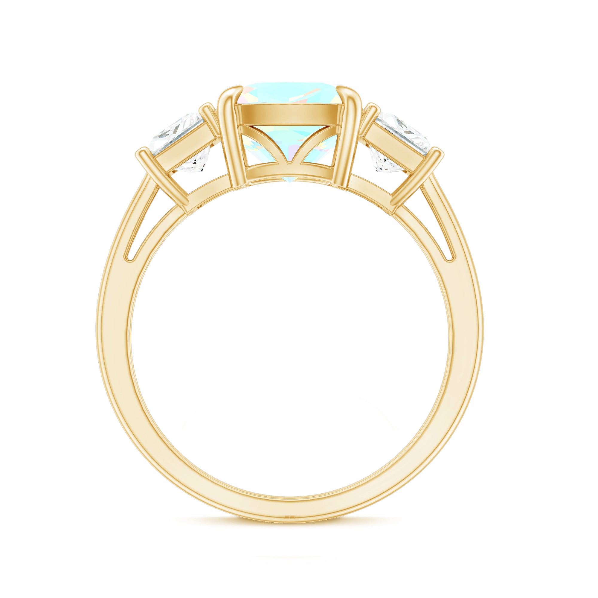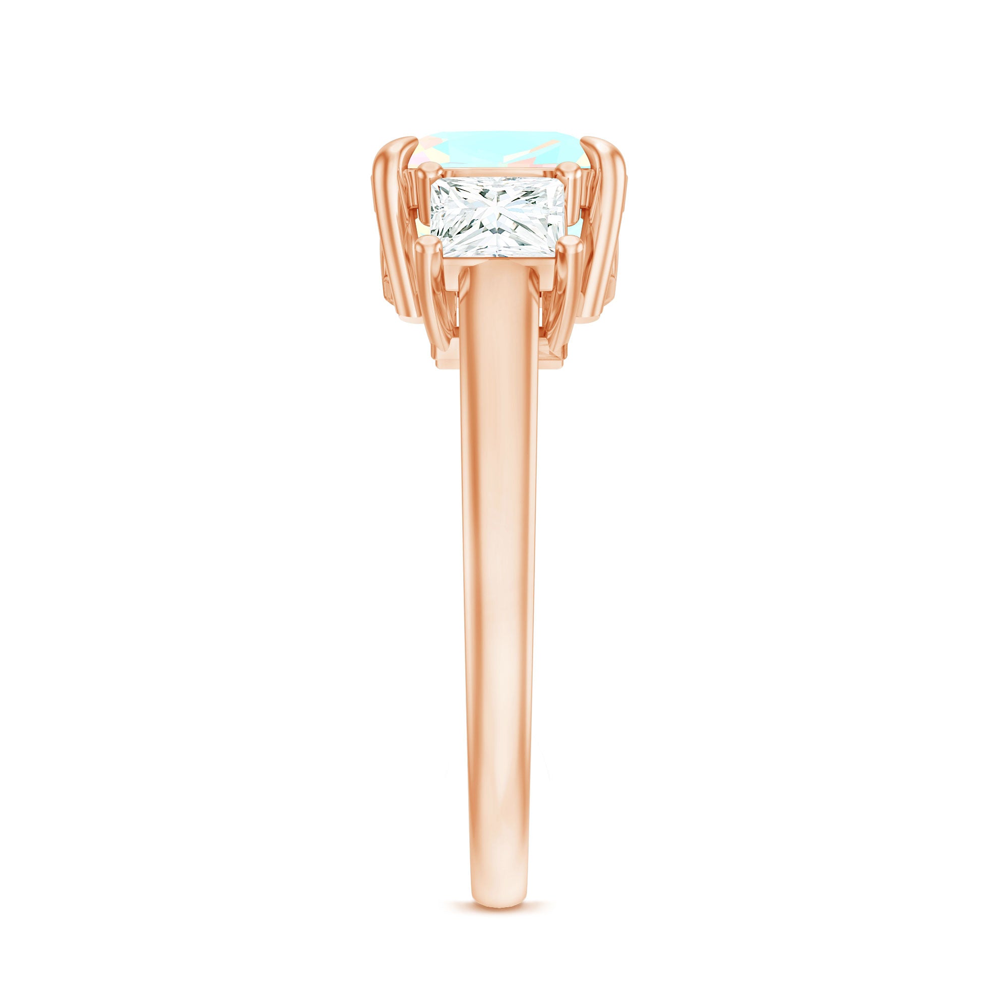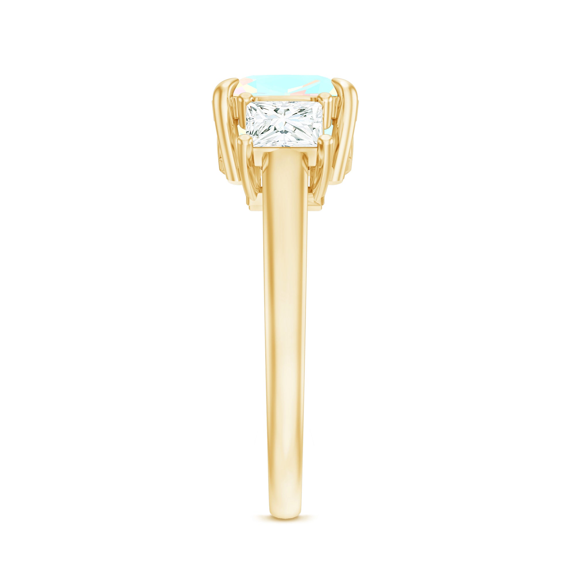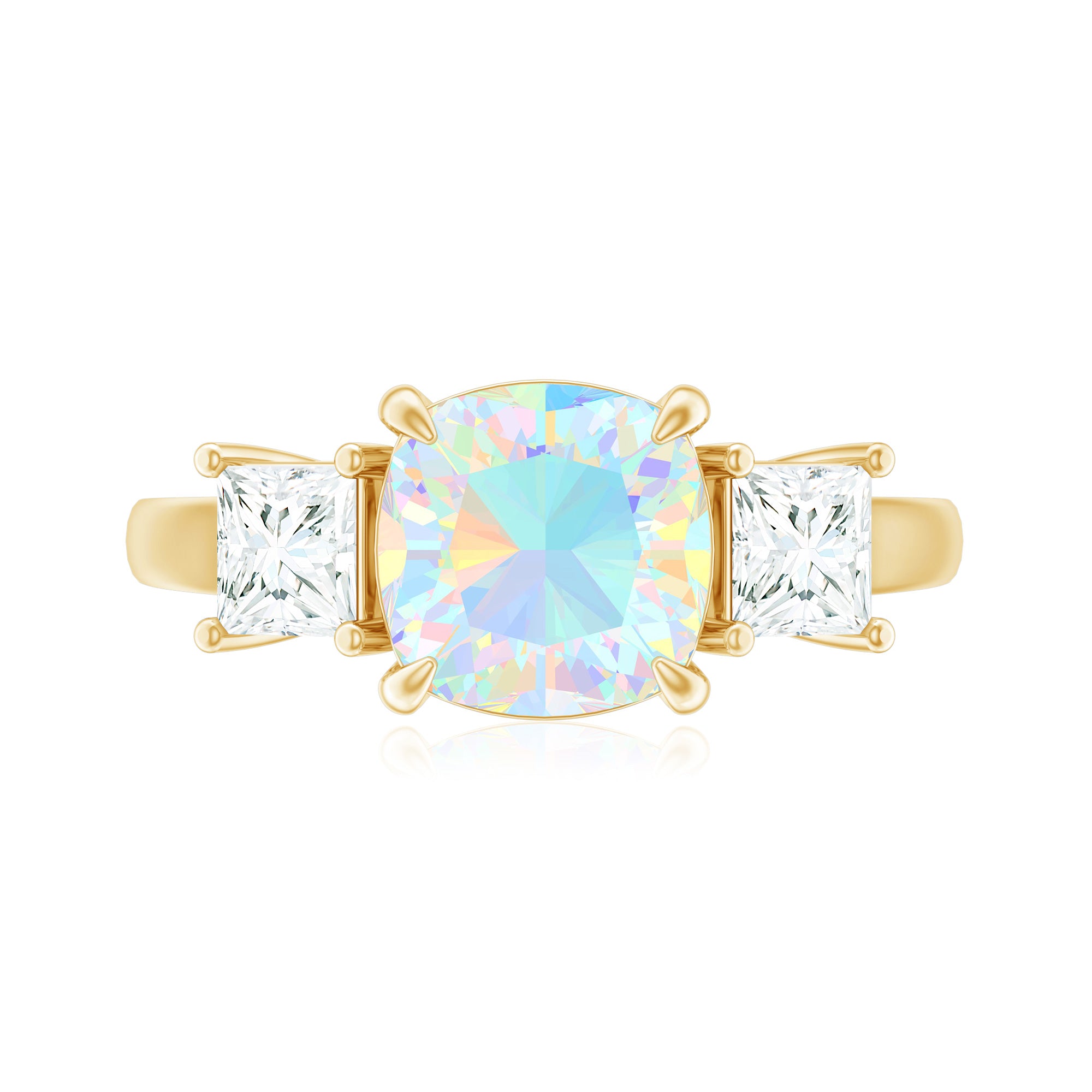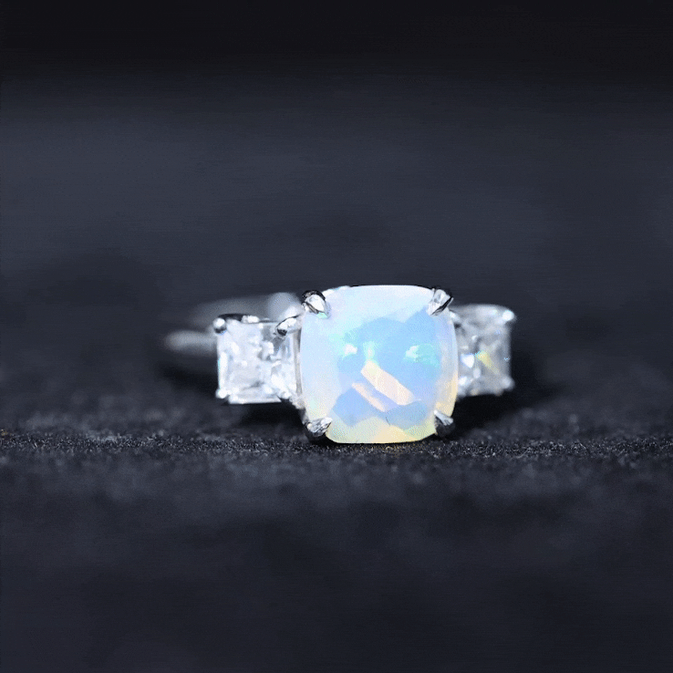 Celebrate past, present and forever with this 3 Stone Engagement Ring, a radiant design that tells your love story in shimmer and color. At the center, a glowing 8 mm Cushion Cut Ethiopian Opal steals the spotlight with its dreamy, iridescent play of colors dancing with every move. Flanked by two Princess Cut Moissanite stones on either side, the three stone design symbolizes the journey of your relationship. This Opal Engagement Ring is a reflection of your unique connection, crafted for the one who sees beauty in every detail. The Moissanite stones add sparkle, perfectly complementing the ethereal glow of opal, while the sleek band brings modern elegance to this timeless design. Ideal for proposals, anniversaries or simply celebrating everlasting love, this Past Present Future Ring comes in a variety of sizes and is elegantly packaged in a signature jewelry box. This Real Opal Engagement Ring is a stunning keepsake made to last a lifetime, meaningful, magical and unmistakably yours.
