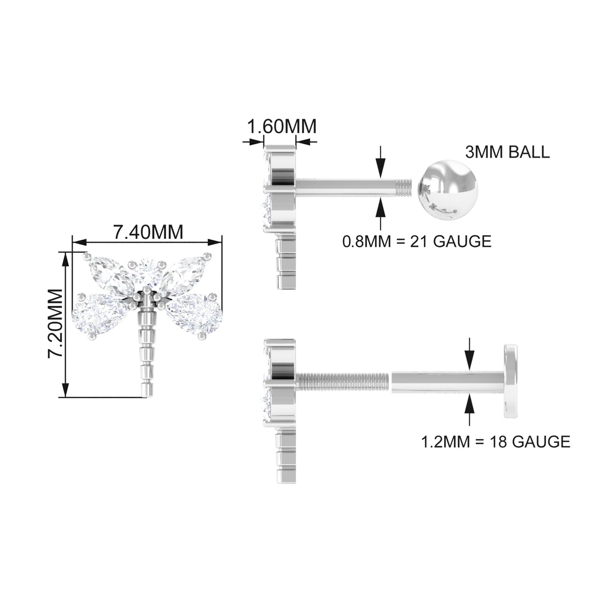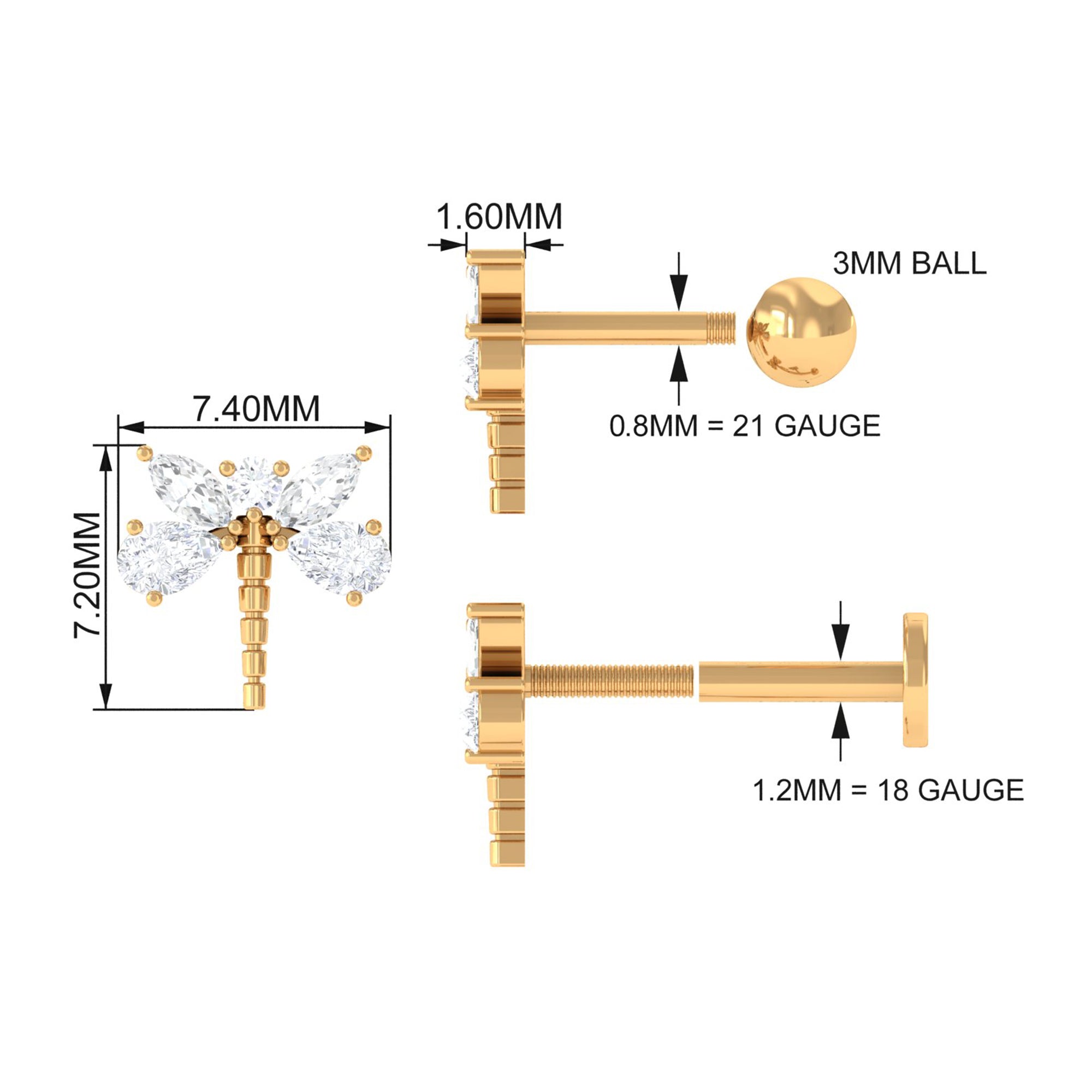 Whether you catch a glimpse of them buzzing through a garden or as jewelry, dragonflies never fail to bring delight!This Diamond Dragon Fly Earring features a Round Diamond, while Marquise and Pear Cut Diamonds studded as wings, all secured by Prong Setting, composed of Solid Metal. The Flat Back Closure ensures a secure fit, making it suitable for Tragus, Cartilage, or Upper Lobe Piercings.Take your fashion to new heights by pairing this Cute Earring with other ear jewelry, curating a dazzling ensemble thats bound to steal the spotlight at any gathering.