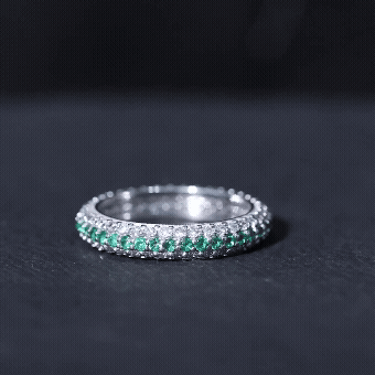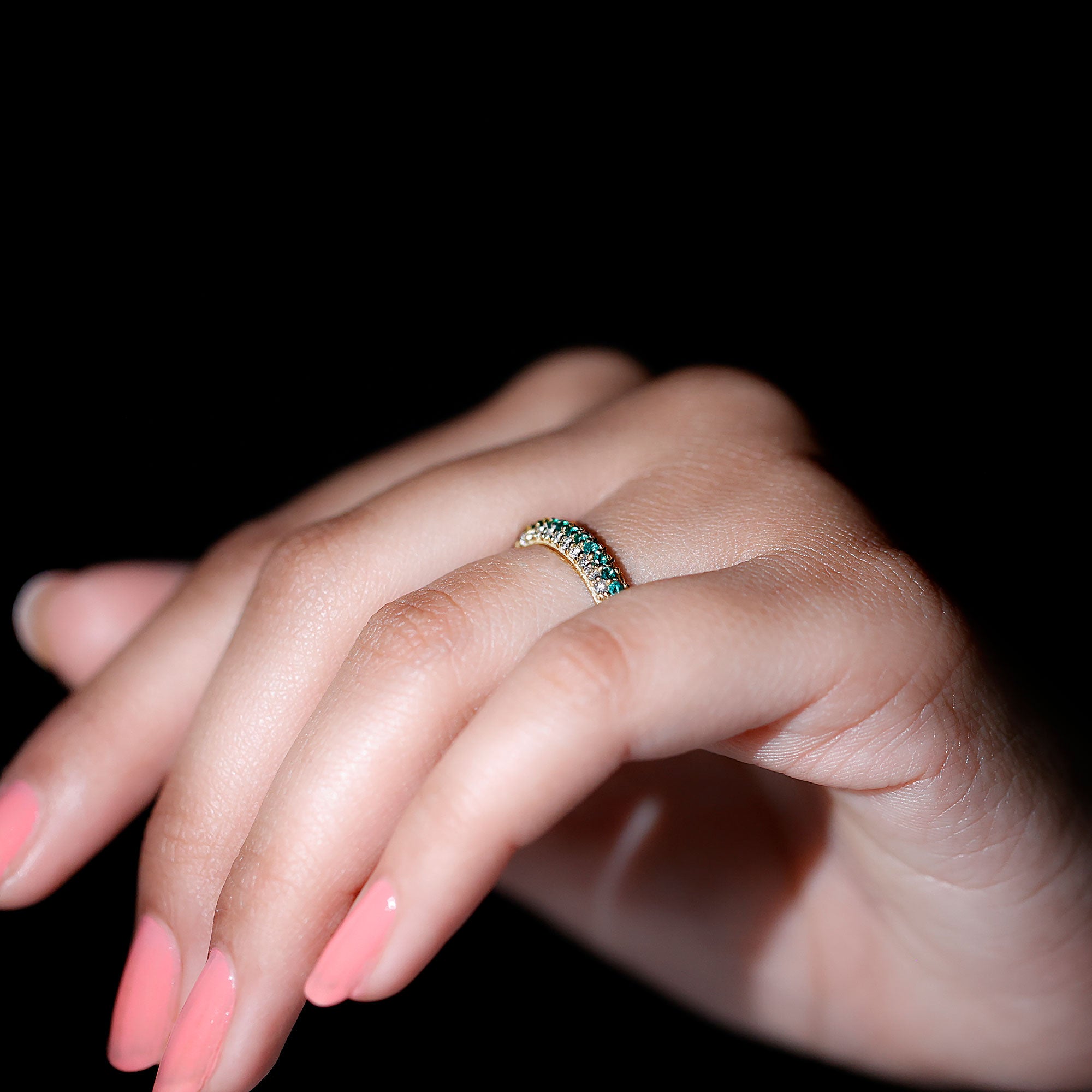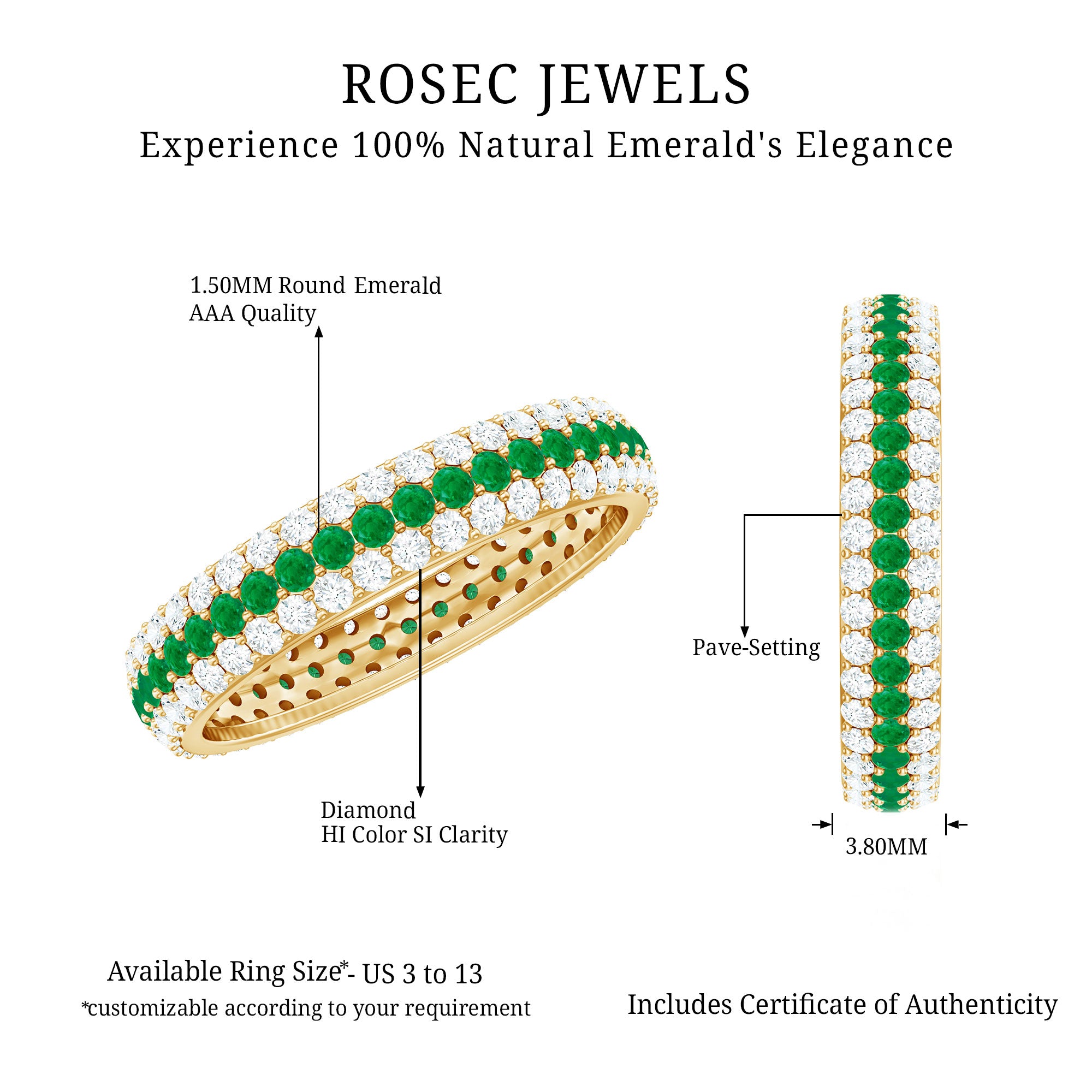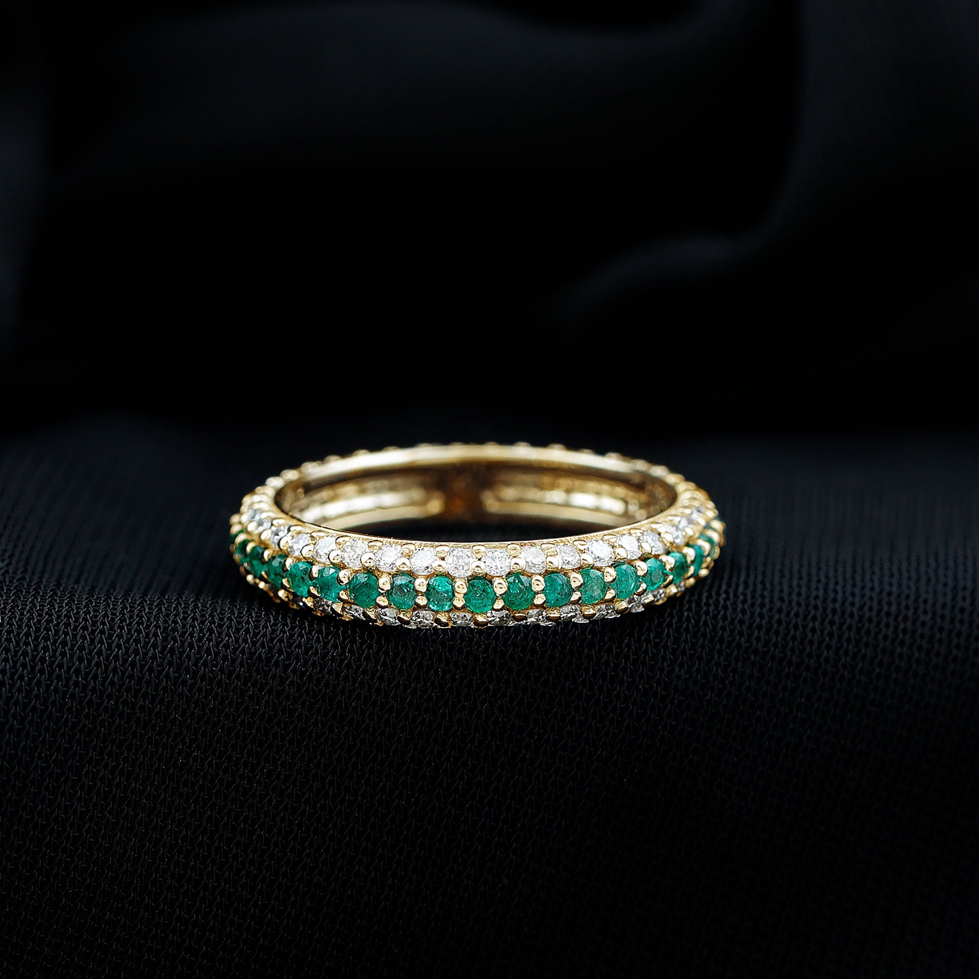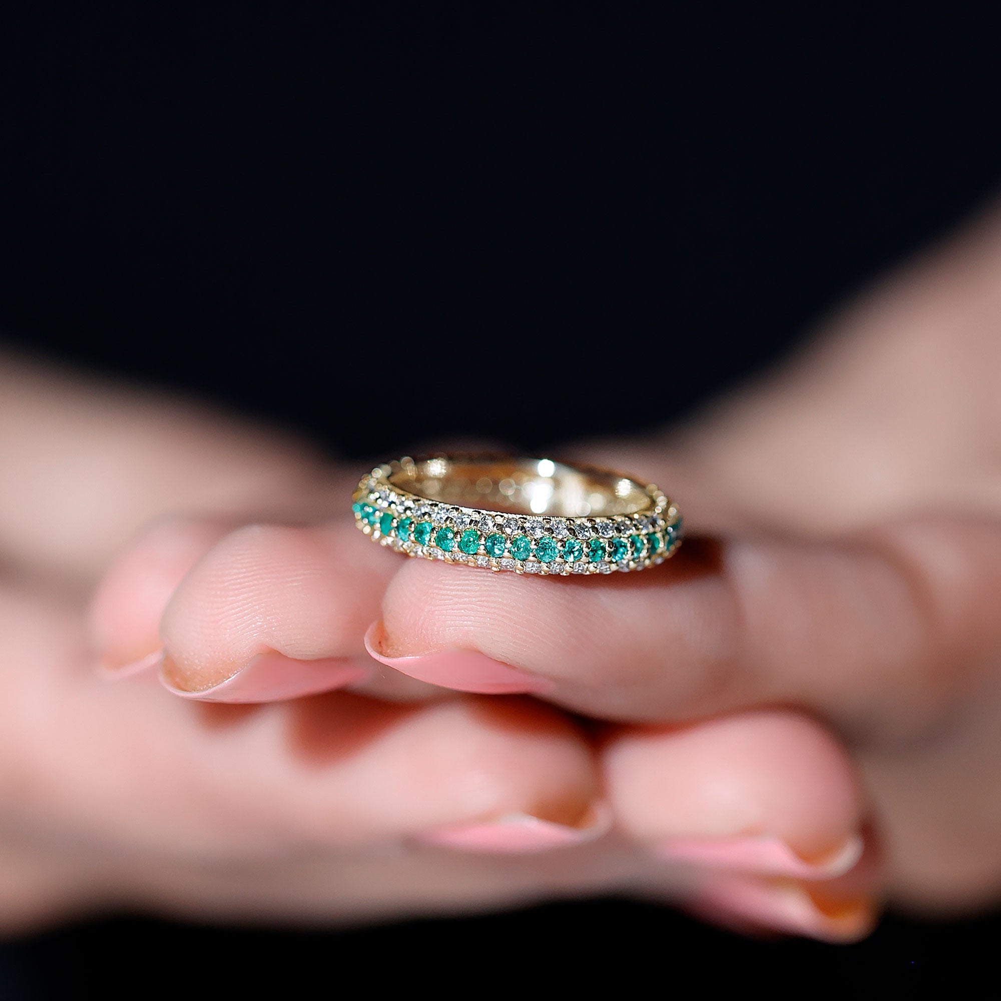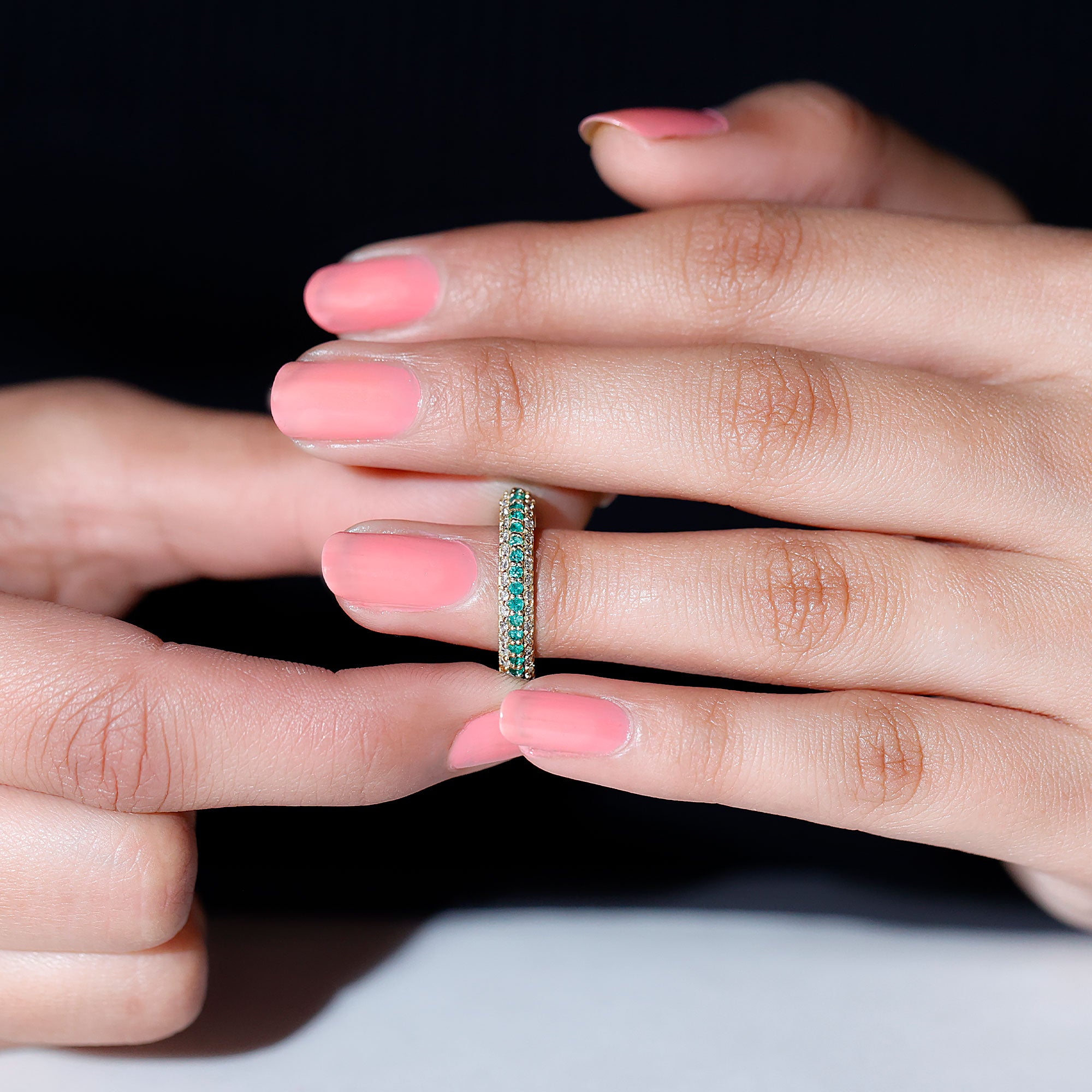 Looking for a ring that truly shows the strength and beauty of love? This Emerald and Diamond Band Ring is a perfect choice. It features a unique design with three rows that catch the eye. The middle row is filled with round cut emerald stones, shining bright with a rich green color. On each side of the emeralds, there are rows of sparkling diamonds that add extra shine and elegance. Together, these stones create a full eternity band that looks stunning from every angle. This Pave Wedding Band is not just beautiful but also full of meaning. It stands for a love that lasts forever and a bond that grows stronger with time. The combination of AAA quality emeralds and HI-SI quality diamonds gives the Three Row Eternity Band a magical touch, making it a special piece for any woman who wants to add color and sophistication to her style. The design is elegant yet classic, making it suitable for everyday wear or special occasions. It is a great choice as a wedding band or an anniversary gift, something that will always remind you of your cherished moments together. Made with care to last, this Emerald Wedding Band is a symbol of commitment and beauty. Its sparkling stones and timeless design make it a lovely heirloom to pass down and treasure for years to come.