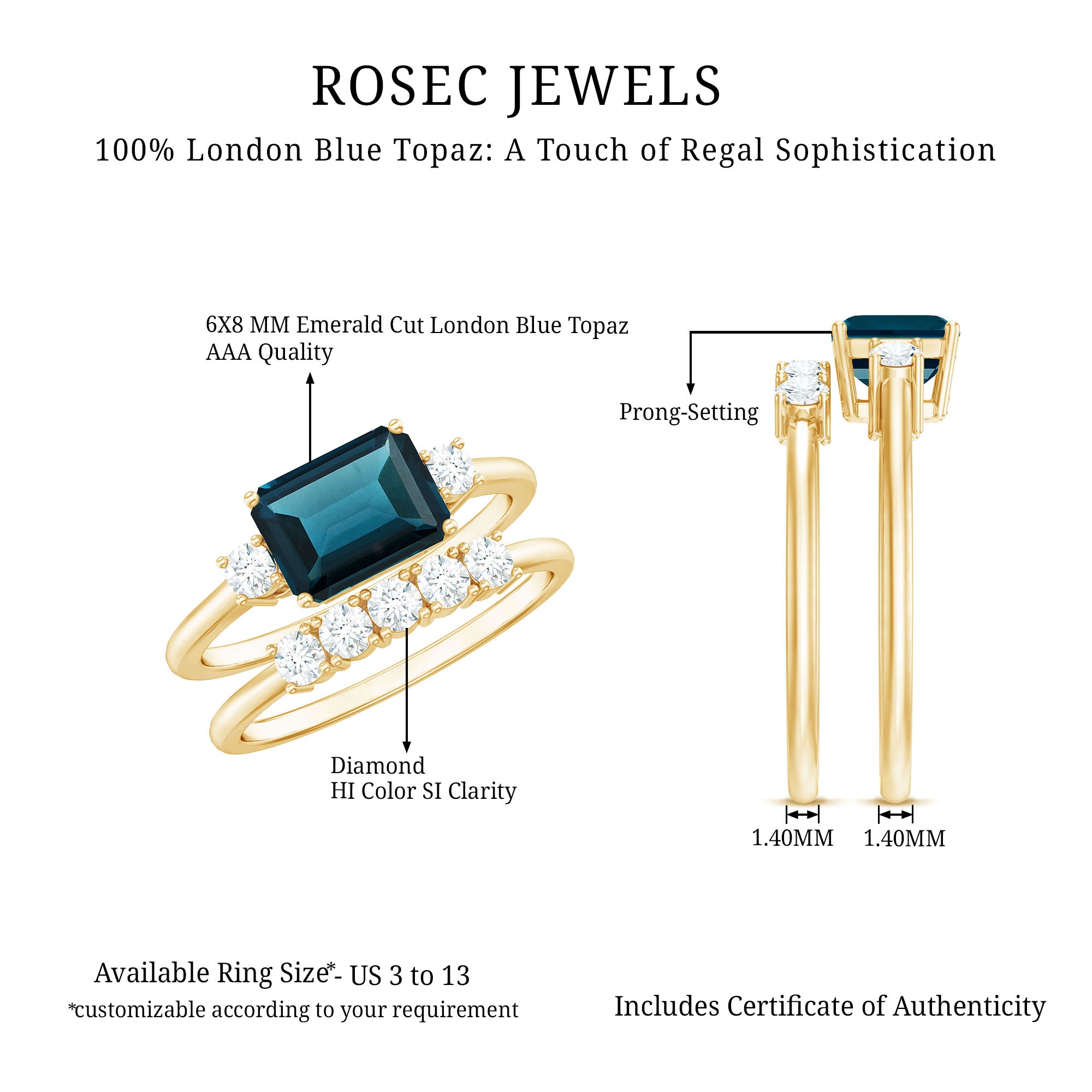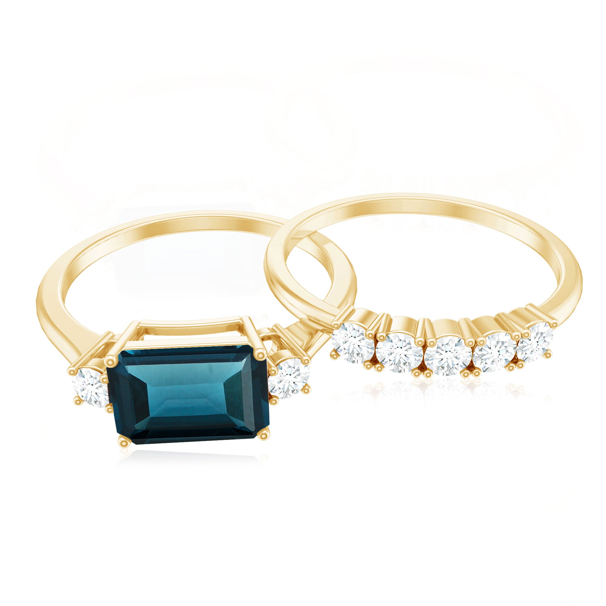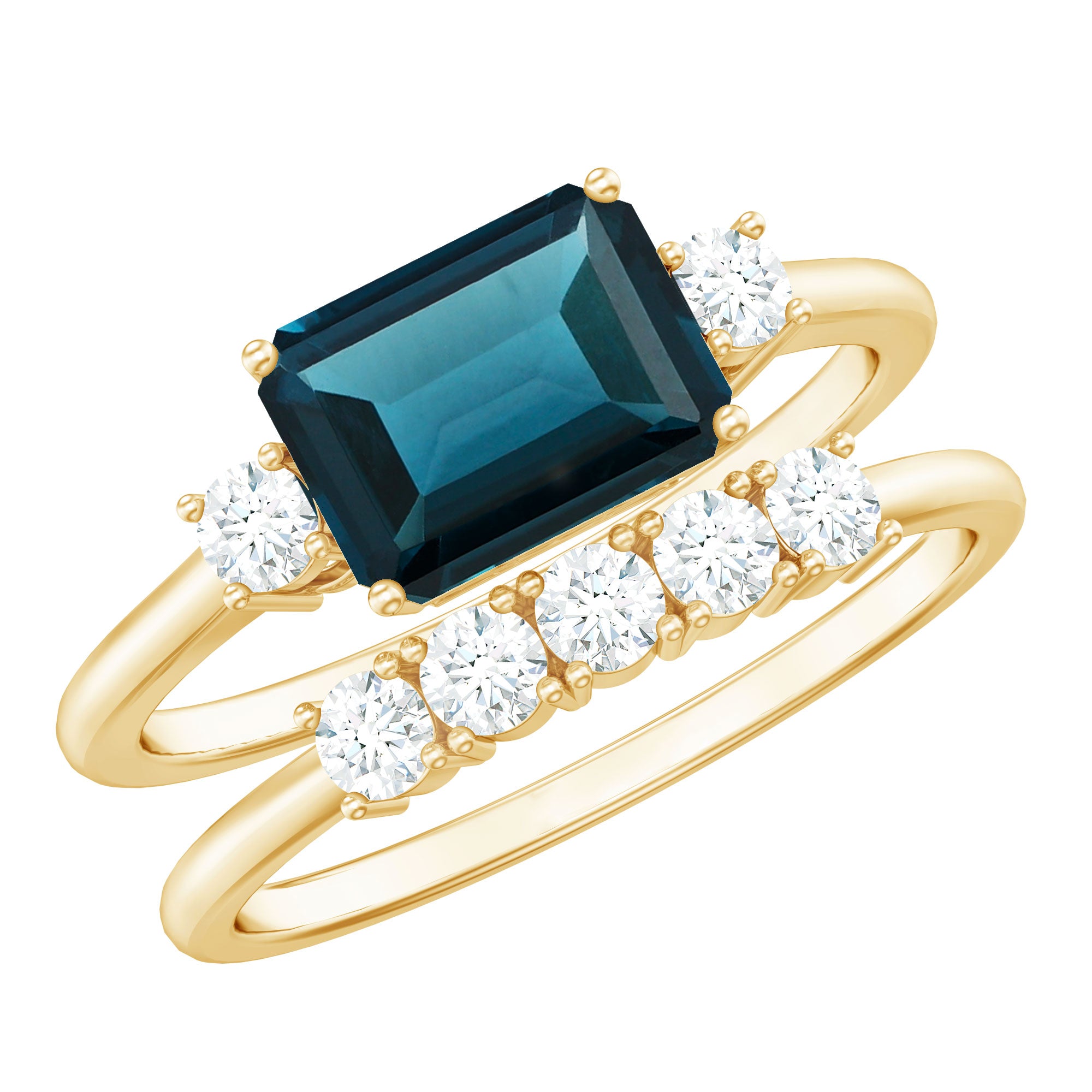 Are you in search of something unique yet rich in significance. This Blue Topaz Wedding Ring Set could be the ideal choice. It is designed for individuals who desire their bridal set to embody both timeless elegance and individuality. At its core lies a 6X8 MM emerald cut London Blue Topaz, positioned sideways in an east-west orientation that imparts a contemporary feel. The vibrant blue gemstone stands out beautifully, and the horizontal arrangement introduces a fashionable element to the overall design. Flanking the blue topaz are two dazzling real diamonds that provide a gentle sparkle, harmonizing with the striking appearance of the central stone. The accompanying stackable wedding band is understated yet charming, adorned with five closely set round diamonds that align seamlessly with the engagement ring. Collectively, they offer a classic aesthetic infused with just the right touch of brilliance. This Emerald Cut Wedding Ring Set is an excellent choice for anyone who appreciates bold hues and significant details. It is comfortable enough for daily wear while still feeling extraordinary for those special occasions. Meticulously crafted and easy to wear, this London Blue Topaz Ring Set is dedicated to honoring love in your unique style, with elegance, emotion, and a hint of sparkle.