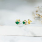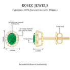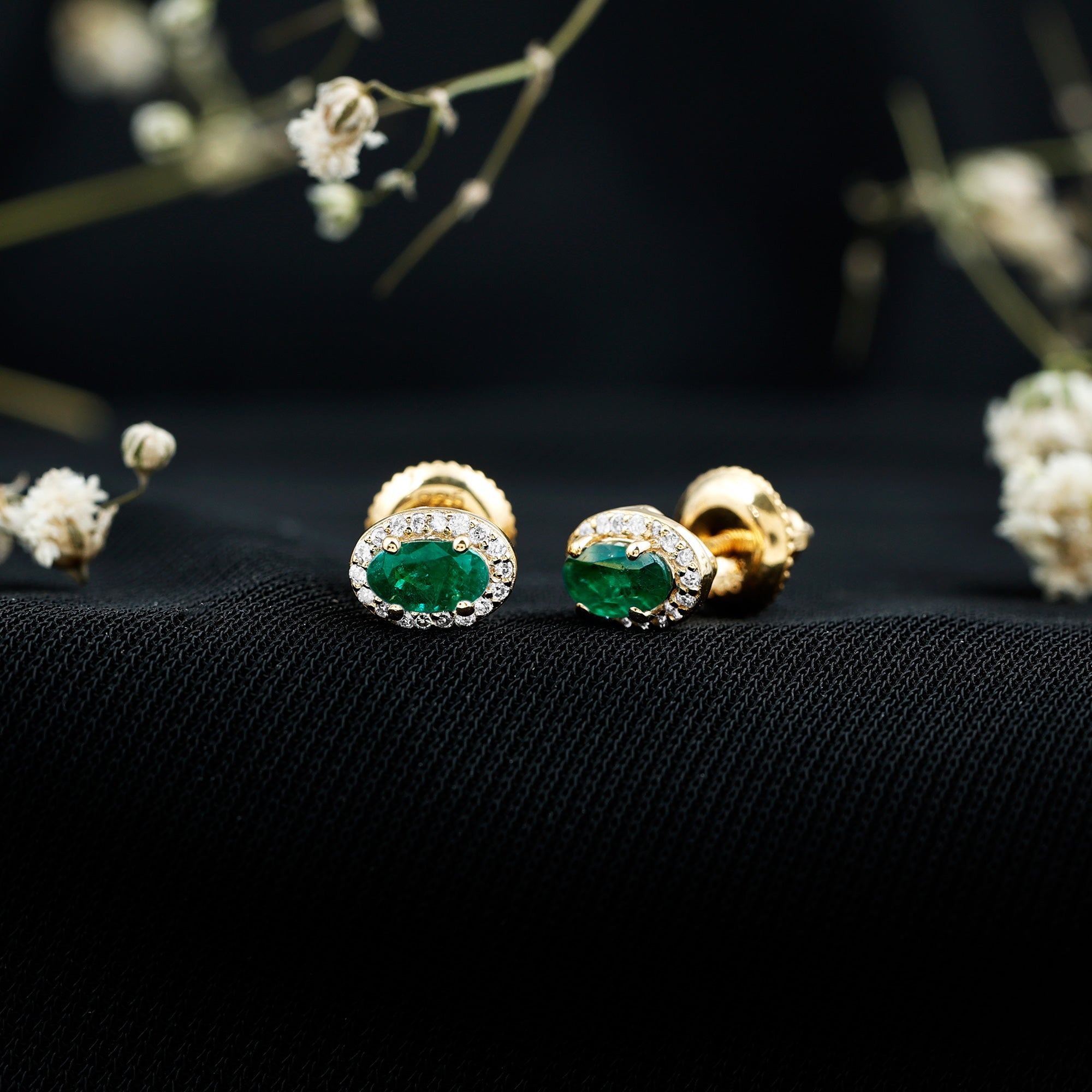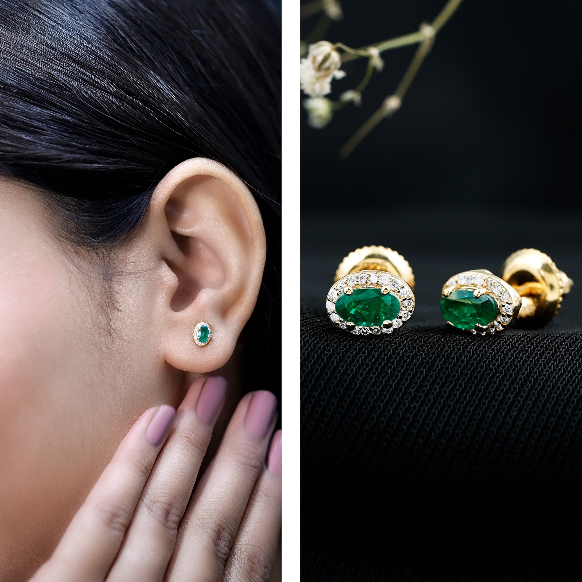 These beautifully made Emerald Stud Earrings bring a timeless charm to any jewelry collection. Crafted in sterling silver, the design is simple, elegant, and easy to wear for any occasion. Each earring features a 3X5 MM oval shaped Emerald set securely in prong setting. The rich green color of the emerald is known for its beauty and meaning, symbolizing growth, renewal, and love. It is also the birthstone for May, making these Green Emerald Earrings a thoughtful and meaningful gift. A delicate lab grown diamond halo of round shaped stones surrounds each emerald, adding just the right amount of sparkle. These diamonds are EF color and VS clarity, creating a clean and bright look that enhances the center stone without overpowering it. Made with AAA quality emeralds, these May Birthstone Earrings are designed to last and be loved for years. The screw back closure keeps them secure and comfortable for everyday wear, while the light weight makes them easy to wear all day. These Emerald and Diamond Earrings are perfect for birthdays, anniversaries, or simply as a gift to yourself. Whether worn with casual clothes or dressed up for a special event, they offer a soft, classic look that never goes out of style. This pair comes in a signature jewelry box and includes a gemstone certificate for authenticity.