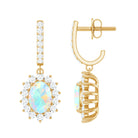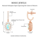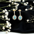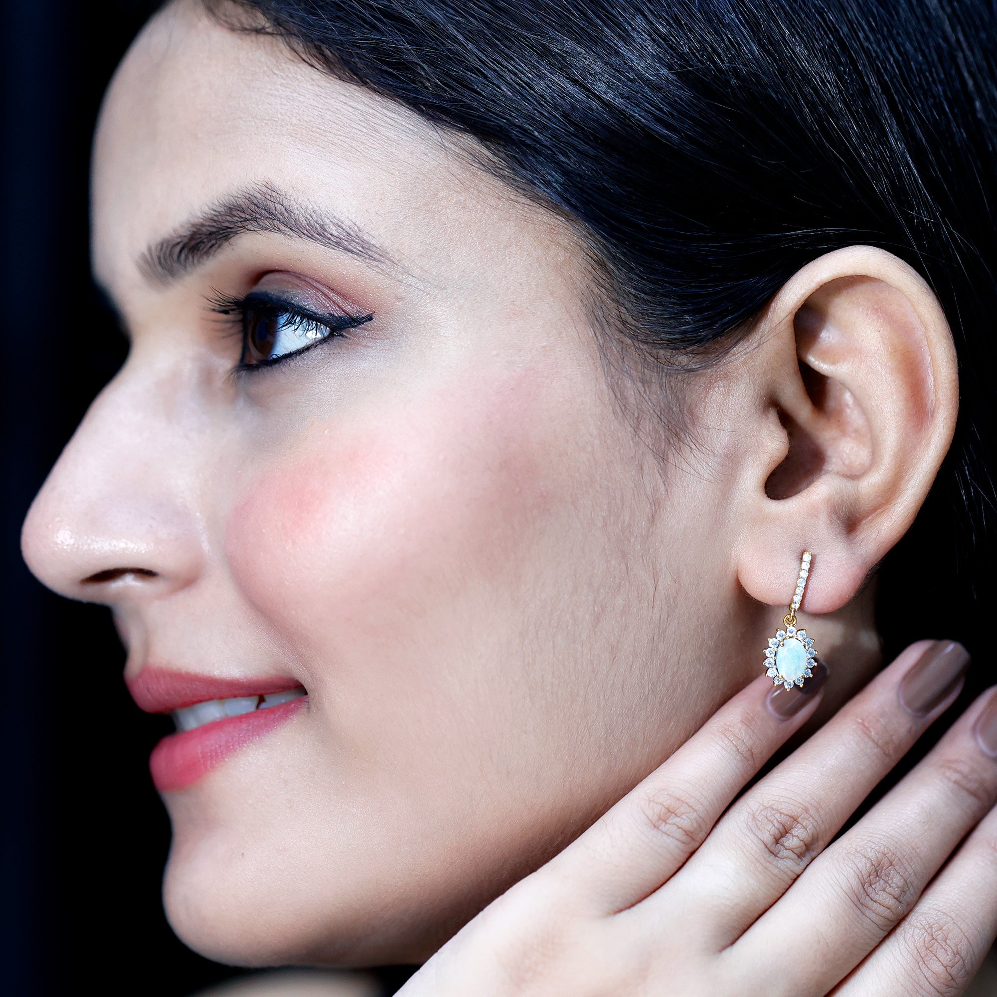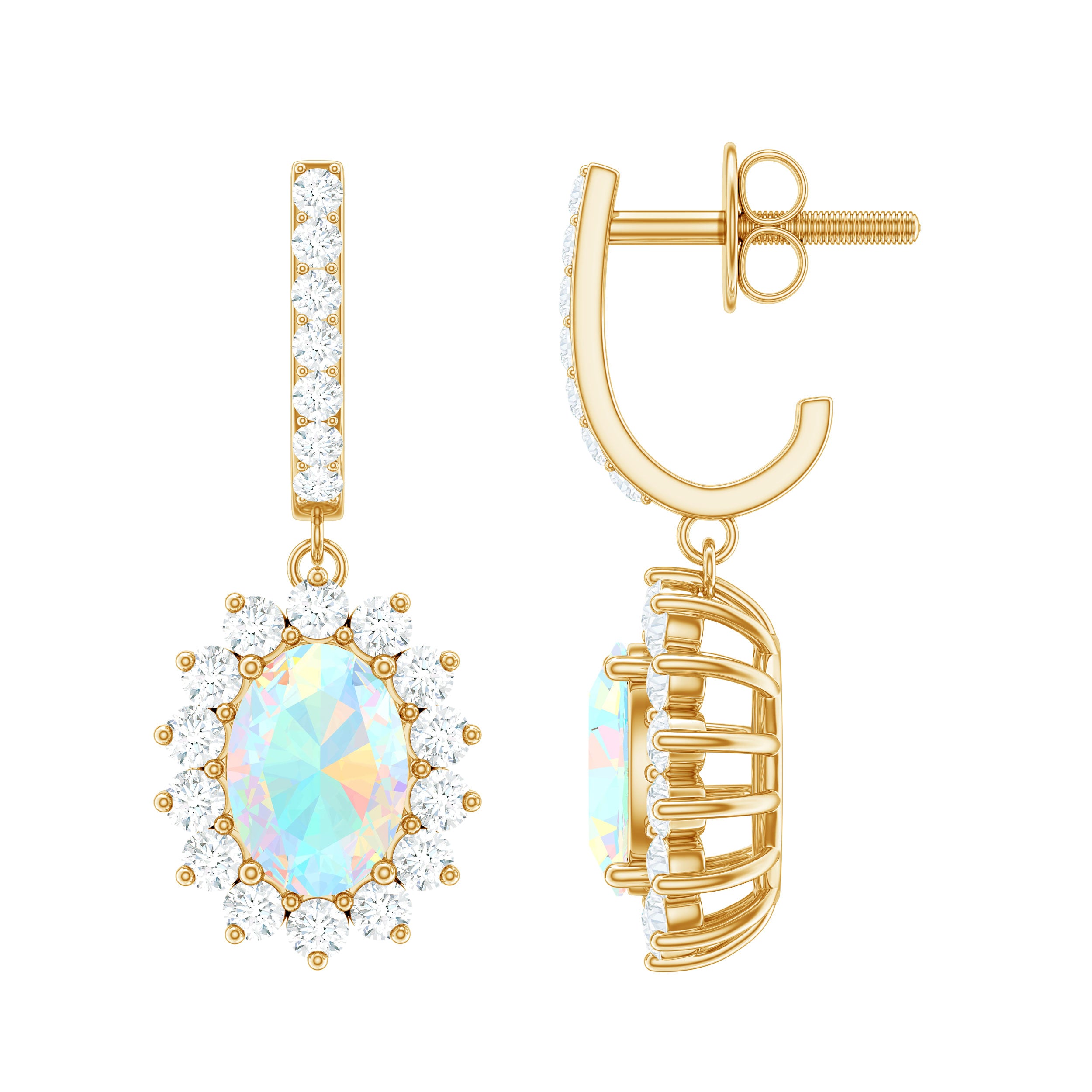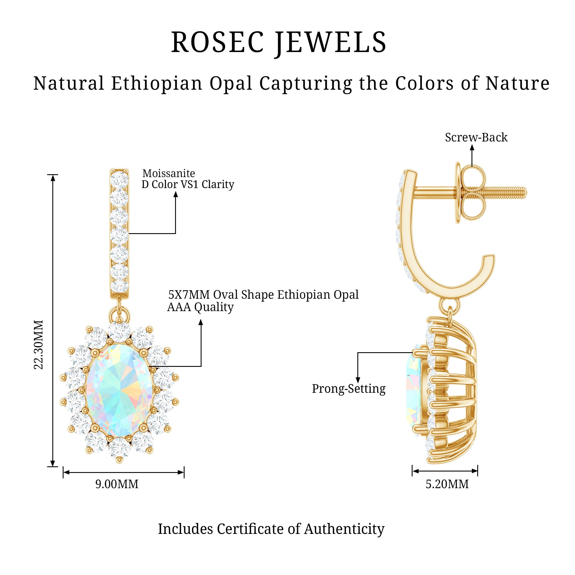 These beautiful Hoop Drop Earrings feature AAA quality Ethiopian opals as the main stones. Each opal is oval shaped, measuring 5X7 MM, and is set in secure prong setting. Around each opal, there is a halo of D-VS1 quality moissanite gems, which add extra sparkle and shine. The Ethiopian Opal Earrings have a modern J-hoop design that is studded with moissanite gems. This style gives them a fashionable and elegant look. They are perfect for everyday wear as well as for special occasions. The opals show a stunning play of colors, making each pair unique and eye-catching. These Opal and Moissanite Earrings are made from high-quality materials, ensuring they are strong, durable, and long-lasting. They are designed for comfort, making them easy to wear throughout the day. The screw-back closure keeps the Halo Drop Earrings secure, so you don’t have to worry about losing them. The versatile design means these Oval Opal Earrings will match any outfit, whether casual or formal. They are ideal for anyone who loves jewelry that makes a statement.