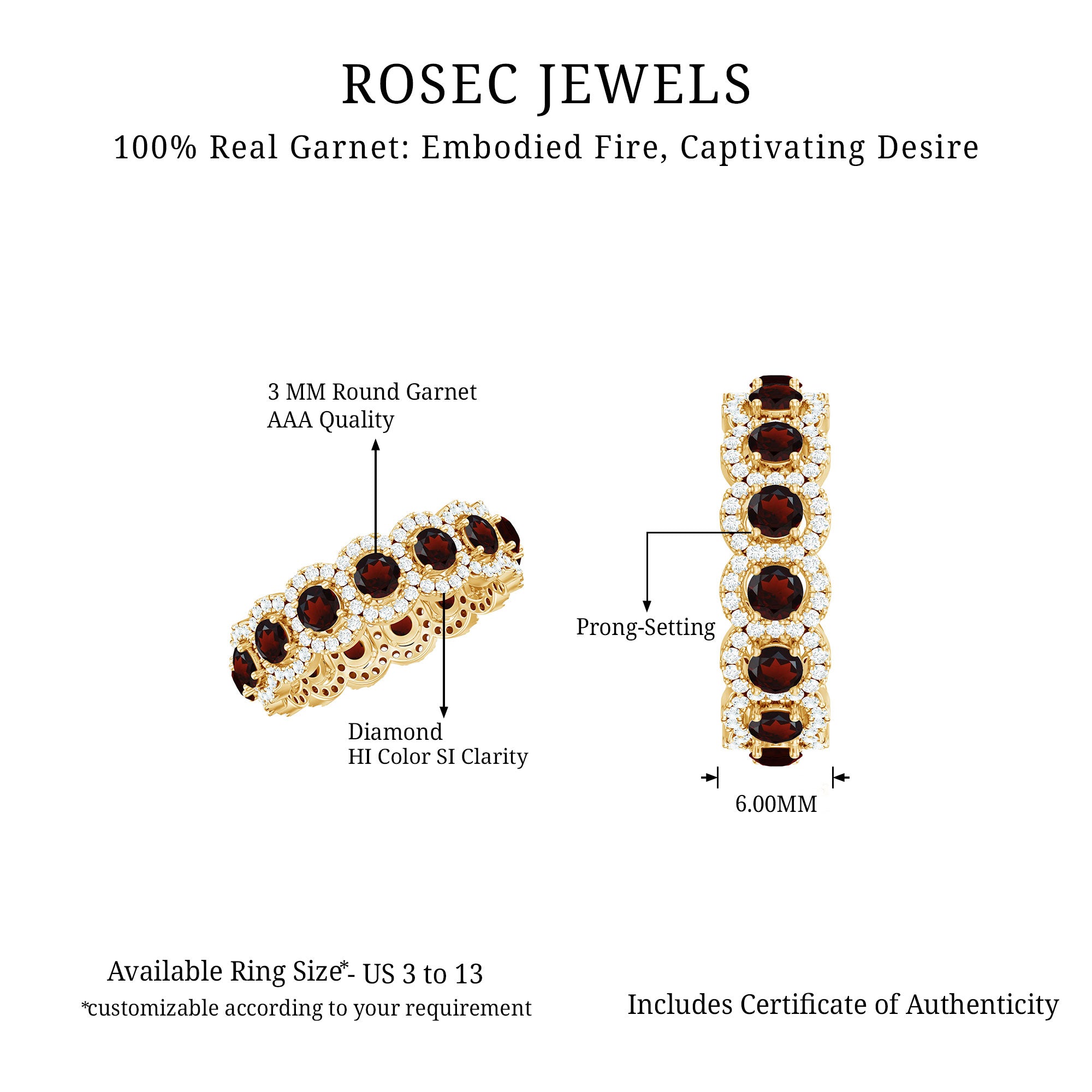 Eternal love feels even more magical when expressed through a ring that holds light in every detail. This Eternity Wedding Band with its deep Red Garnet and dazzling Moissanite stones is crafted to symbolize a bond that never fades. The warm 3 mm Round Shape Garnet stones circling the band, each embraced by a Halo of sparkling Moissanite stones, creating a soft glow that catches the heart as much as it catches the eye. The design feels poetic, like a promise whispered between two souls. Its deep red hues reflect passion and devotion, while the sparkling Moissanite stones add a touch of brilliance that feels timeless and modern all at once. Made to be cherished for a lifetime, this Garnet Eternity Band comes in a variety of sizes to ensure the perfect fit for your forever person. Presented in a signature jewelry box, this Garnet Ring for Women is a beautiful reminder of the journey you are choosing to walk together, hand in hand, heart to heart, shining brighter with every shared moment.