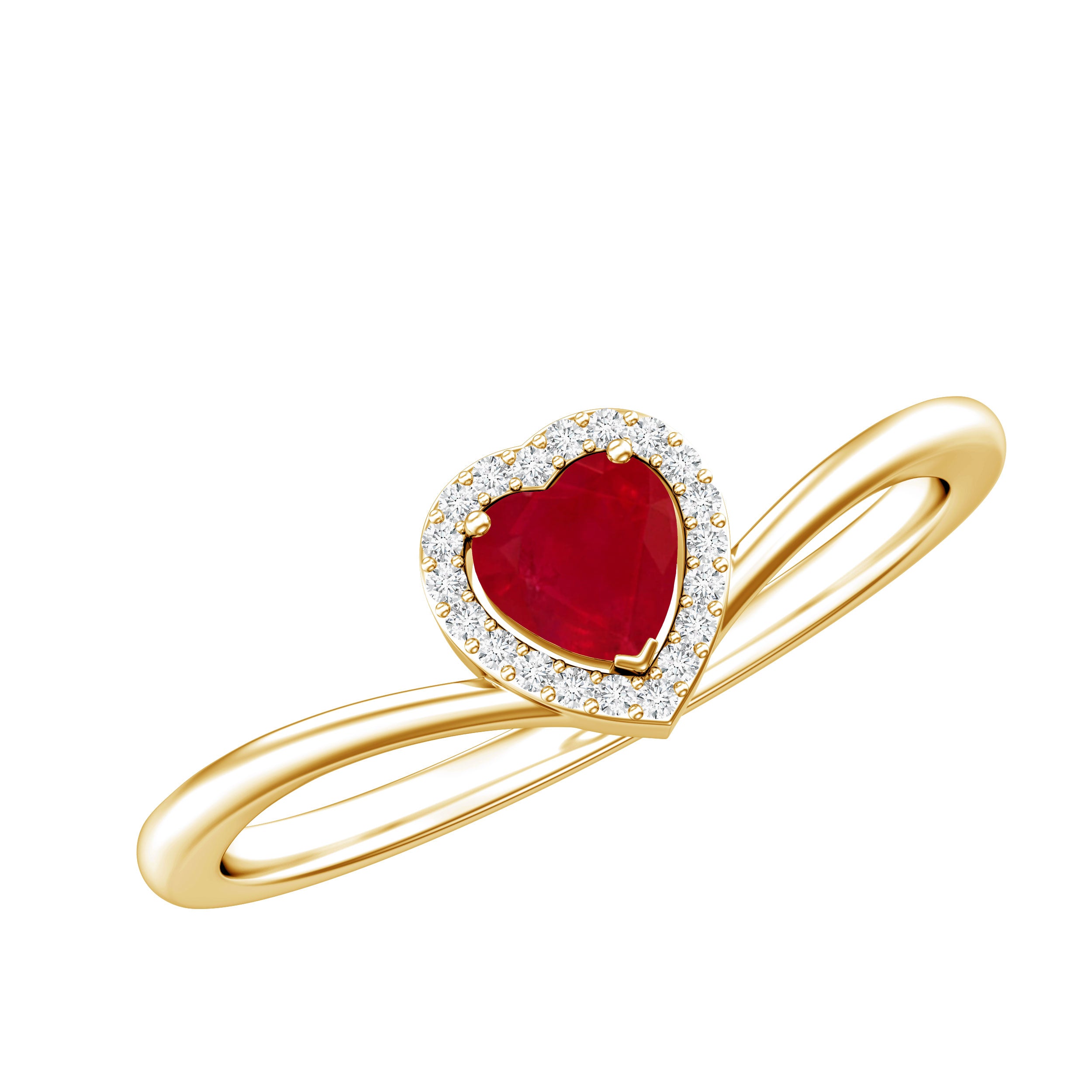 Promise of love captured in a timeless design, this Heart Promise Ring is a celebration of devotion and connection. At its center rests a 4 mm Heart Shape Ruby set in Prong Setting, glowing with a rich red that draws the eye and stirs the heart. Encircling the Ruby is a Halo of sparkling Diamond stones, enhancing its brilliance and giving the ring a graceful look. The heart shape carries a universal symbol of love and affection, making this Ruby Promise Ring a declaration, a cherished reminder of commitment and tender emotion. The V shaped band adds a modern twist, elegantly hugging the finger and highlighting the central AAA Quality Ruby. Perfect as a promise ring, an anniversary gift or a meaningful token of a special bond, this Ruby Heart Ring speaks to enduring devotion and shared moments that last a lifetime. On the finger, this Ruby Diamond Ring shines with subtle sophistication, its balanced design offering both elegance and a touch of romance. Delivered in a signature jewelry box and available in a range of ring sizes, this Chevron Ring is ready to mark a promise, a memory or a chapter of love that will continue to grow endlessly.