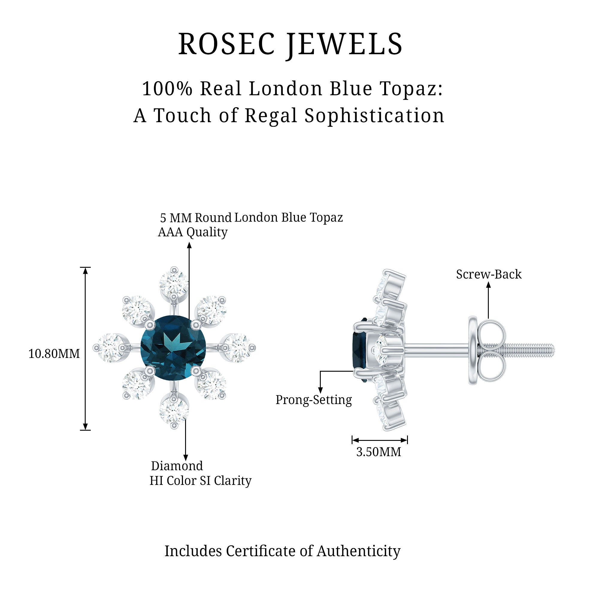 Bring a touch of nature’s charm to your collection with these London Blue Topaz Stud Earrings. The design is inspired by the delicate beauty of a blooming flower, creating a look that feels fresh and elegant. They feature a 5 MM round cut London Blue Topaz securely set in prongs at the center, offering a captivating blue that stands out beautifully. Surrounding the center stone are small bright diamonds that form a floral pattern, creating petals that add sparkle. The contrast between the AAA quality blue topaz and the sparkling HI-SI quality diamonds gives these Flower Stud Earrings a refined and balanced appearance. The Blue Topaz and Diamond Earrings are designed for comfort as well as style, with secure screw back closures that keep them in place throughout the day. Their lightweight and thoughtful design makes them easy to wear from morning to evening, whether for casual outfits or more formal occasions. This duo comes in a carefully crafted jewelry box, ready to be gifted or treasured as a personal keepsake. These Topaz Flower Earrings are a meaningful and stylish choice for birthdays, anniversaries, or special surprises.