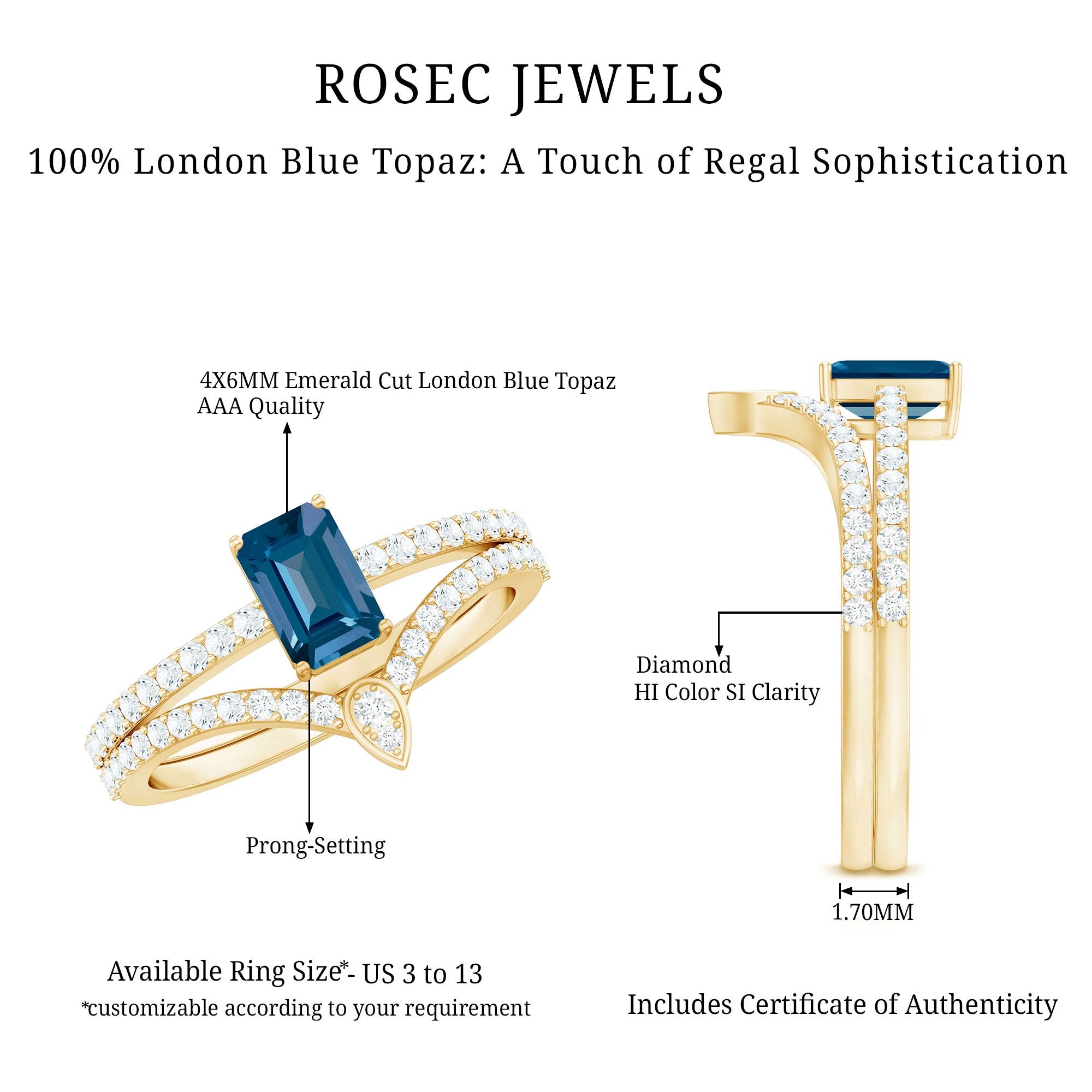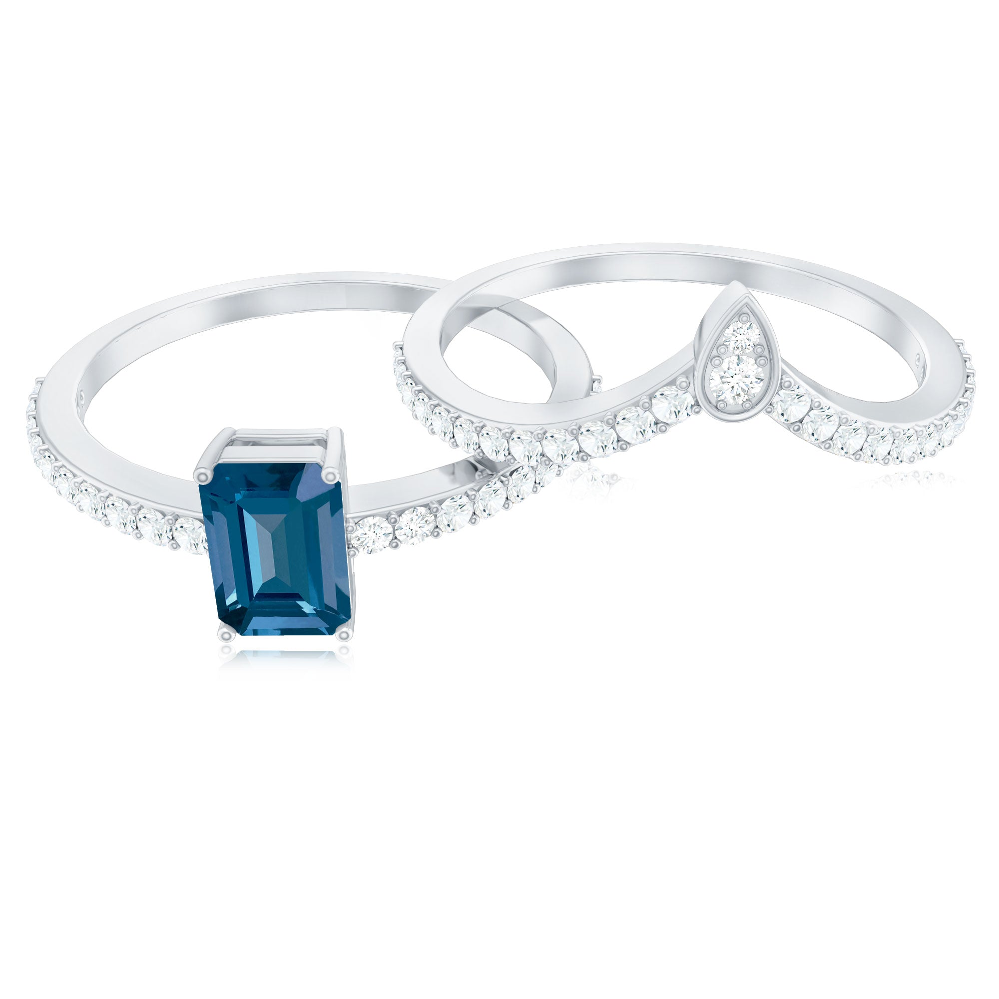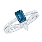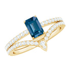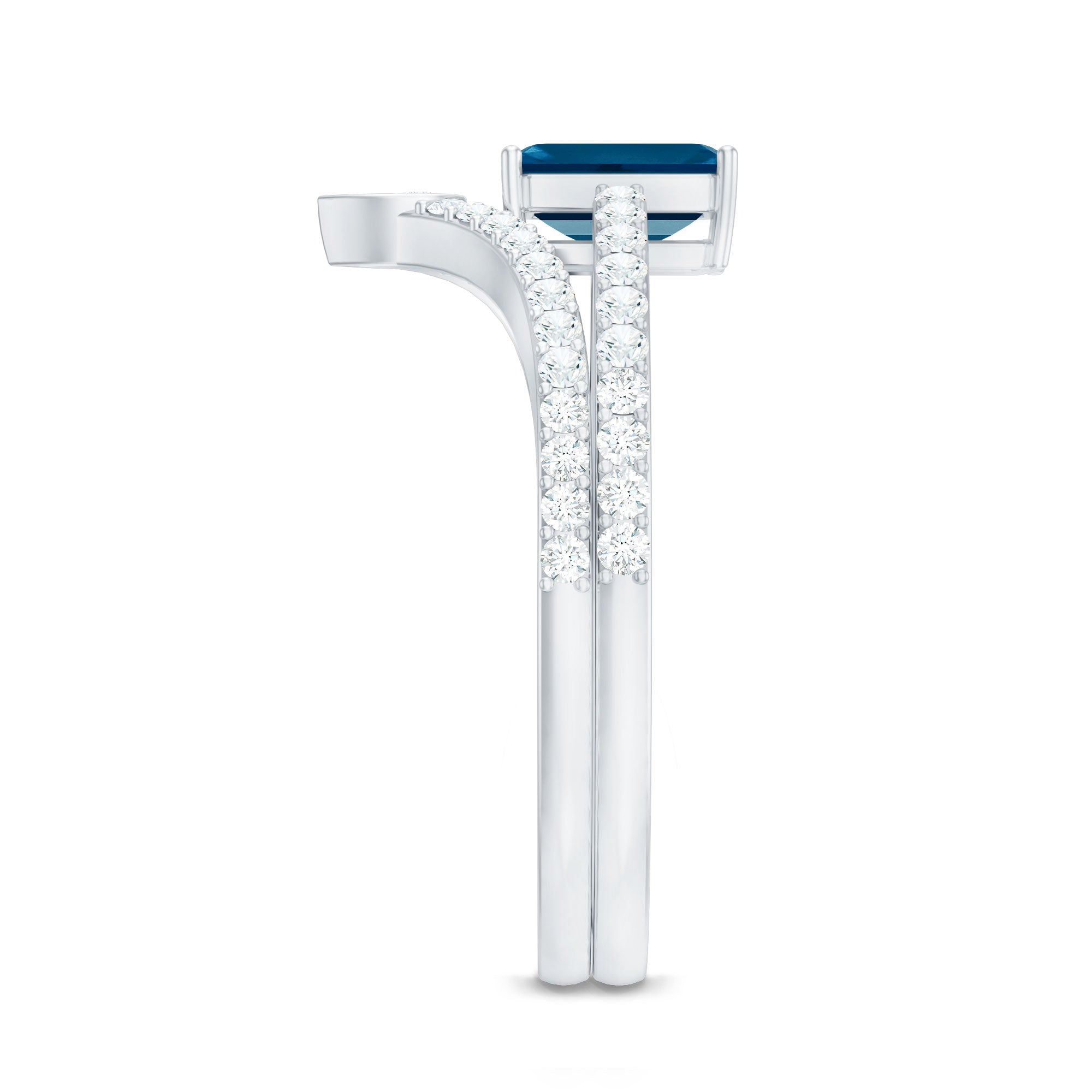 Genuine London Blue Topaz Emerald Cut Engagement Ring Set with Diamond Band