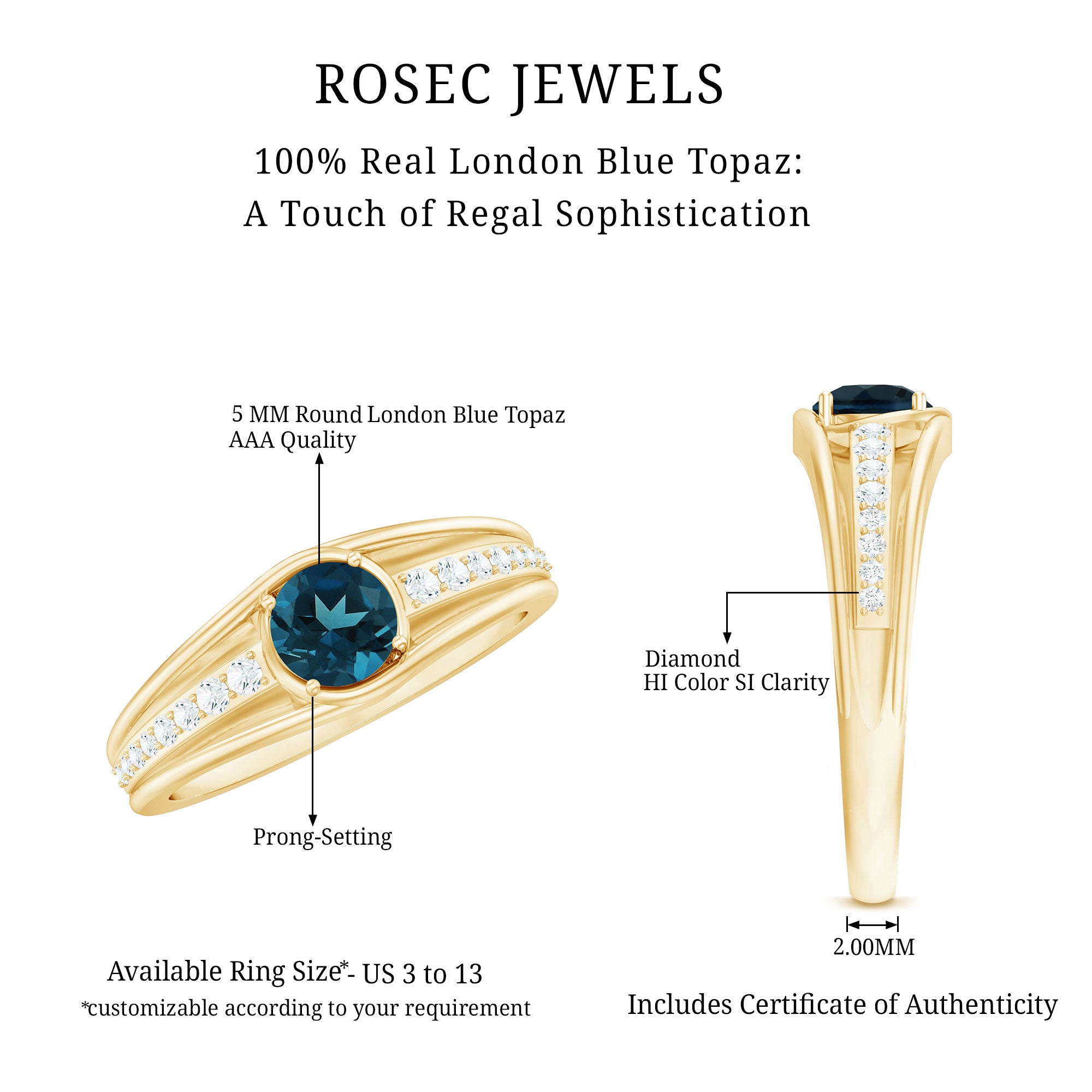 Looking for a ring that is simple, stylish, and full of meaning? This London Blue Topaz Engagement Ring checks all the boxes. It is embellished with a 5 MM round cut London Blue Topaz, held in secure prong setting. The topaz is the star of the show, but the small round diamonds on the sides add that extra shine to complete the look. Whether you are buying it for yourself or for someone special, this Blue Topaz and Diamond Ring is easy to wear every day and still feels elegant enough for important occasions. It is that kind of piece that never goes out of style because of its simple, pretty, and meaningful design. The combination of the blue topaz and diamonds gives it a contrasting feel that is perfect for someone who appreciates beauty in the little things. Crafted with care using AAA quality London Blue Topaz and HI-SI quality diamonds, this Engagement Ring with Side Stones is built to last. It is available in a wide range of sizes, so you will find the perfect fit. Plus, it comes with a certificate of authenticity for the gemstone, so you can feel confident about your choice.