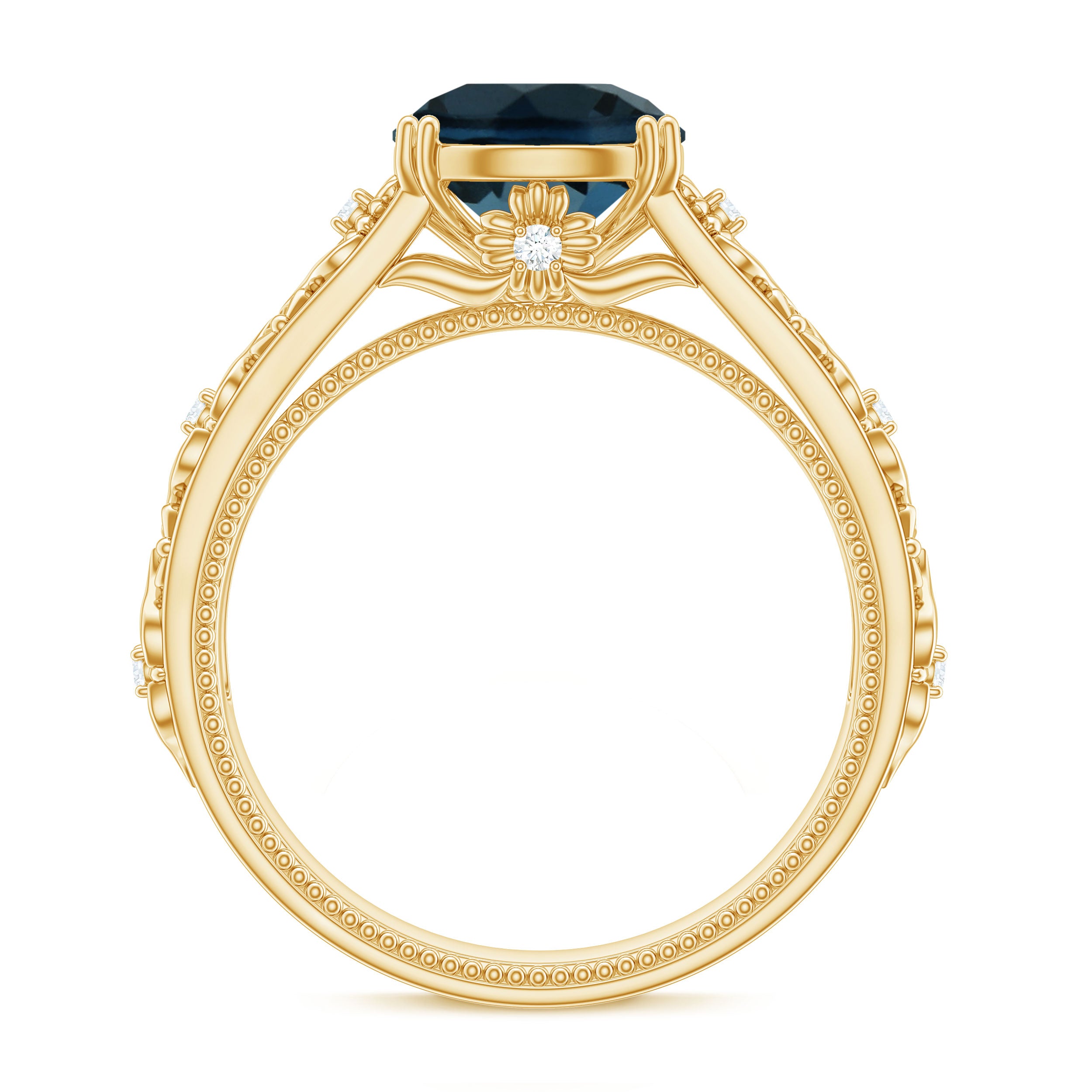 This London Blue Topaz Engagement Ring is an exceptionally unique piece, crafted to enchant with its nature-inspired elegance and brilliant shine. At its core lies an 8 MM round cut London Blue Topaz, securely set in a classic double prong setting as a timeless solitaire. Surrounding this centerpiece are intricate floral engravings along the band, embellished with small Diamond stones that contribute an elegant shimmer and a hint of vintage allure. The Solitaire Engagement Ring showcases exquisite beaded detailing that enhances its graceful aesthetic, while a hidden flower motif beneath the central stone reveals a sparkling peek-a-boo stone - introducing a delightful touch of brilliance without overshadowing the stunning solitaire. Designed for those who appreciate nature and everlasting romance, this Vintage Style Ring harmoniously merges soft floral motifs with radiant sparkle. The AAA quality London Blue Topaz and HI-SI quality Diamonds reflects light beautifully, symbolizing love, commitment, and treasured memories. Ideal for brides seeking something distinctive yet timeless, this Nature Inspired Engagement Ring intertwines romance, sophistication, and a touch of old-world charm. It is a significant piece she will cherish eternally, a true homage to love in every intricate detail.