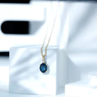 Create a memorable experience with this classic London Blue Topaz Pendant, designed to captivate every womans heart. This elegant Solitaire Pendant Necklace features a beautiful 8X10 MM london blue topaz, complemented by a delicate round cut moissanite positioned above the main gem. The Oval Pendant Necklace comes with a matching cable chain that secures with a lobster clasp, making it easy to adjust the length. The pendant bail has a rabbit ear design, adding a distinctive touch. The secure prong setting enhances the visibility of the stunning gemstone for everyone to see. The AAA quality blue topaz displays a captivating, deep blue color that shines brilliantly in the light. The simple yet sophisticated design of this Blue Topaz and Moissanite Necklace makes it perfect for any occasion, whether casual or formal. It is the perfect accessory to enhance any outfit with a touch of elegance. With its lasting design and classic appeal, it is sure to become a treasured piece for years to come.