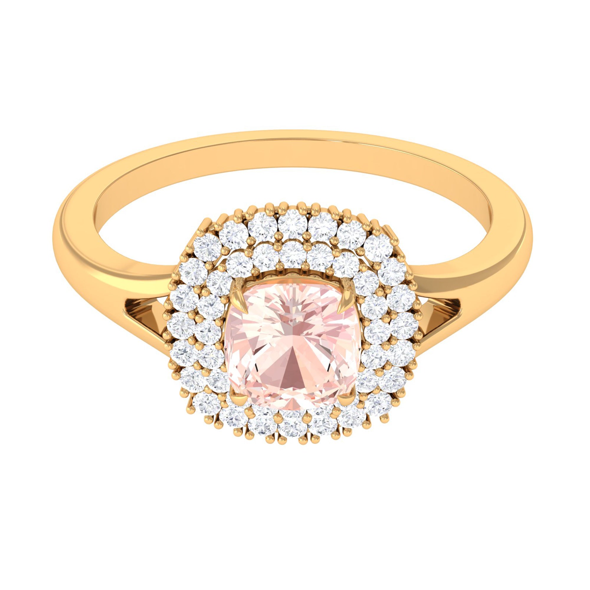 Celebrate the most special day of your life with grace and elegance by choosing our charming Engagement Ring. This exquisite ring features a mesmerizing Cushion Cut Morganite, securely held in a Claw Setting, and framed by a sparkling Diamond Halo. Its the perfect symbol of your love and commitment, destined to make your special day even more memorable.