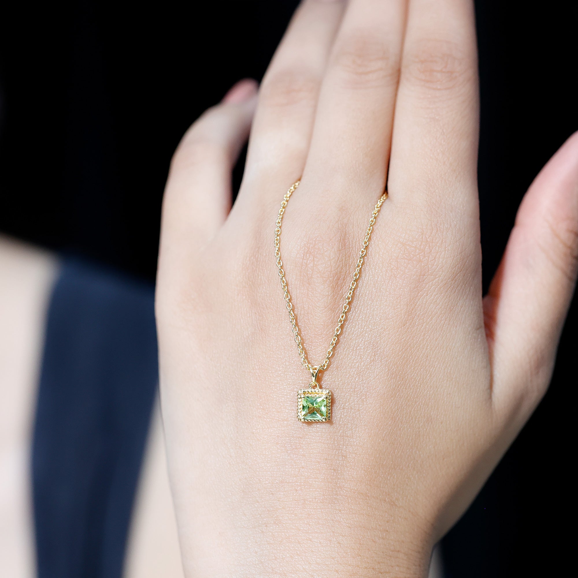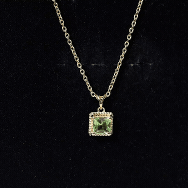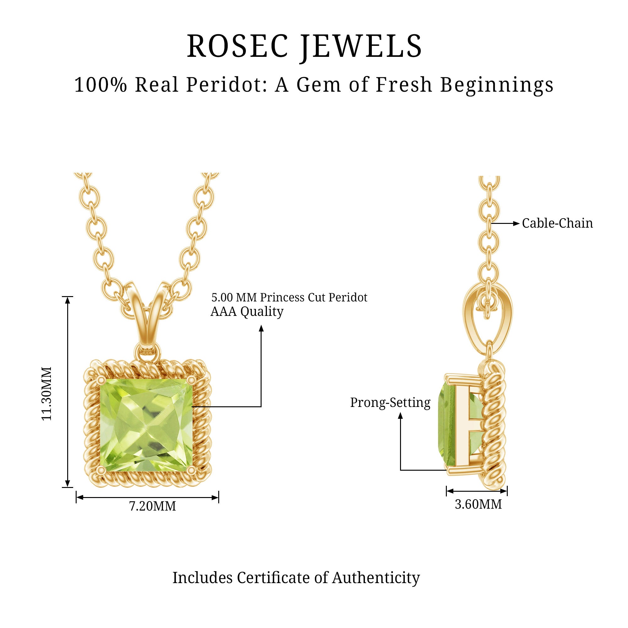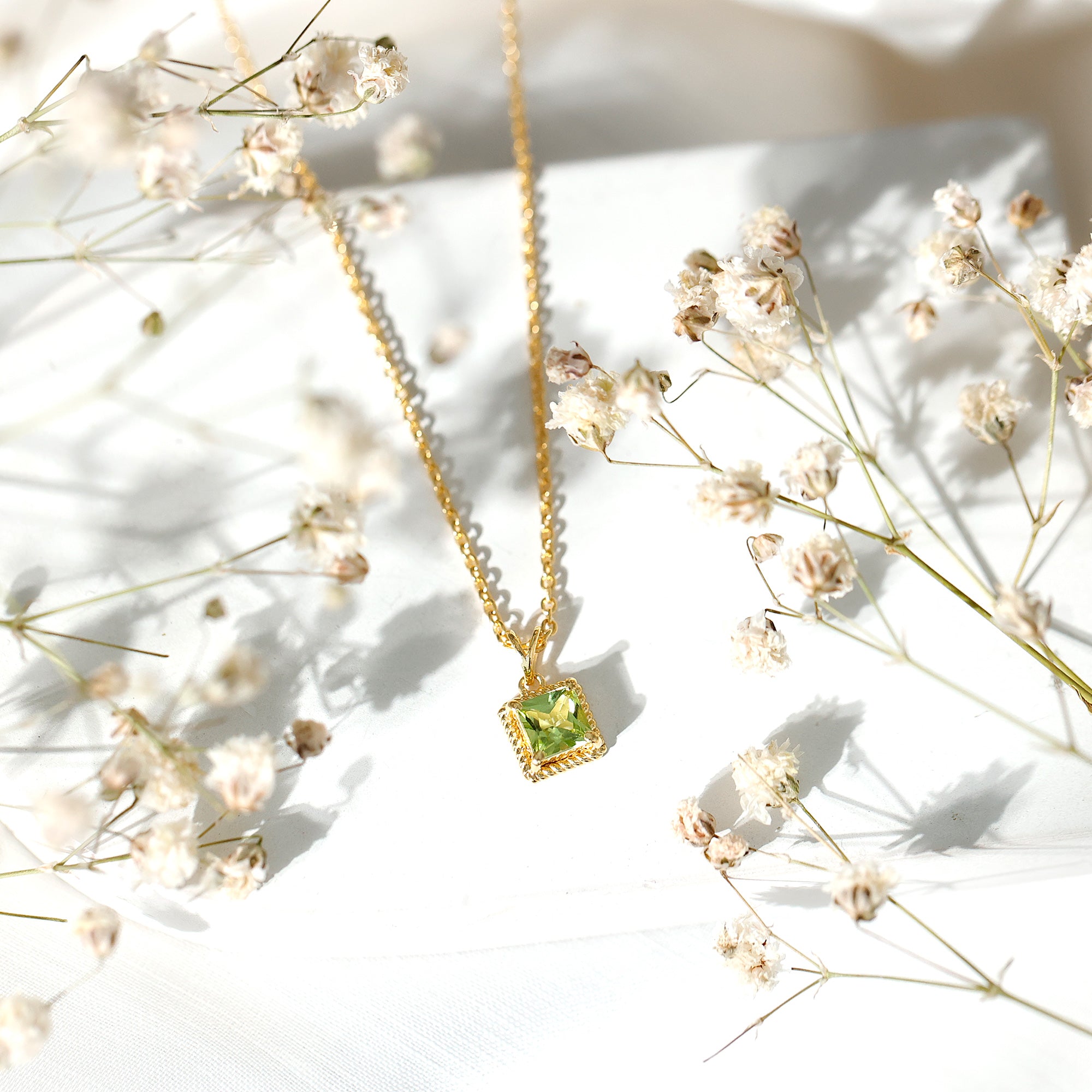 With a touch of minimal elegance, this Peridot Pendant Necklace effortlessly grabs everyones attention, sparkling with every little movement. Made from Yellow Gold Plated Silver, this pendant features 5 MM Princess Cut Peridot set in Prong Setting, complete with twisted rope details. Hanging from a strong cable chain, this Solitaire Pendant exudes a captivating charm that blends classic elegance with stunning beauty. Its majestic and refined design makes it an ideal choice for everyday wear or paired with an office outfit. It draws attention without being too much, and this graceful and feminine Princess Cut Necklace adds depth to its striking appearance. The royal glow of this August Birthstone Necklace speaks of sophisticated taste and is a timeless beauty investment. As a cherished piece destined to be part of your collection, it is perfect for celebrations, serving as a token of love or a personal declaration to be treasured and remembered for years to come. Whether worn as a symbolic piece or given as a heartfelt gift to someone who loves classic pieces of jewelry, this piece enhances the beauty of every moment. This Green Gem Necklace is accompanied by a certificate of authenticity for the gemstones and is presented in a premium quality signature jewelry box.