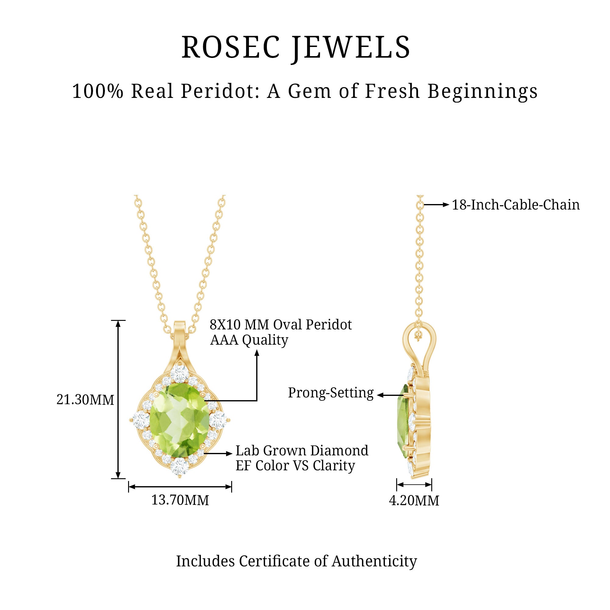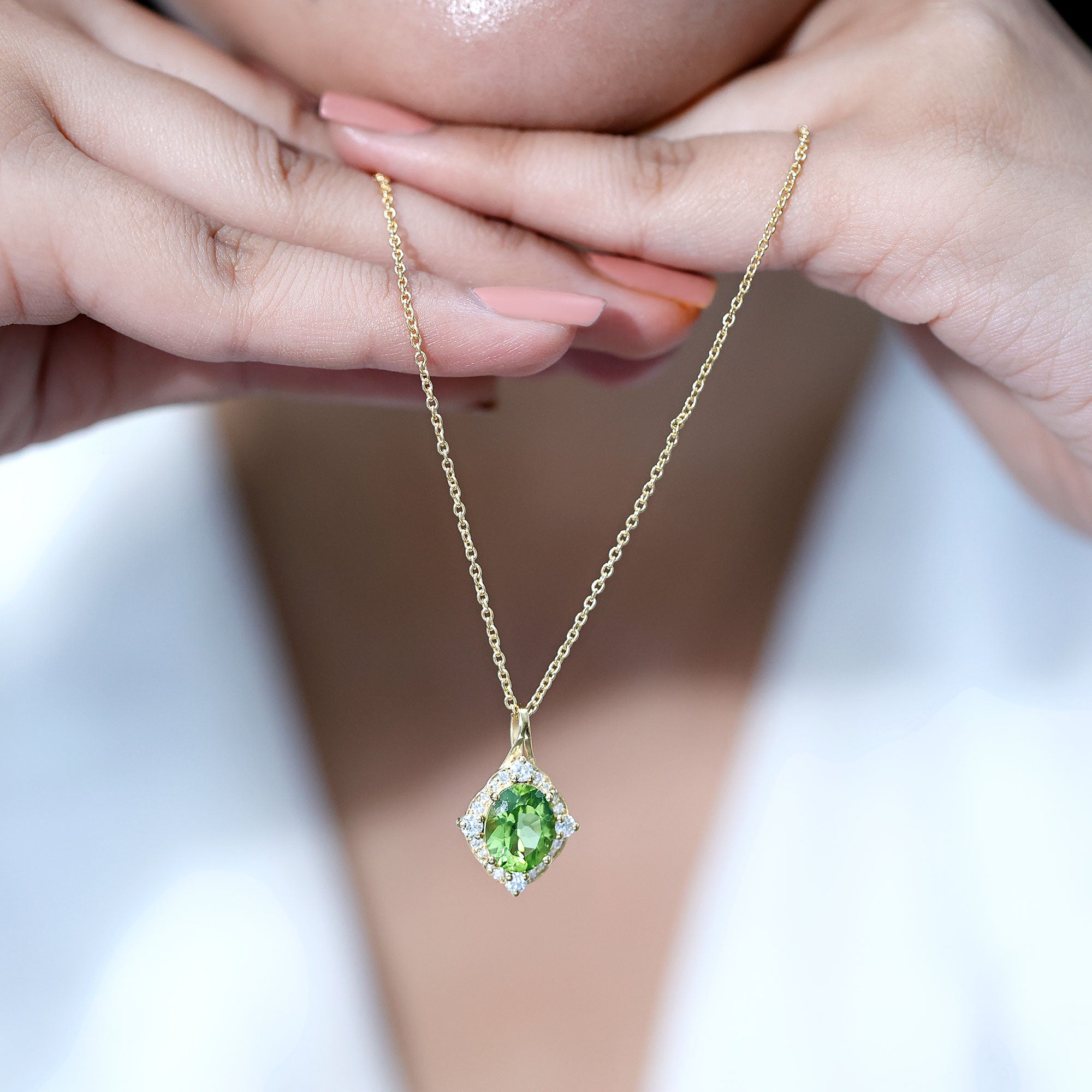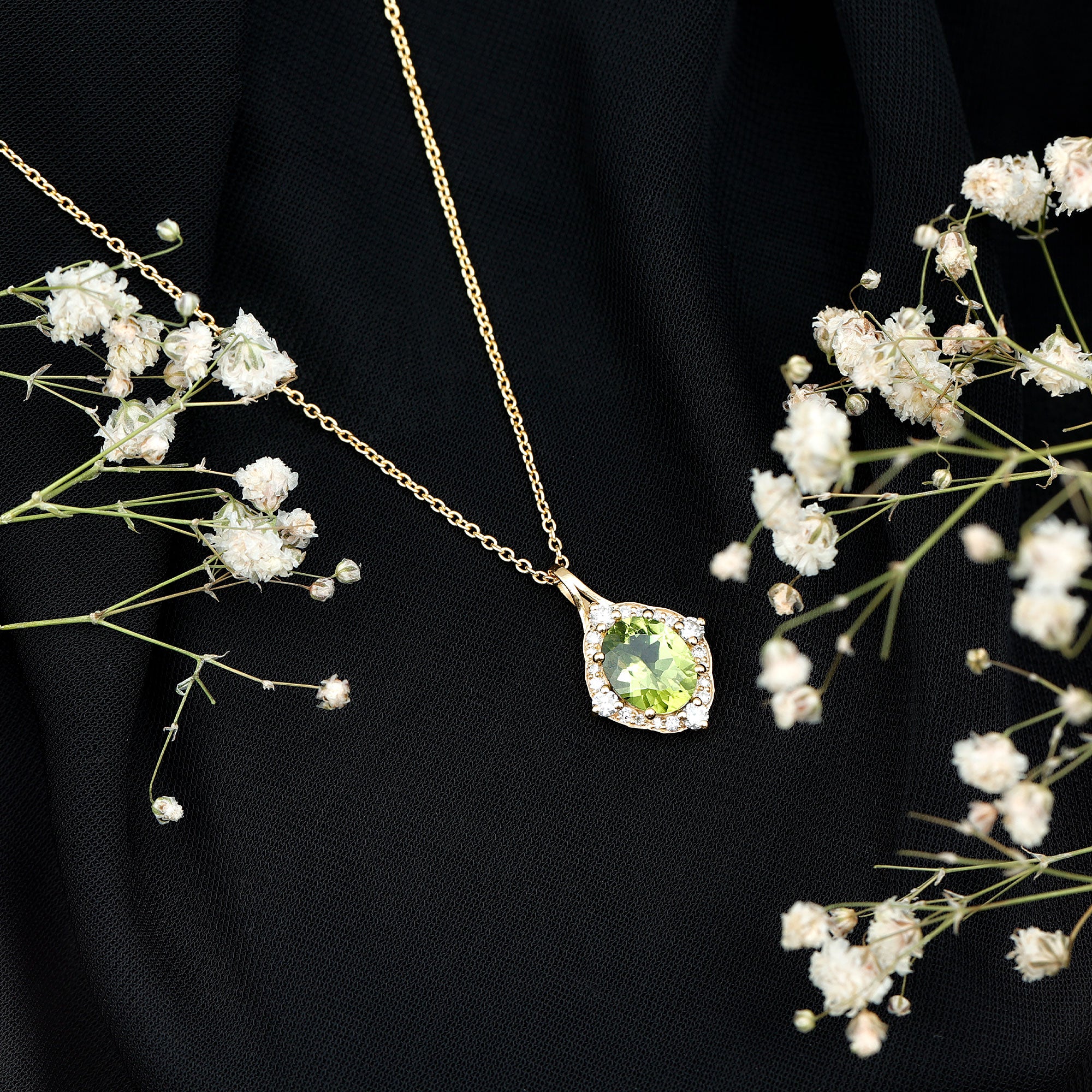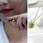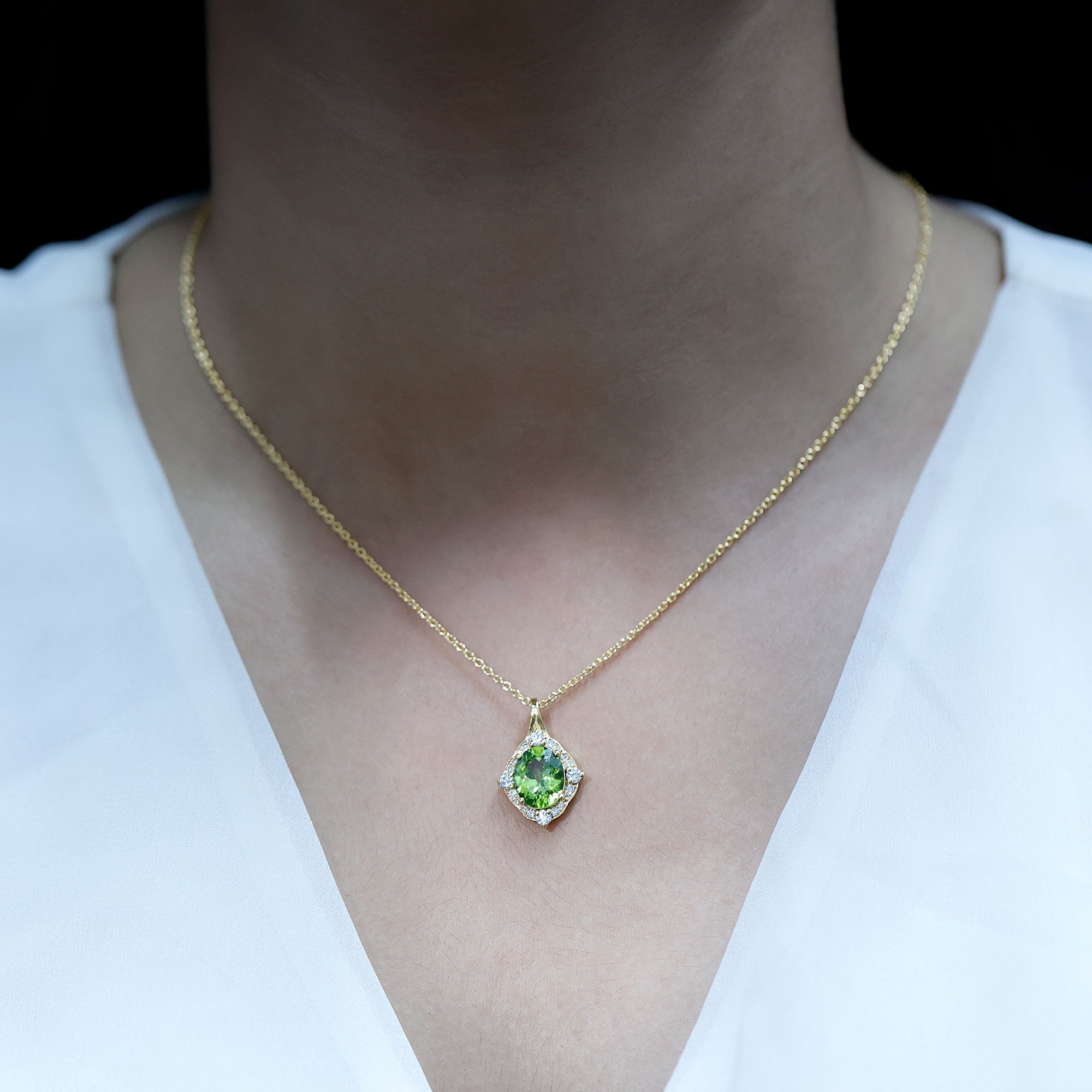Elevate your jewelry collection with this stunning Vintage Peridot Necklace. Crafted in 14K Yellow Gold Plated Silver, this elegant piece showcases a vivid 8X10 MM oval shaped Peridot at its center set in prong setting. The gemstone is beautifully framed by a sparkling halo of Round Brilliant Cut Lab Grown Diamonds, adding just the right amount of brilliance and vintage-inspired glamour. The rich contrast between the bright green Peridot and the shimmering EF-VS quality lab-grown diamonds makes this August Birthstone Necklace a true showstopper. Suspended from a matching cable chain, this Peridot Pendant Necklace offers both style and comfort, making it perfect for special occasions or everyday elegance. Whether you are dressing up for a romantic evening or gifting a loved one, this Peridot and Diamond Necklace brings beauty, meaning, and timeless appeal to any outfit.