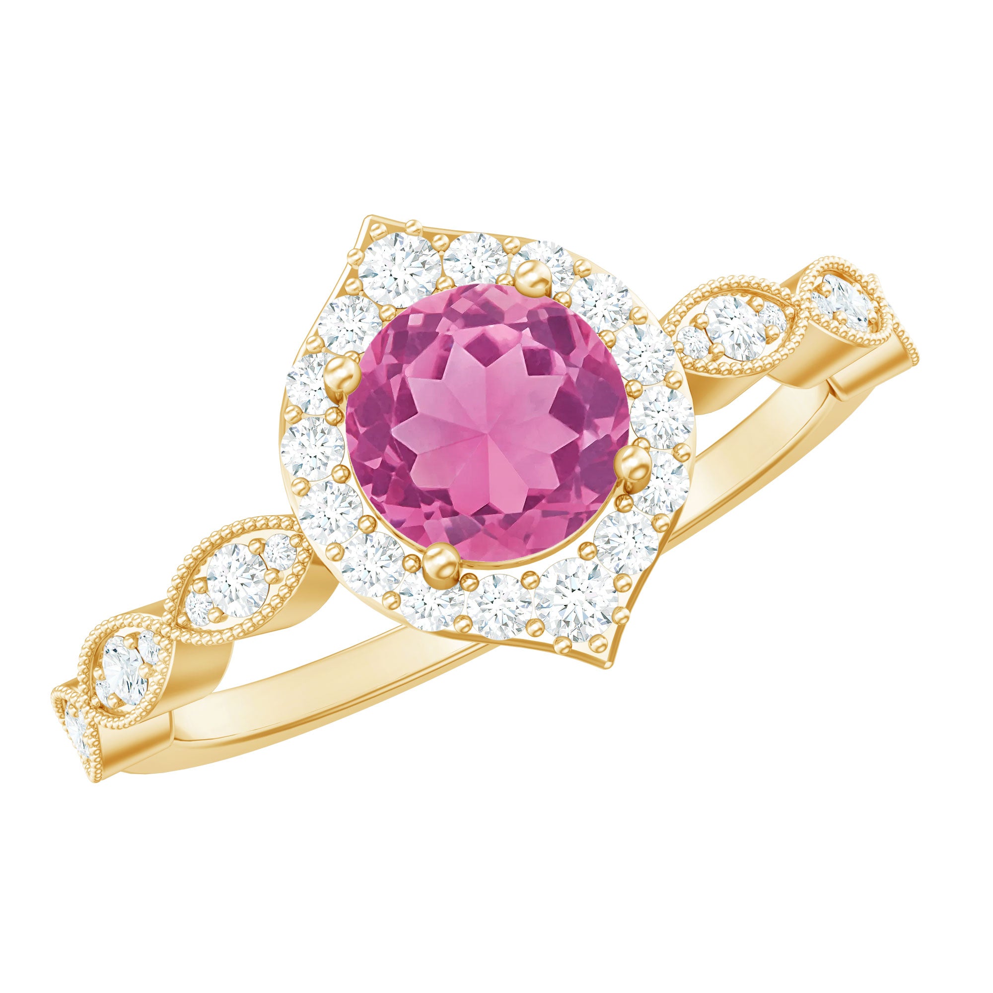 Romantic charm shines beautifully in this Pink Tourmaline and Diamond Ring, which is built to capture the heart at first glance. At the center of this Vintage Inspired Engagement Ring sits a glowing 7 MM round cut pink tourmaline, held securely in prong setting. Surrounding the center stone is a delicate halo of tiny diamonds shaped like a petal, giving the Pink Tourmaline Engagement Ring a graceful touch that feels both classic and dreamy. The beauty continues along the band, where small diamonds are set in marquise-shaped frames, creating a scalloped pattern that adds depth and elegance. Every detail is crafted to blend vintage style with everyday comfort, making the Antique Tourmaline Ring feel special while still being easy to wear. The gentle curves, fine metalwork, and bright stones come together to form a piece full of personality and warmth. It symbolizes love, kindness, and emotional connection, making it perfect for a promise of forever. Offered in a range of sizes and complete with a certificate of authenticity, the ring is ready to become a treasured part of your story.