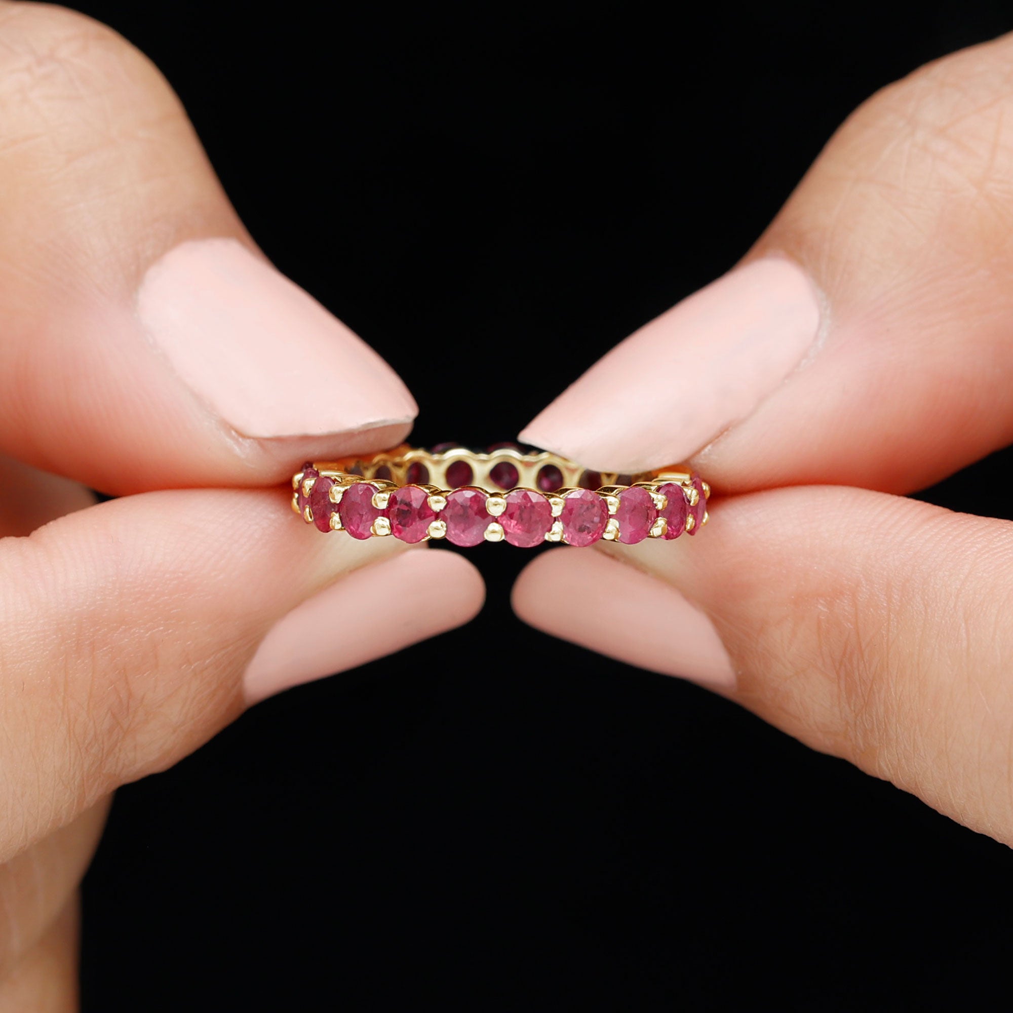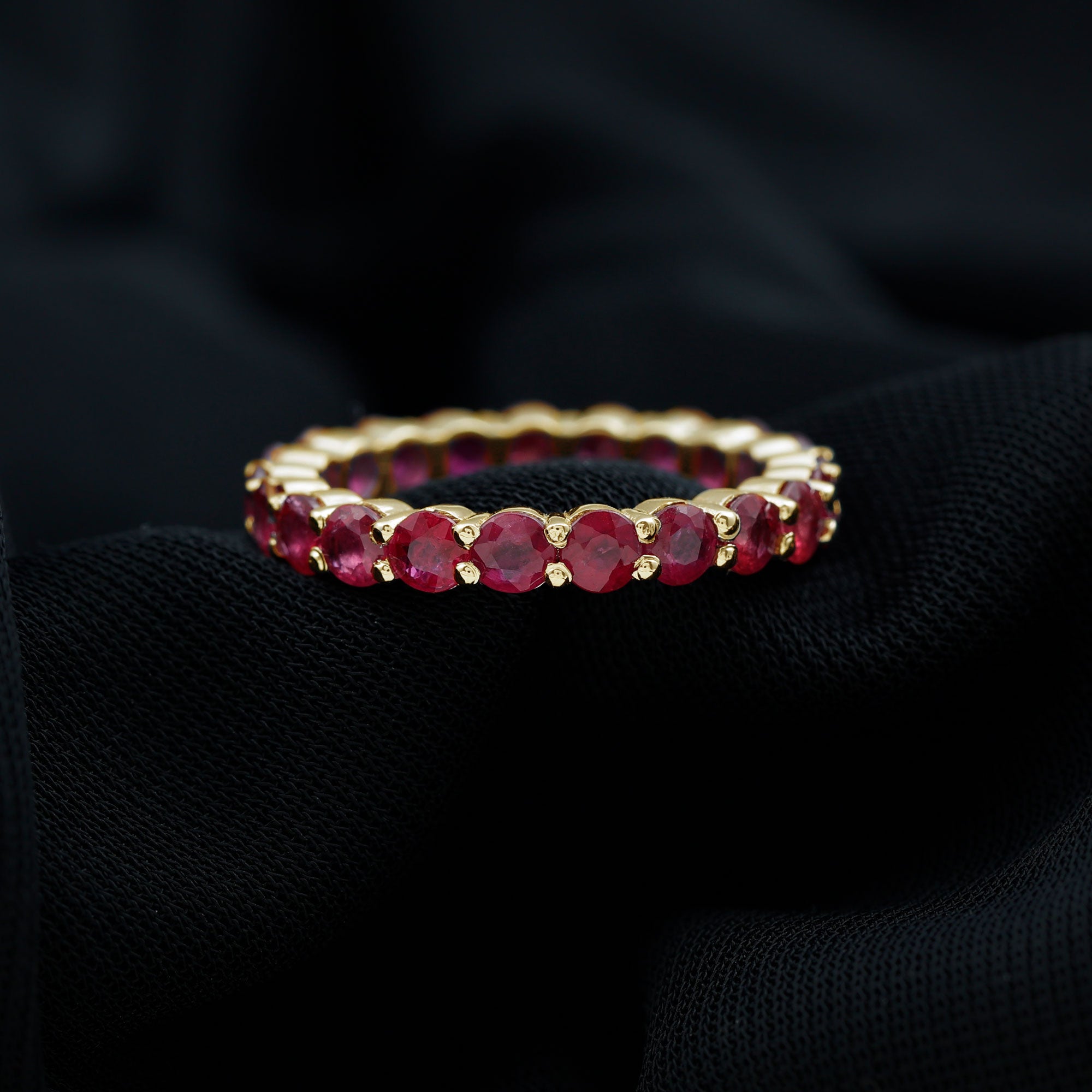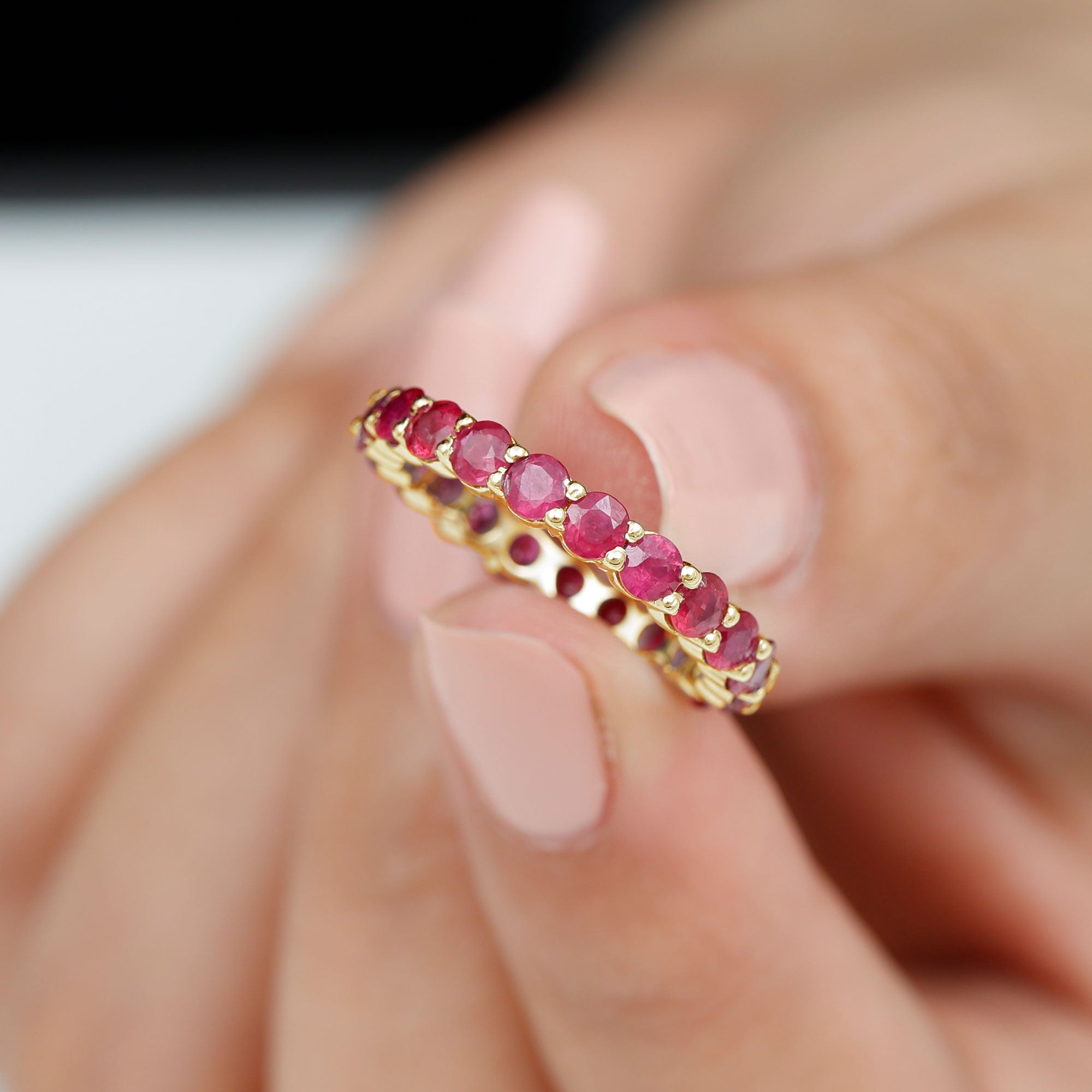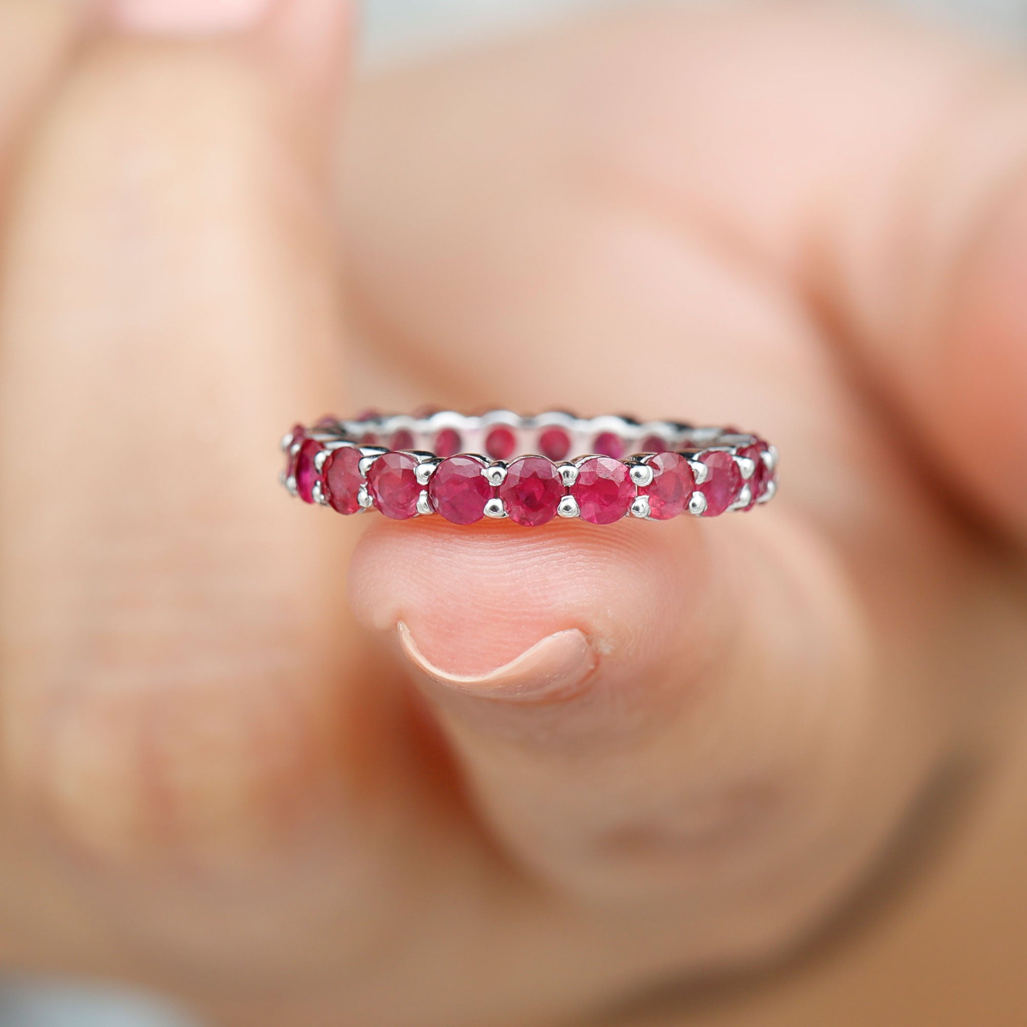 Express your emotion and surprise her with this exquisite Ruby Eternity Ring that will surely get more attention. This ring features 3 MM round Red Ruby encased in shared prong setting, making this piece more attractive and appealing to look at. If you want to make her surprised then this ring is just the perfect option for you. You can give this ring to your partner as it fits well on any occasion.