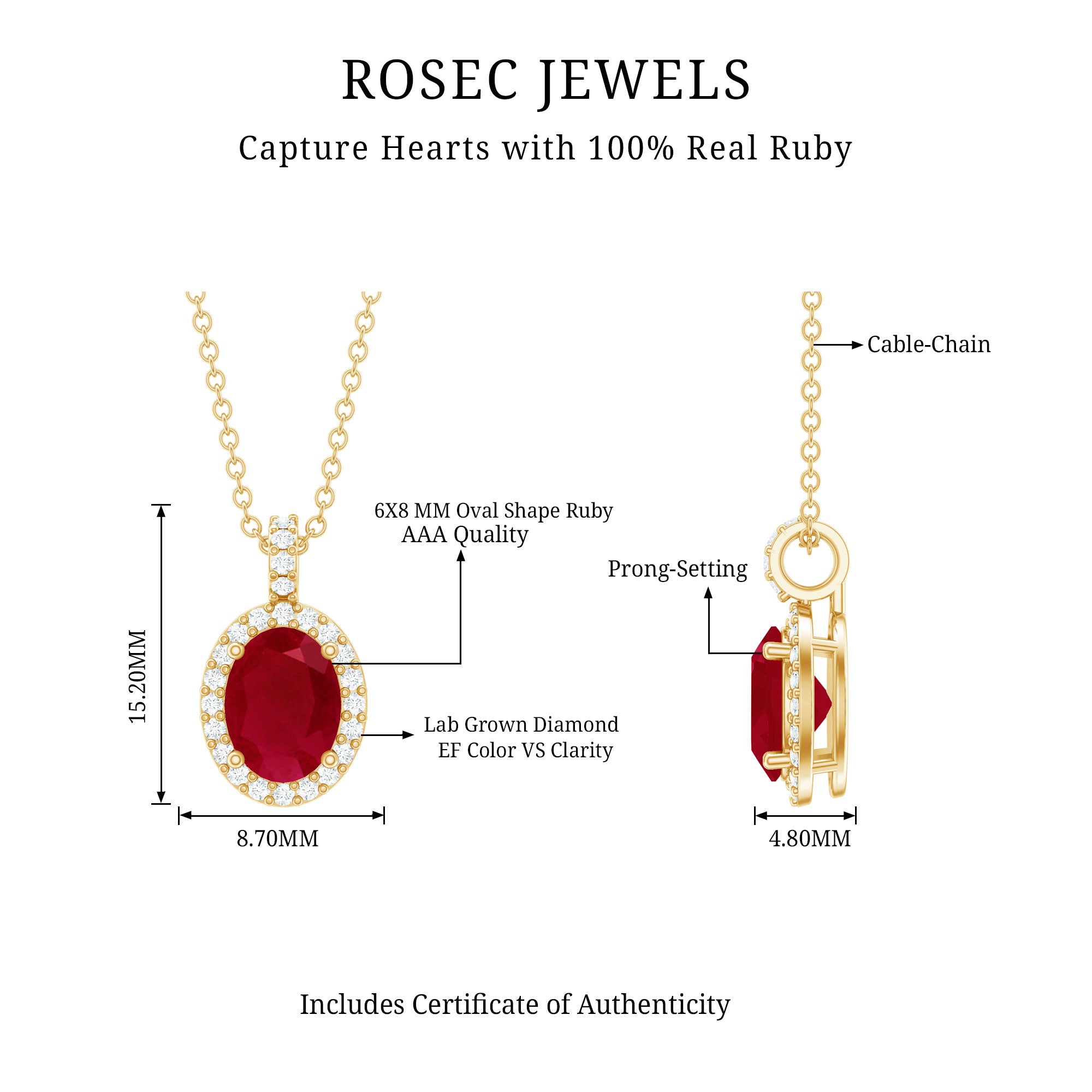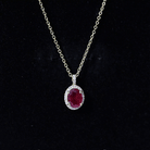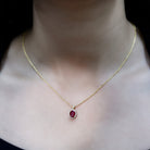 Timeless and elegant, this Ruby Pendant Necklace is a beautiful balance of classic design and modern craftsmanship. Crafted in 14k yellow gold plated silver, this piece brings a sophisticated charm to your everyday style or special moments. At the heart of the pendant lies a 6X8 MM oval cut ruby, held securely in prong setting. Framing the center stone is a halo of round EF-VS quality lab grown diamonds, adding a touch of brilliance without overpowering the design. The diamonds continue onto the bail, offering a seamless sparkle from top to bottom and giving the Oval Pendant a refined, finished look. The Ruby Halo Necklace is suspended from a sleek and durable chain that drapes comfortably across the neckline. Whether layered with other pieces or worn solo, it brings a graceful pop of charm to any outfit. The AAA quality ruby adds a touch of richness to the look, while the gold tone brings warmth and depth. Ideal for gifting or treating yourself, this Ruby and Diamond Necklace is a perfect pick for birthdays, anniversaries, or milestones worth remembering. It is a piece that feels both personal and timeless, easy to wear, hard to forget.