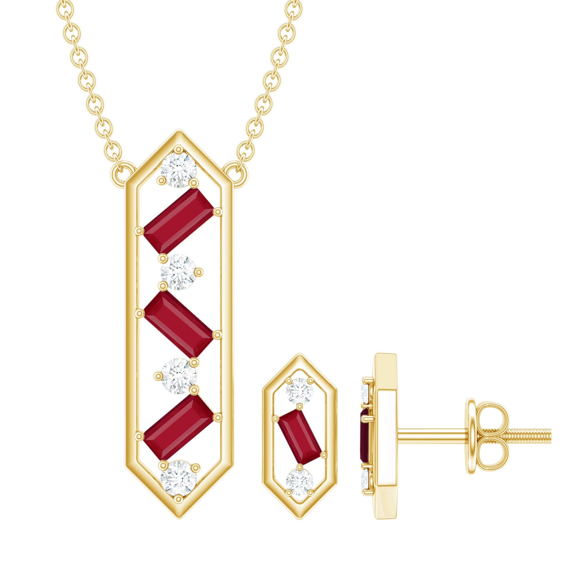 Make a stylish statement with this Contemporary Jewelry Set. Featuring stunning baguette cut Ruby stones paired with round Diamond stones set in prong setting in the center of an open hexagon shaped bar, this Necklace and Earrings Set offers a modern take on classic jewelry styles. The elongated design adds movement and elegance to the pieces, making them the most suitable choice for any special occasion. Add this Ruby and Diamond Necklace Set to your jewelry collection for sophistication and luxury. The necklace hangs from a delicate cable chain that is both strong and stylish, while the earrings come with secure screw back closures, so you can wear them comfortably all day long. This Geometric Pendant and Earrings is perfect for women who love simple yet striking pieces of jewelry. Presented in a signature jewelry box, making it a thoughtful and personal surprise that is ready to gift.