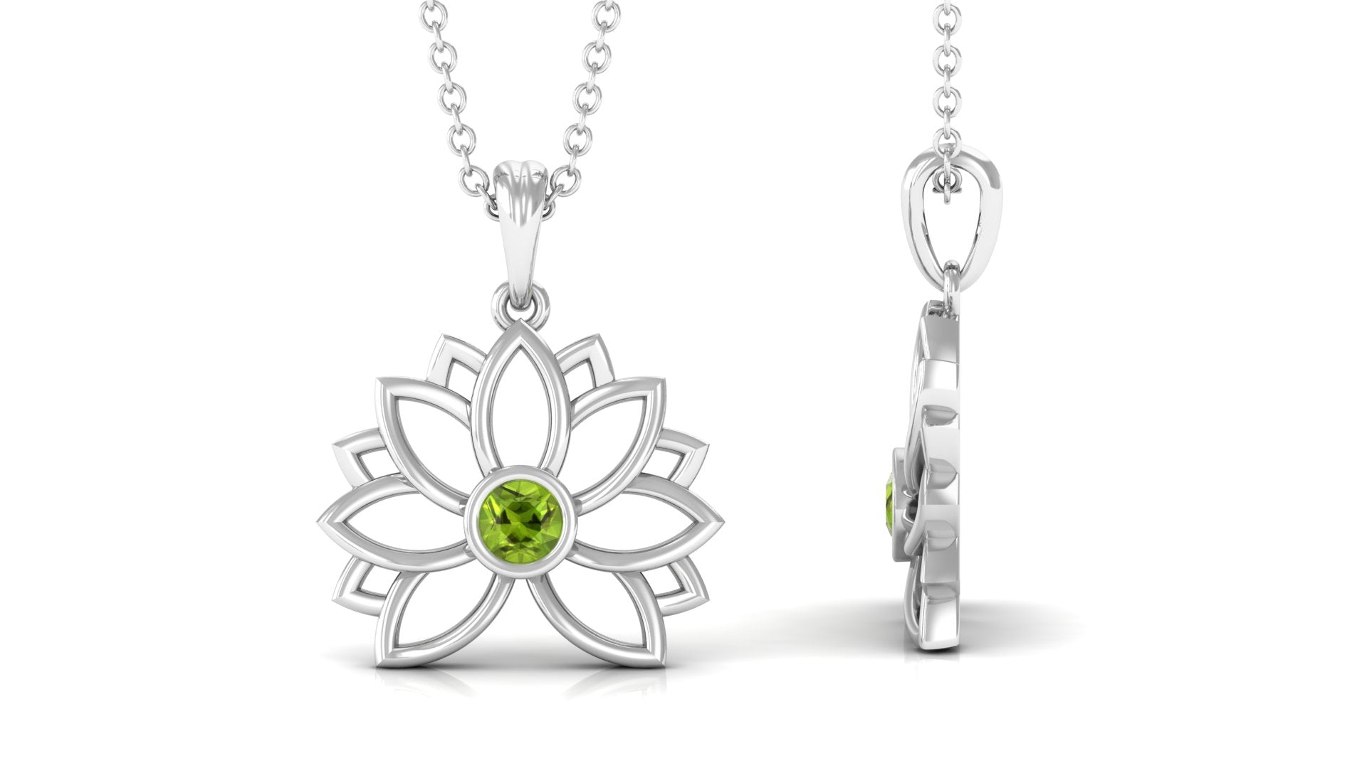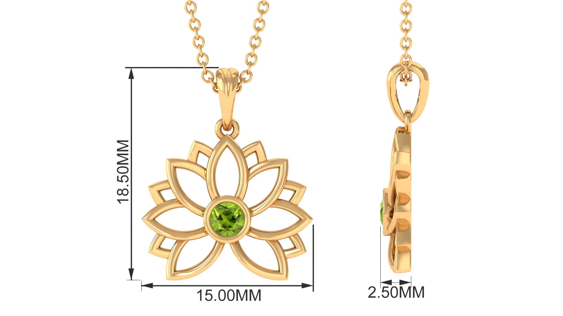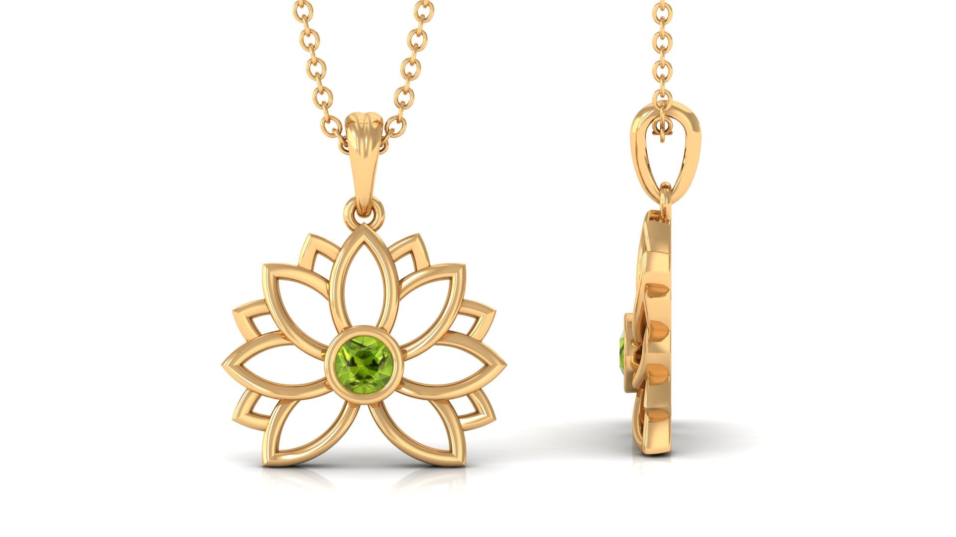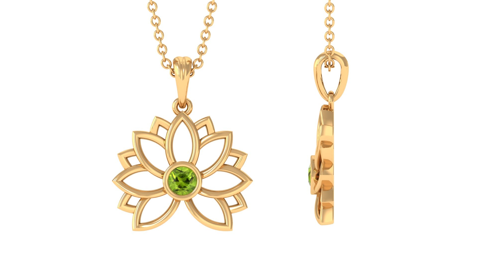 Lotus Pendant has stunning Round Solitaire Peridot stone encased in bezel setting to enhance the beauty of Floral Charm Necklace. 14K Solid Gold is used to craft this enchanting piece. Stack it or wear alone for statement look.