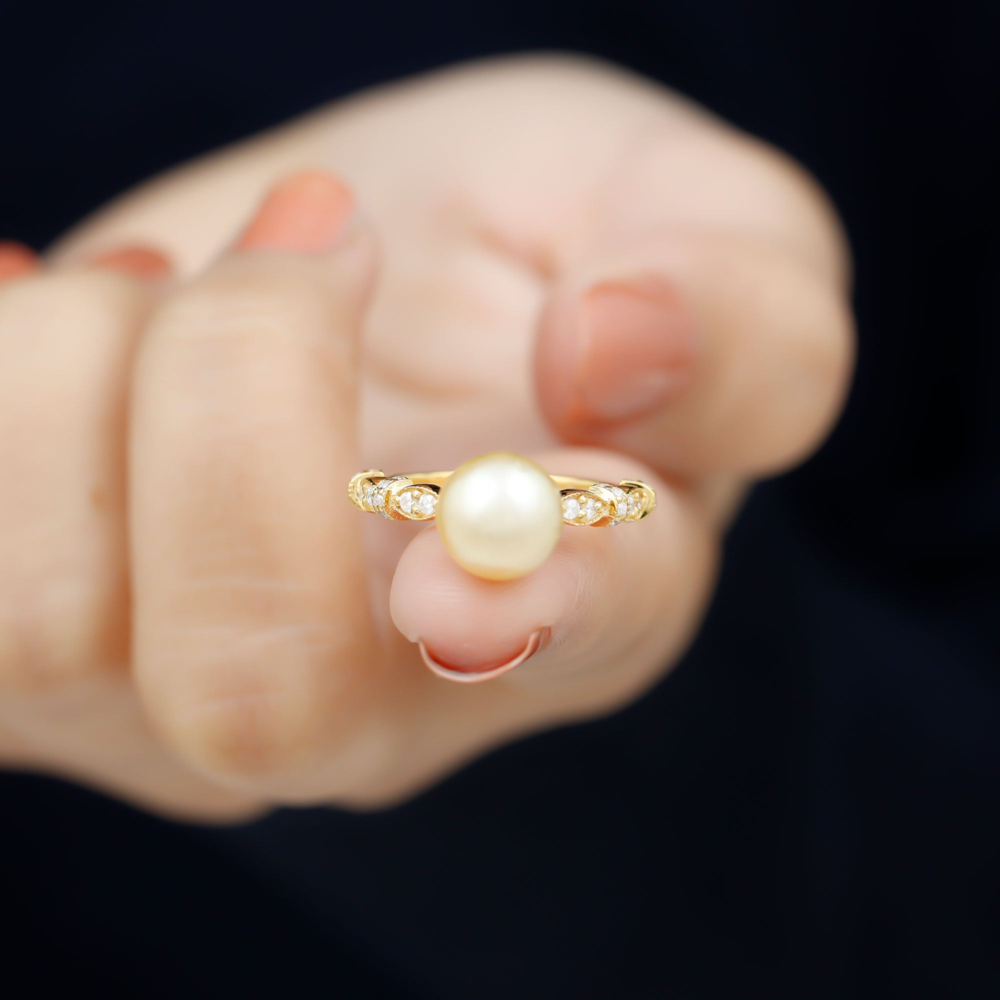 The scintillating Golden South Sea Pearl looks captivating, and round Diamond is held as side stones. This Pearl Engagement Ring is accentuated with beaded details. Illuminate your character with this Golden South Sea Pearl Engagement Ring and flaunt it your way.