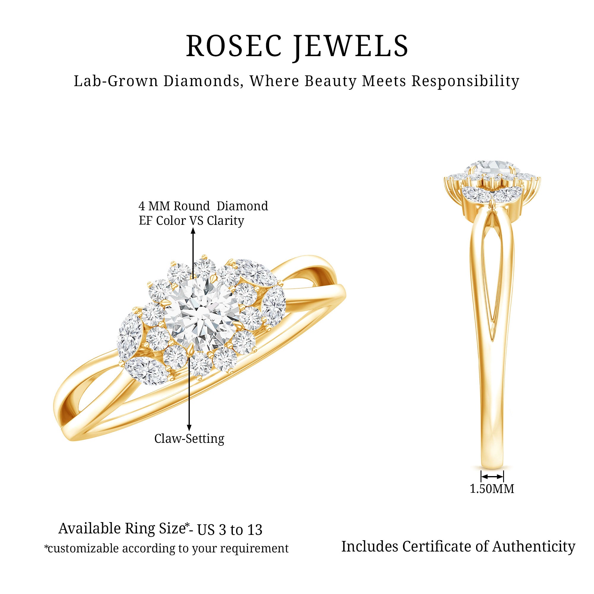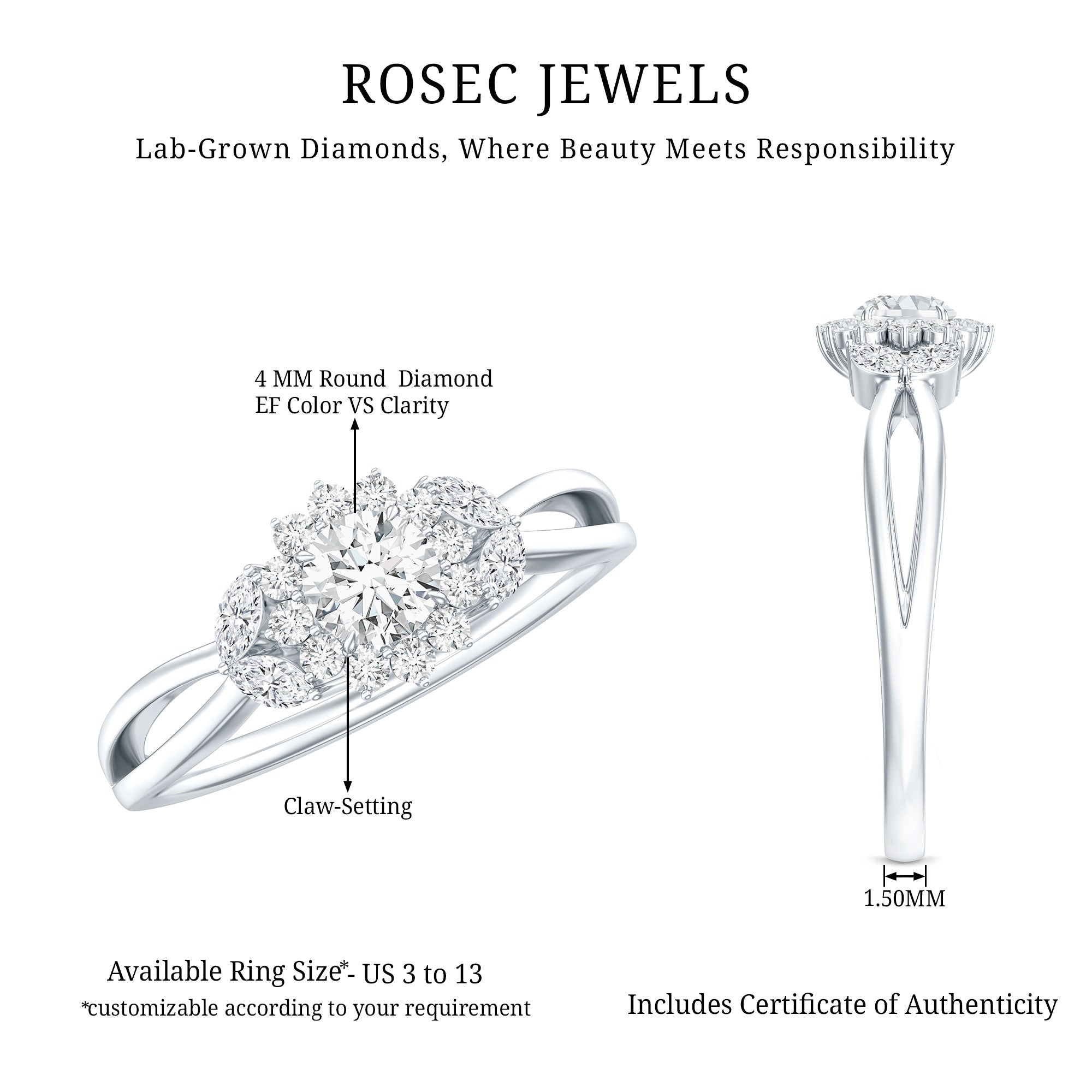 Show off the elegance of nature with this Lab Grown Diamond Engagement Ring, which perfectly reflects your style and is genuinely inspired by the beauty of nature. This delicate and elegant piece of jewelry is like a dream come true, taking cues from natures charm to create a feminine aesthetic. The lovely ring features a 4 MM Round Shaped Lab Created Diamond set in Claw Setting. The Round Diamond Halo, along with additional Marquise Cut Stones, gives it a look reminiscent of a delicate leaf, complemented by a split shank. This Diamond Flower Engagement Ring is crafted with meticulous attention to detail, showcasing a floral design. The intricate details combined with an effortless style make the Diamond Halo Ring a perfect choice, capturing the enchanting sentiments associated with each bloom while celebrating natural vibrancy. The EF Color VS Clarity lab-grown diamond offers a unique range of styles to elevate your look. Beautifully presented in a signature jewelry box, this Split Shank Engagement Ring is ready to be gifted and even more ready to be treasured. Let your love shine with a sparkle that is gentle on the planet and perfect for your happily ever after.