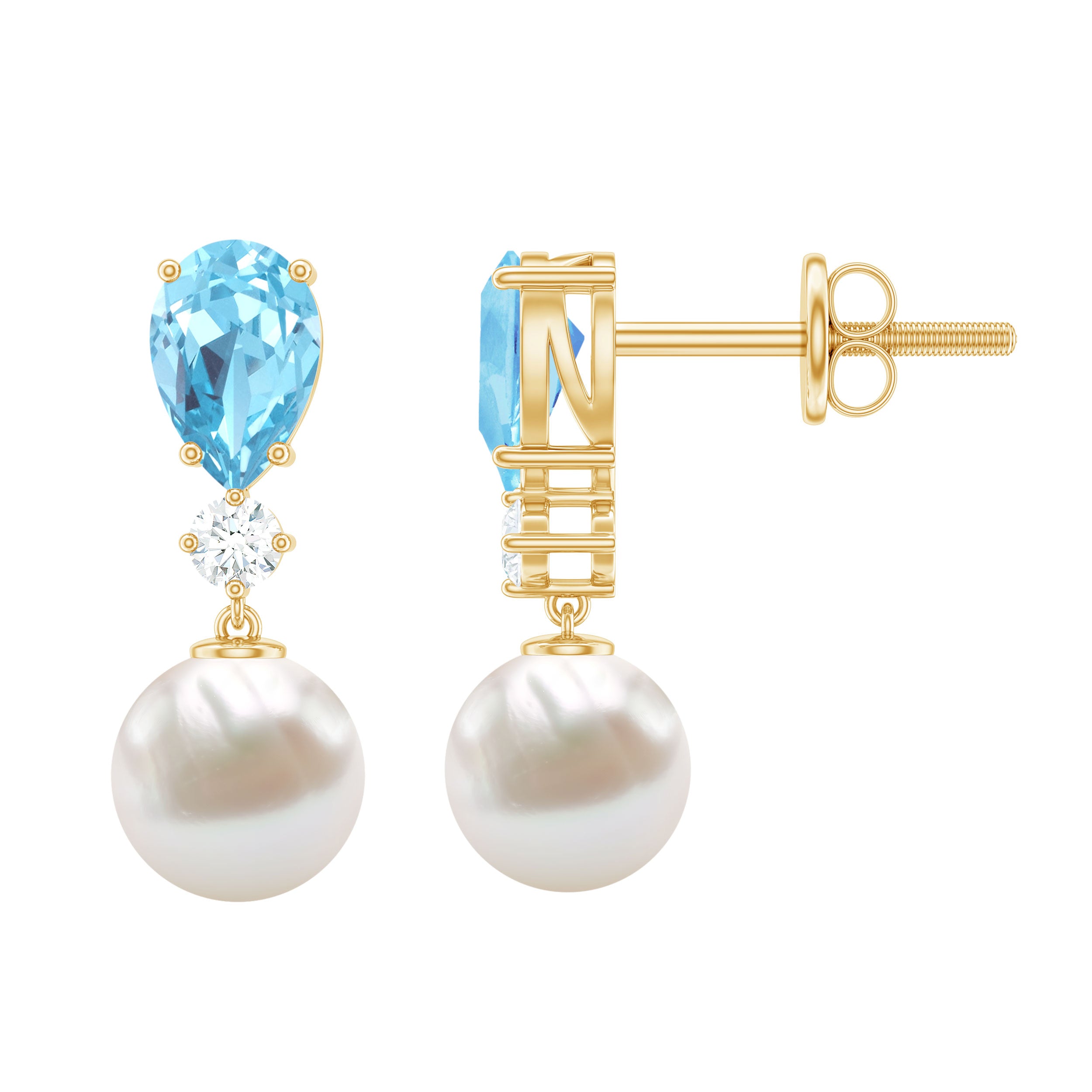 Looking for a perfect earring that suits well with all your outfits, you got covered with these Pearl Drop Earrings. These earrings feature a 4X6 mm Pear Shape Aquamarine securely placed in Prong Setting at the top. A 6 MM Round Shape Freshwater Pearl dangles and giving it a mesmerizing look. The Moissanite sparking from the center enhances the overall look of these Pearl Drop Earrings. These Pearl Aquamarine Earrings are designed to evoke the tranquility of the ocean and the elegance of nature. These Real Pearl Earrings are the perfect blend of sophistication and timeless beauty. Capture attention with the understated luxury and oceanic allure with AAA Quality Pearl and Aquamarine.