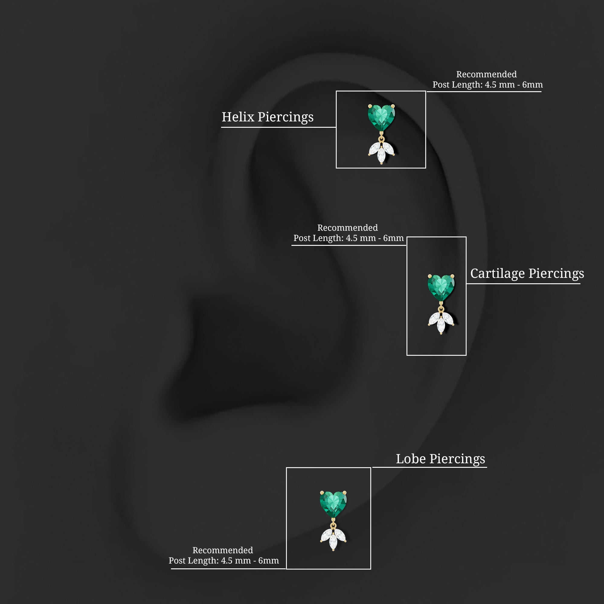 The Helix Drop Earring is a stunning piece of jewelry that combines elegance and romance. The Heart Shape Lab Created Emerald is perfectly complemented by the sparkling Marquise Cut Moissanites, creating a look thats both sophisticated and eye-catching. Wear it on your Helix, Cartilage, Tragus, or Upper Lobe Piercing and create mesmerizing looks.