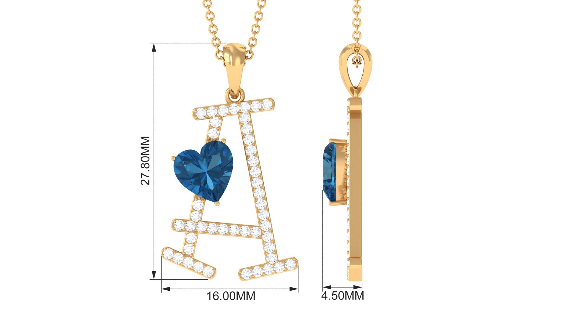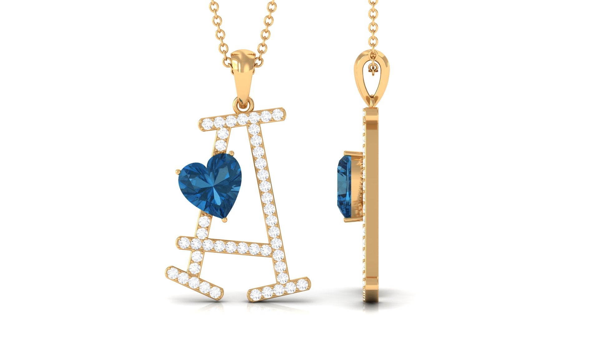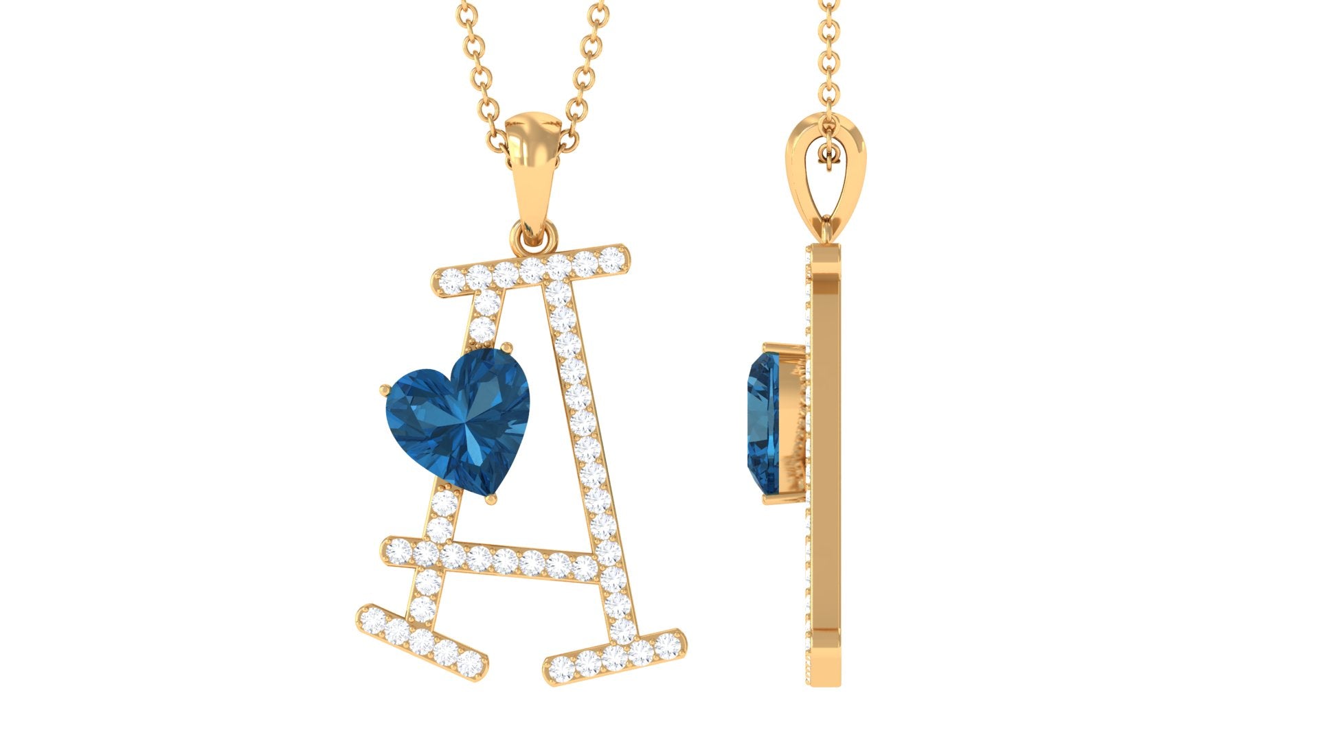 Elevate your style with our one-of-a-kind Statement Letter A Pendant, adorned with a heart-shaped London Blue Topaz set in a three-prong arrangement with dazzling Diamond accents. Meticulously crafted in solid gold, this A Initial Pendant makes for the perfect Valentines Day gift, a symbol of your affection that will be cherished forever.